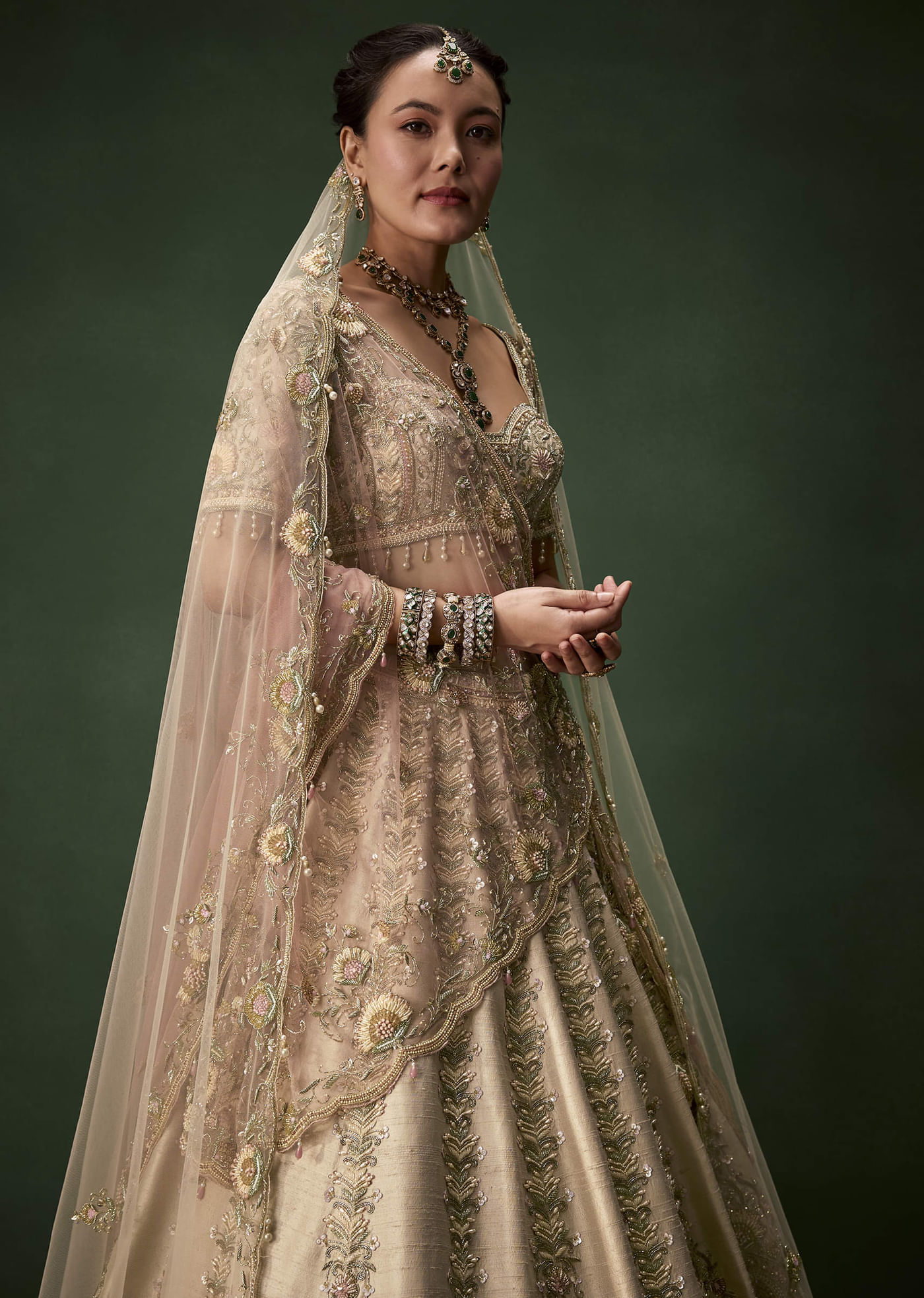 Beige Gold Bridal Raw Silk Lehenga Set with Two Dupattas
