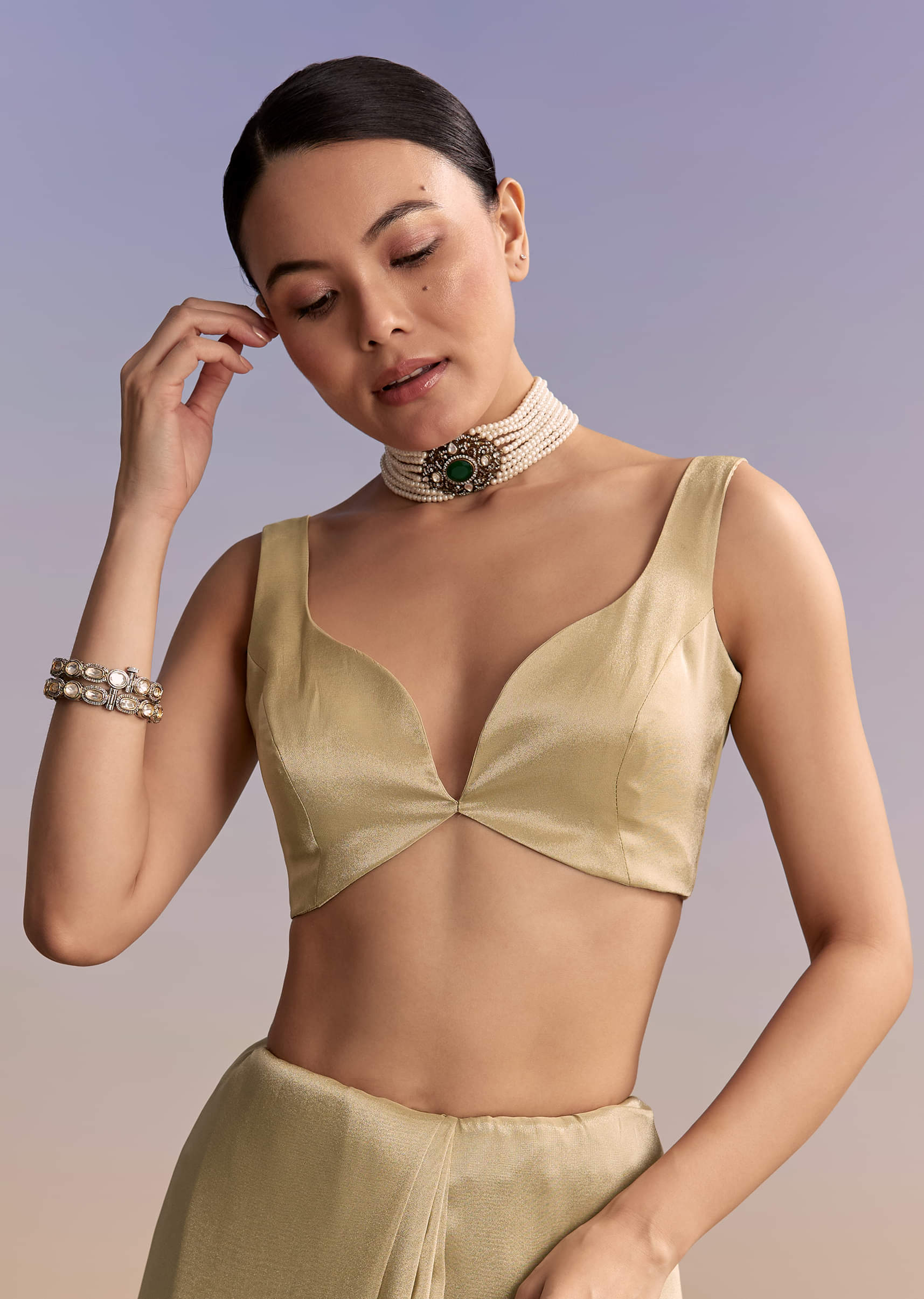 Understated opulence comes through as this beige gold tissue embroidered saree takes shape. A heavy scallop border and blouse buttis are embroidered with zardosi, cutdana, sequins, stones, and green and... More Product Details