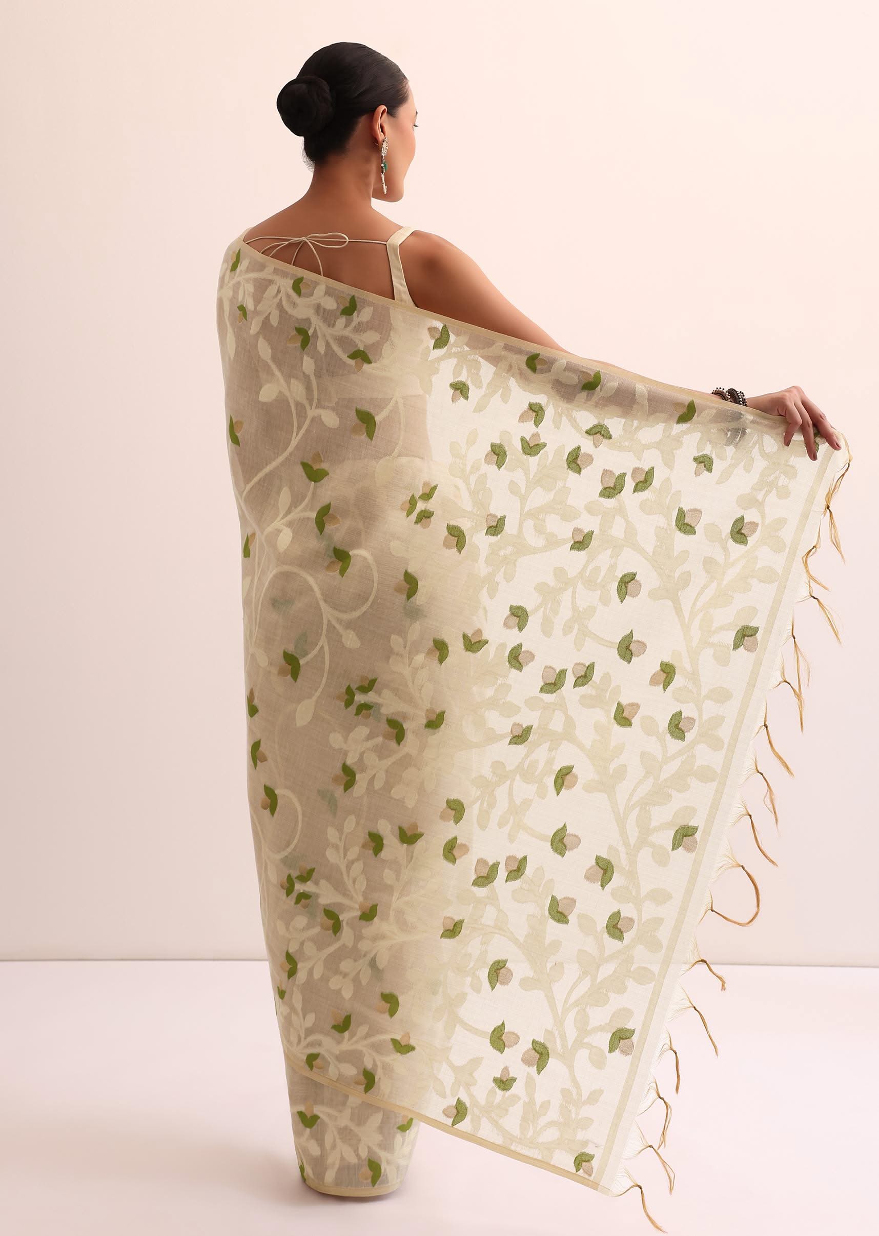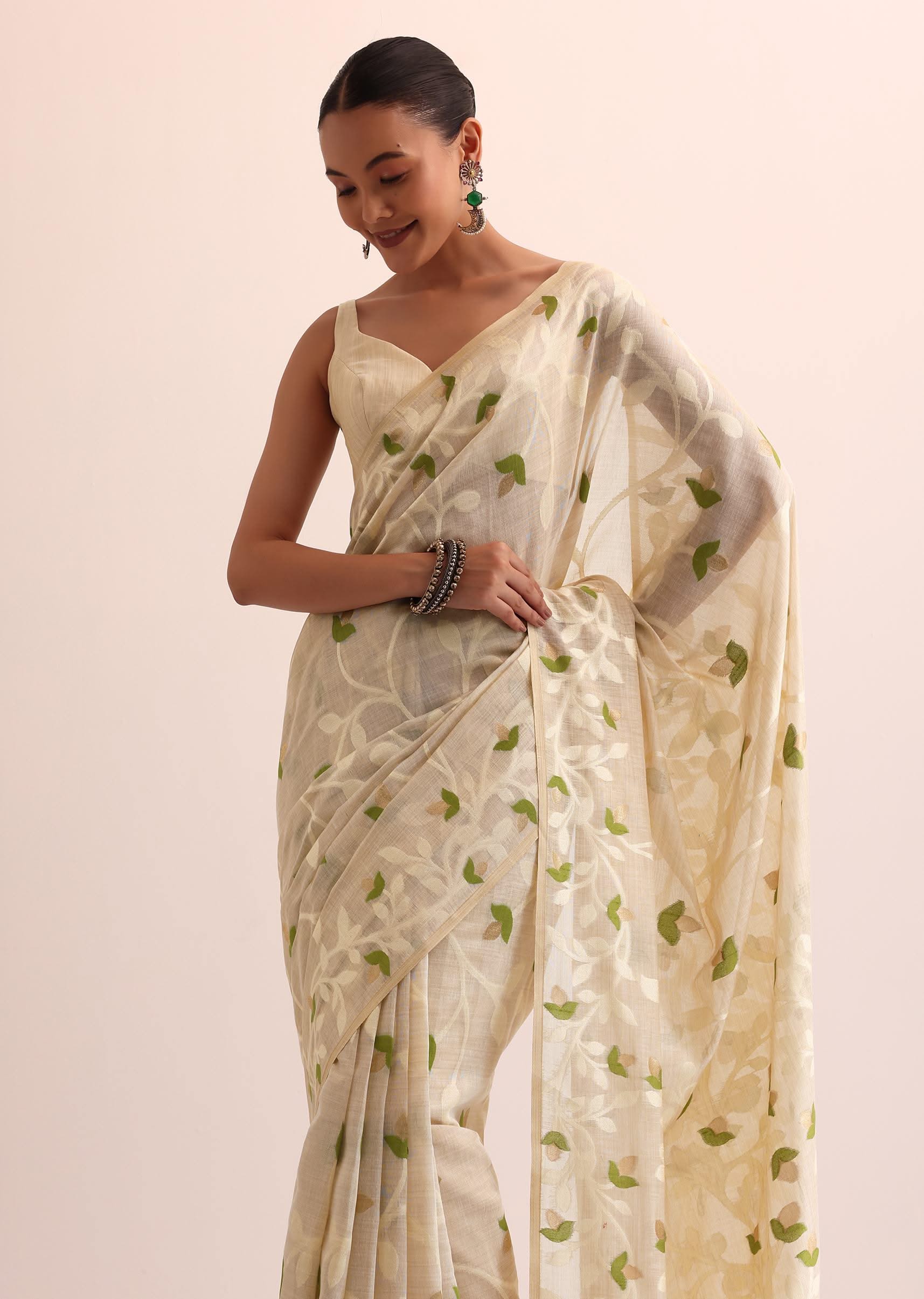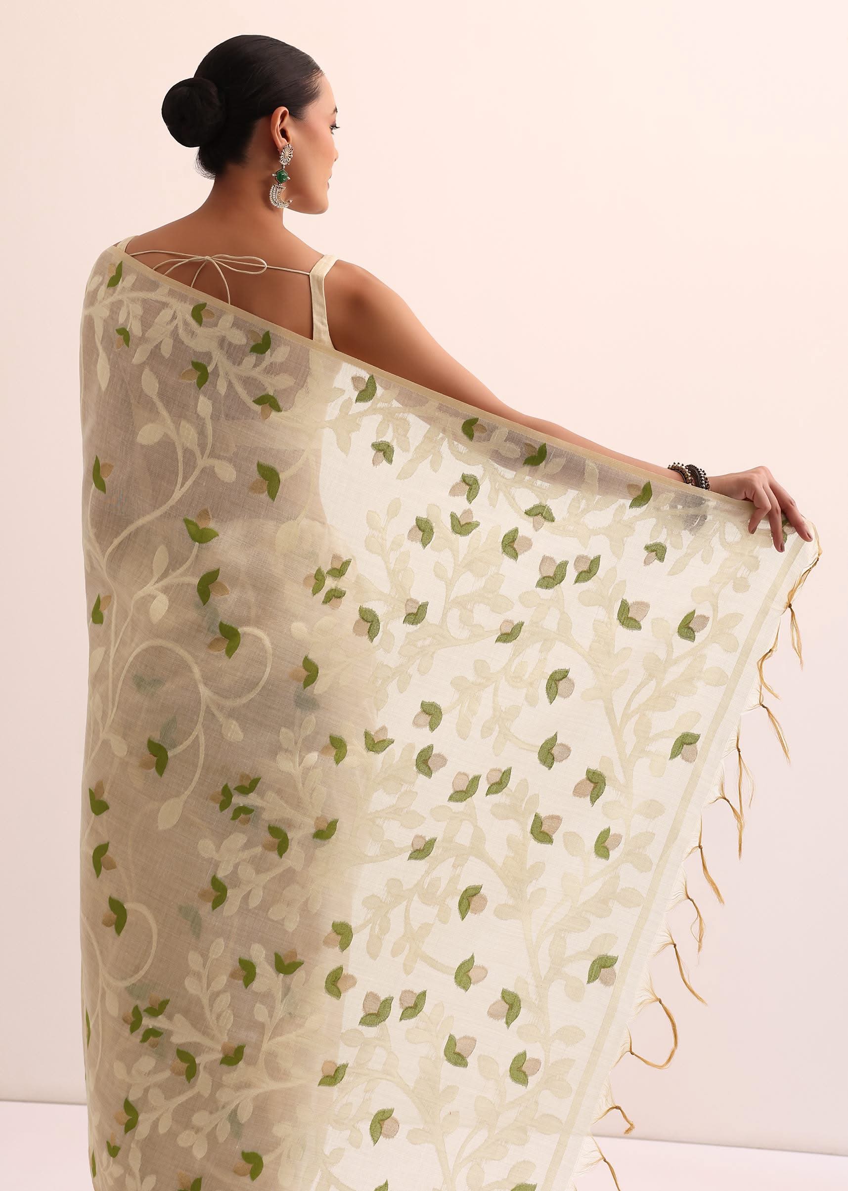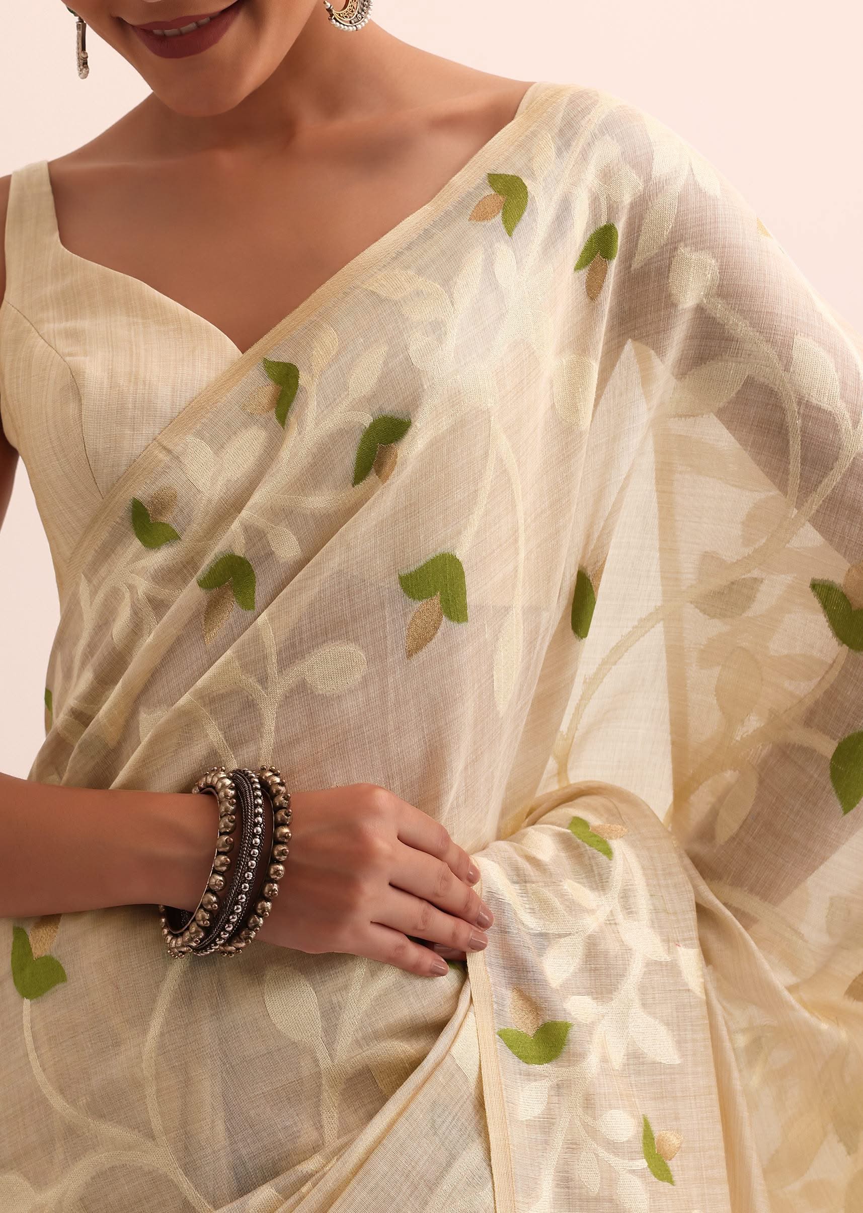 Beige Green Cotton Linen Saree With Thread Work And Unstitched Blouse