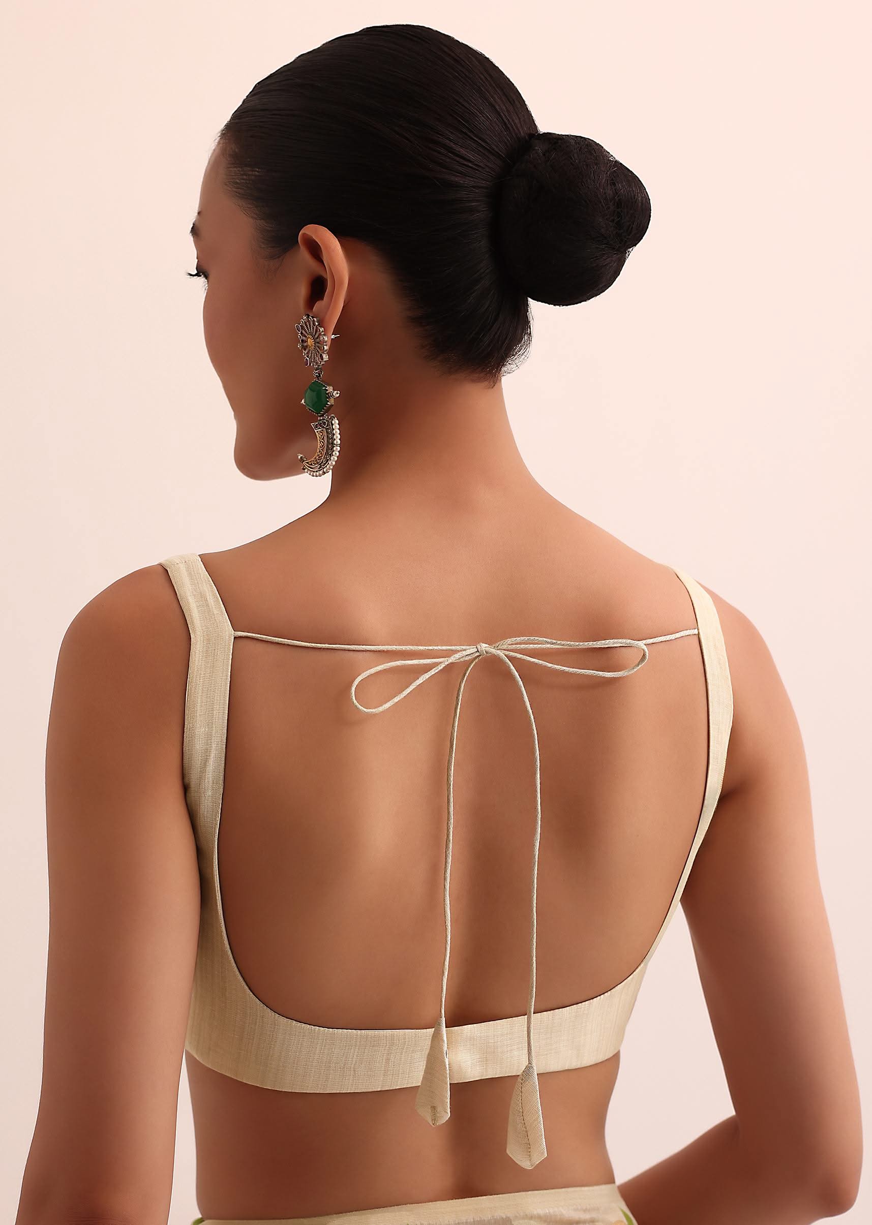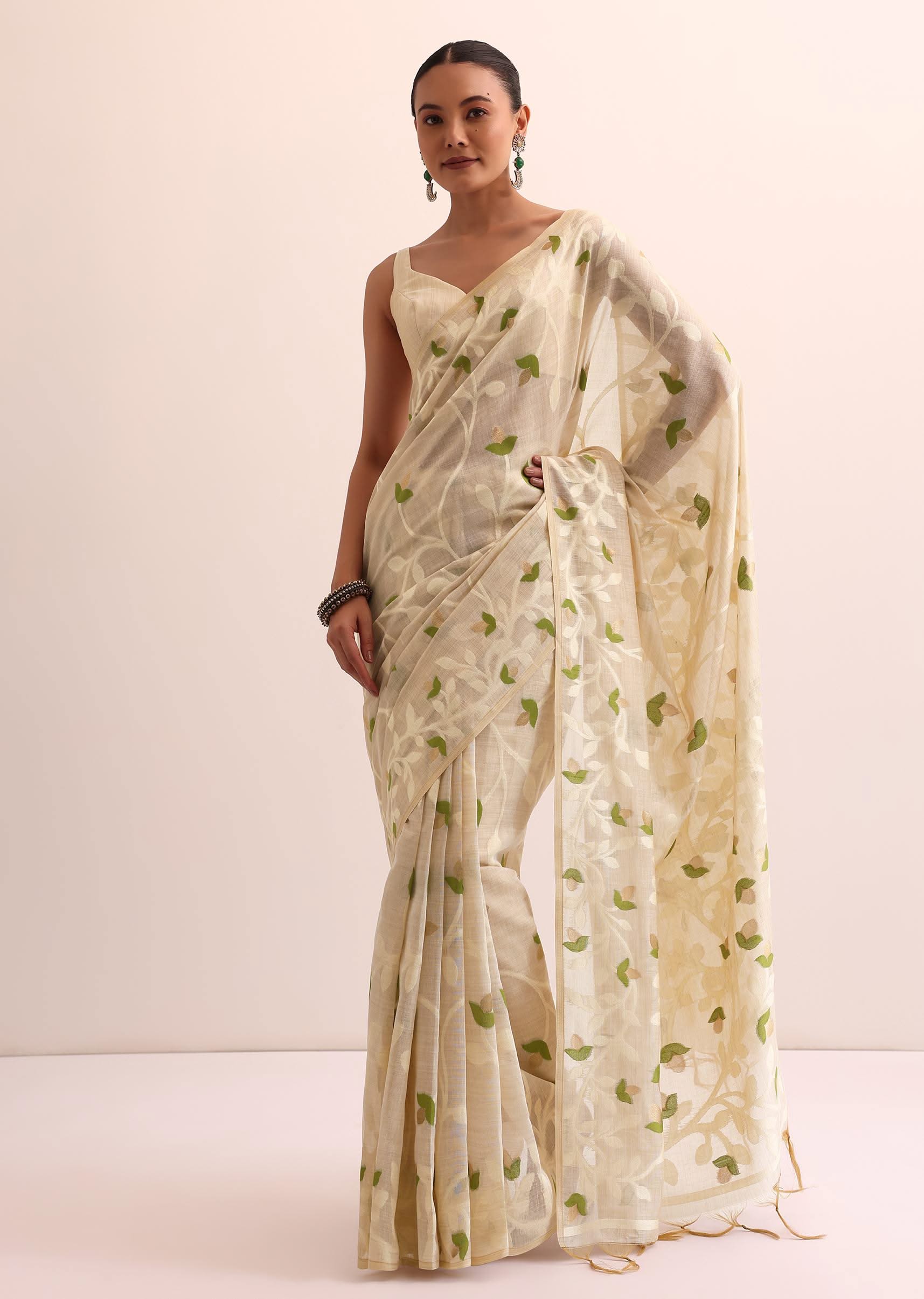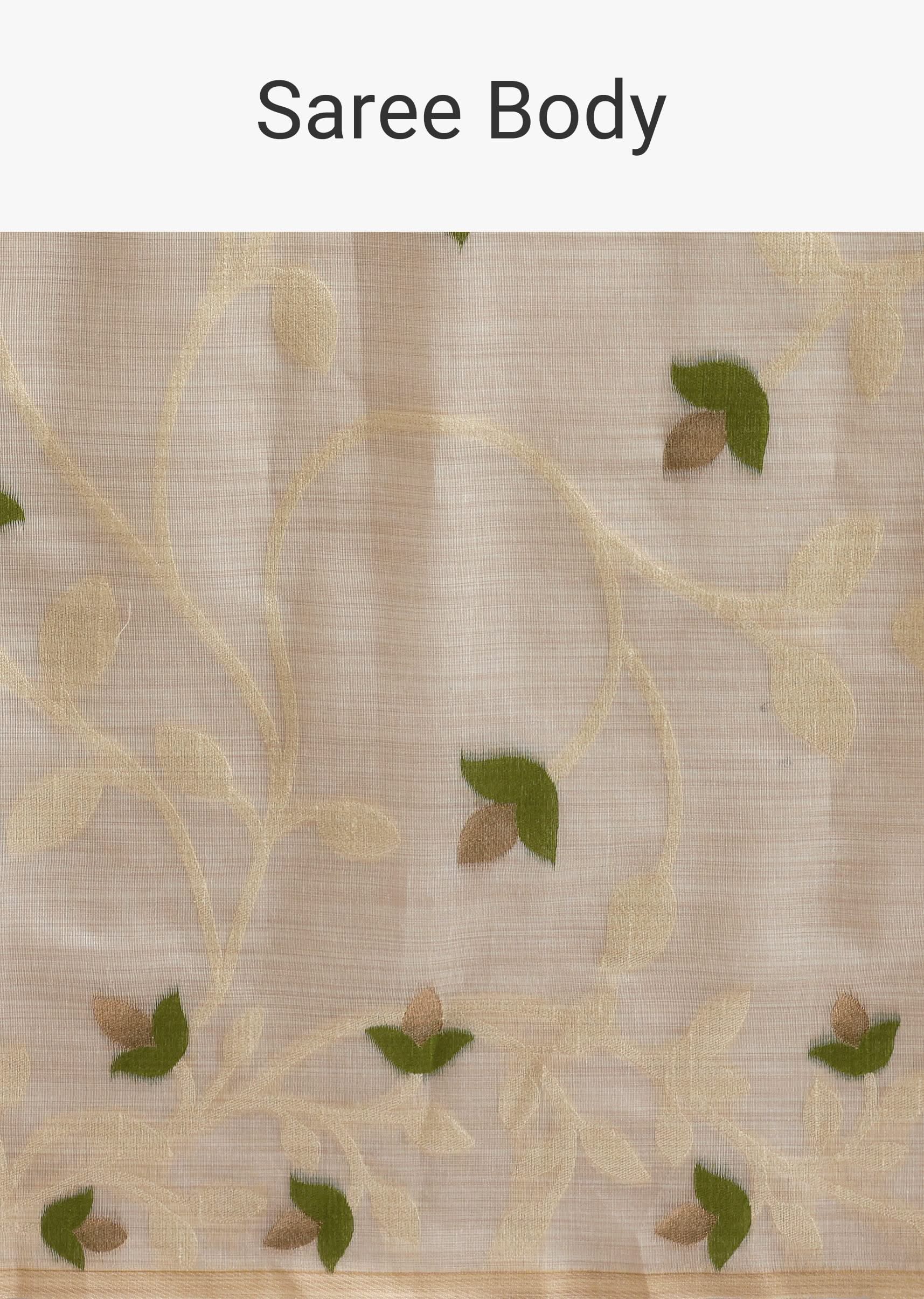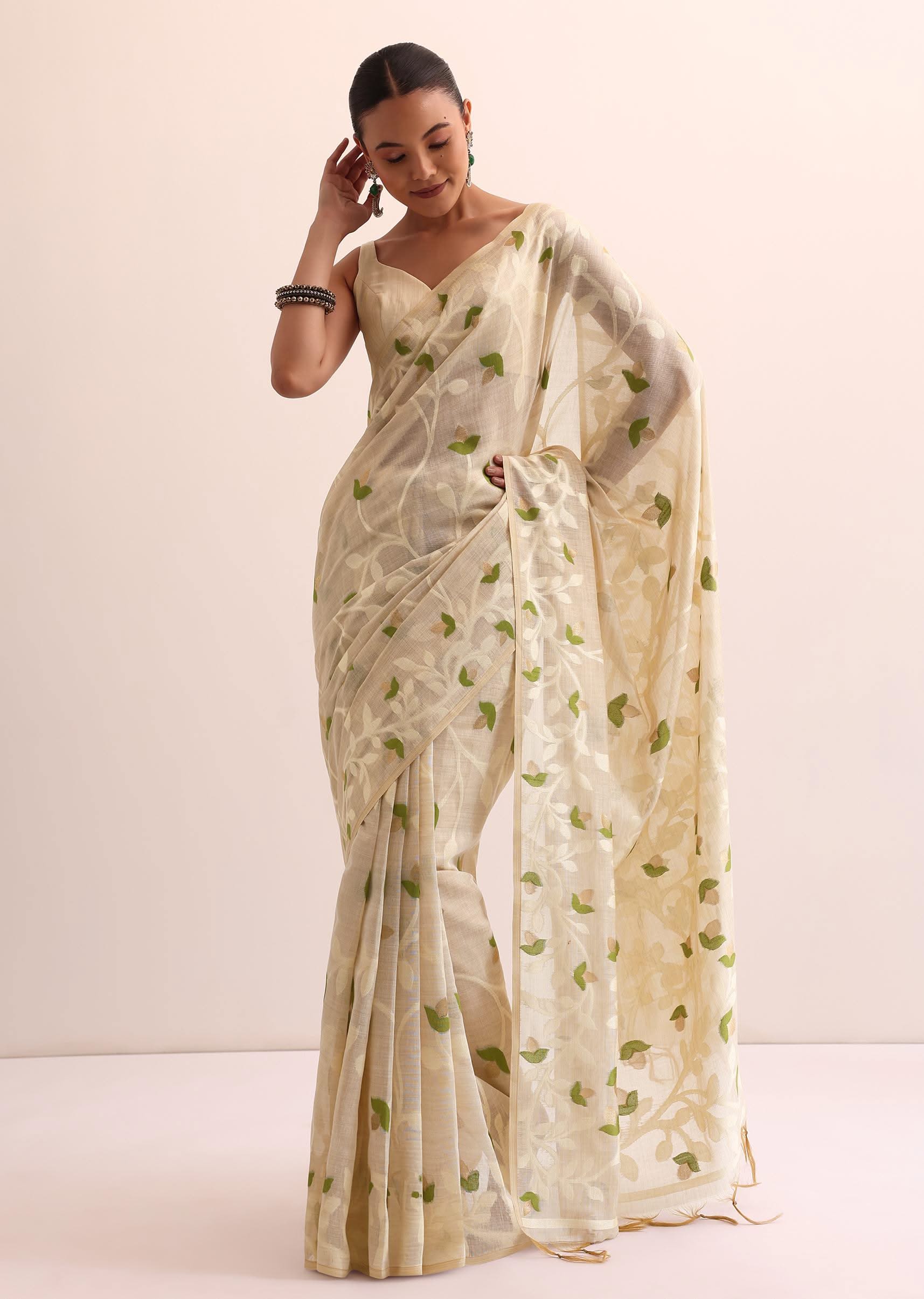 Beige Green Cotton Linen Saree With Thread Work And Unstitched Blouse