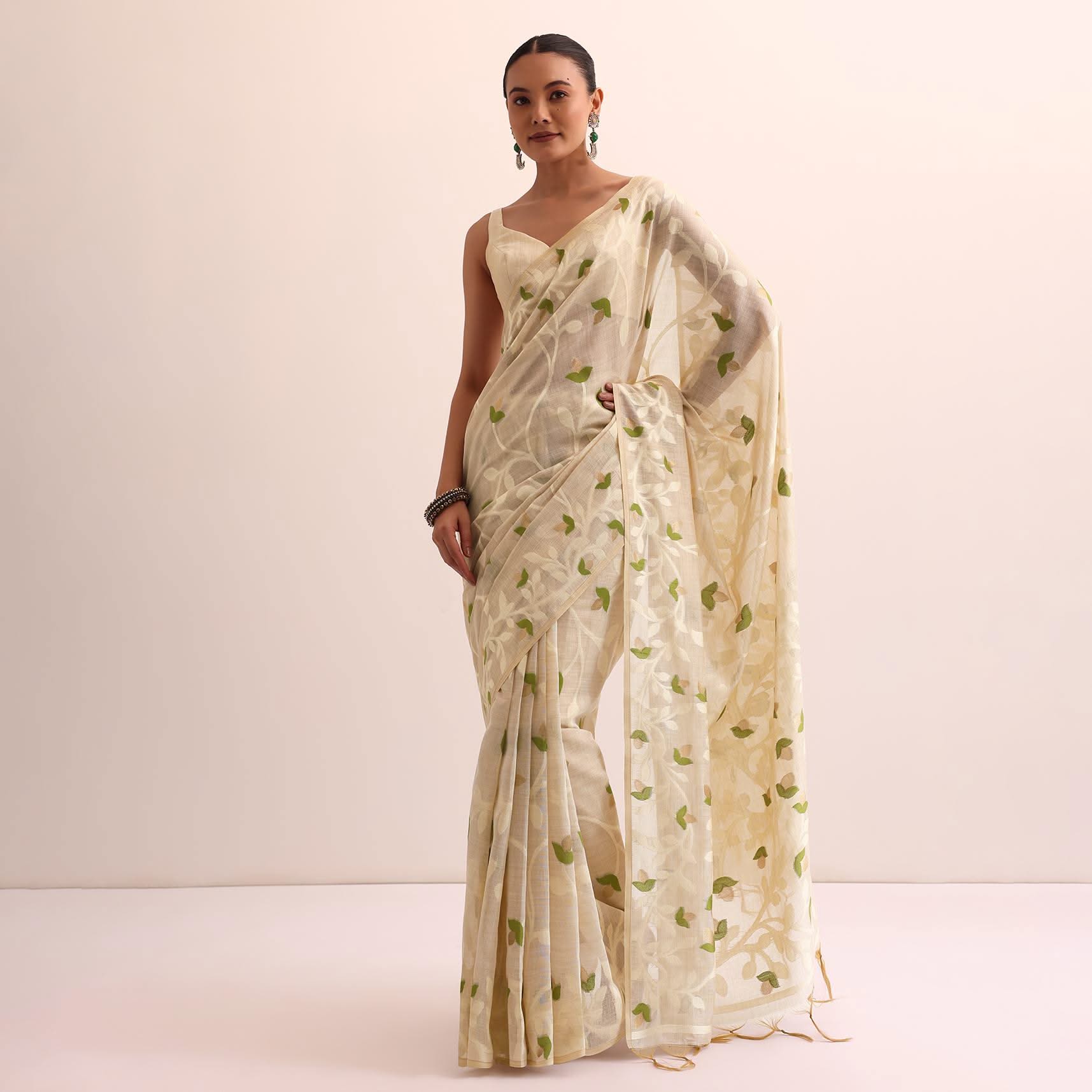 Charm through endless festive celebrations in style by stepping out in this stunning green saree.Fabricated from a blend of cotton linen, it is accentuated with floral thread work all over.It is paired with an unstitched blouse piece. Actual color may slightly vary due to photographic lighting sources and device screen settings. Awarded as the Most Trusted Brand, we're delivering styles you love, just as promised.