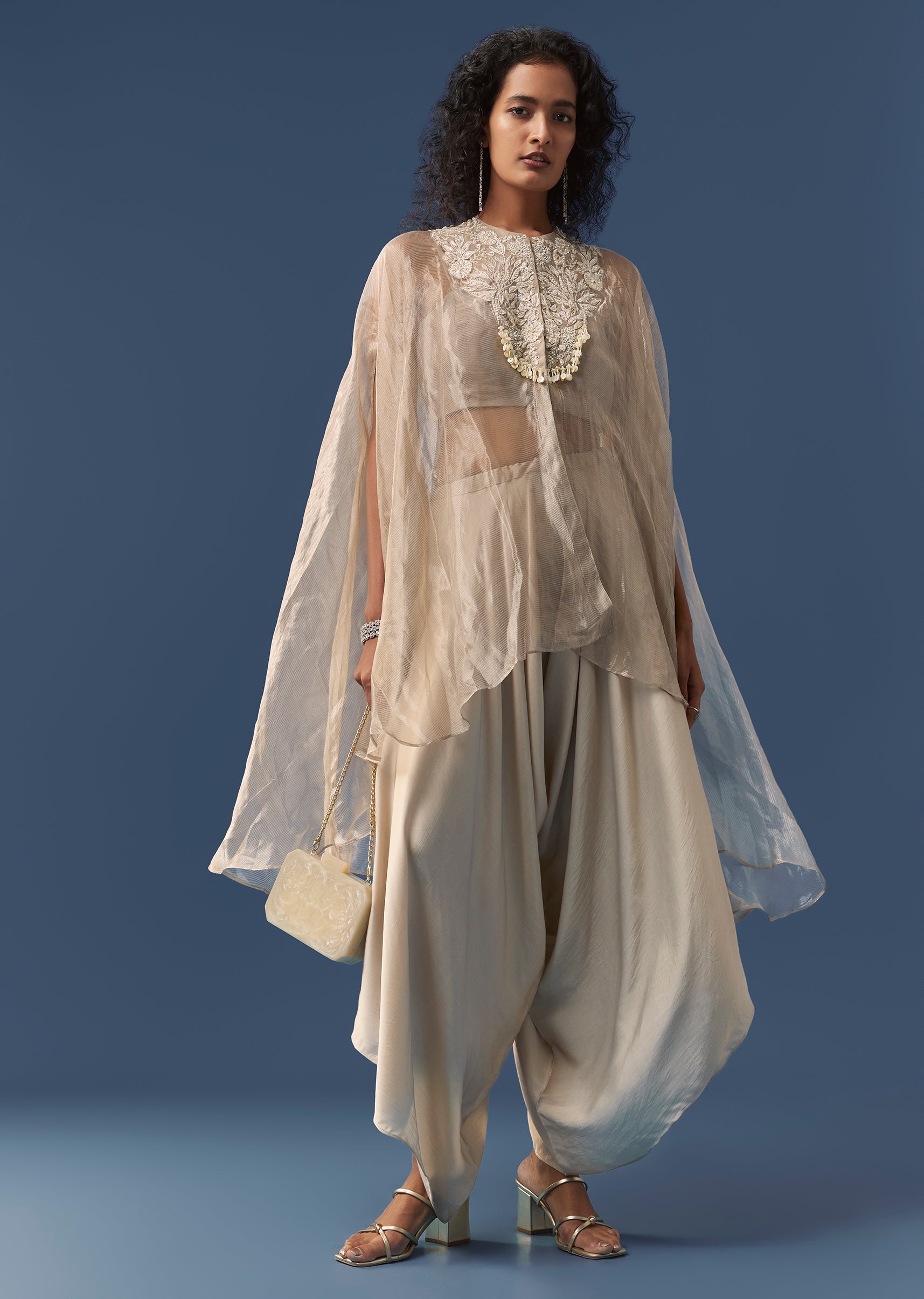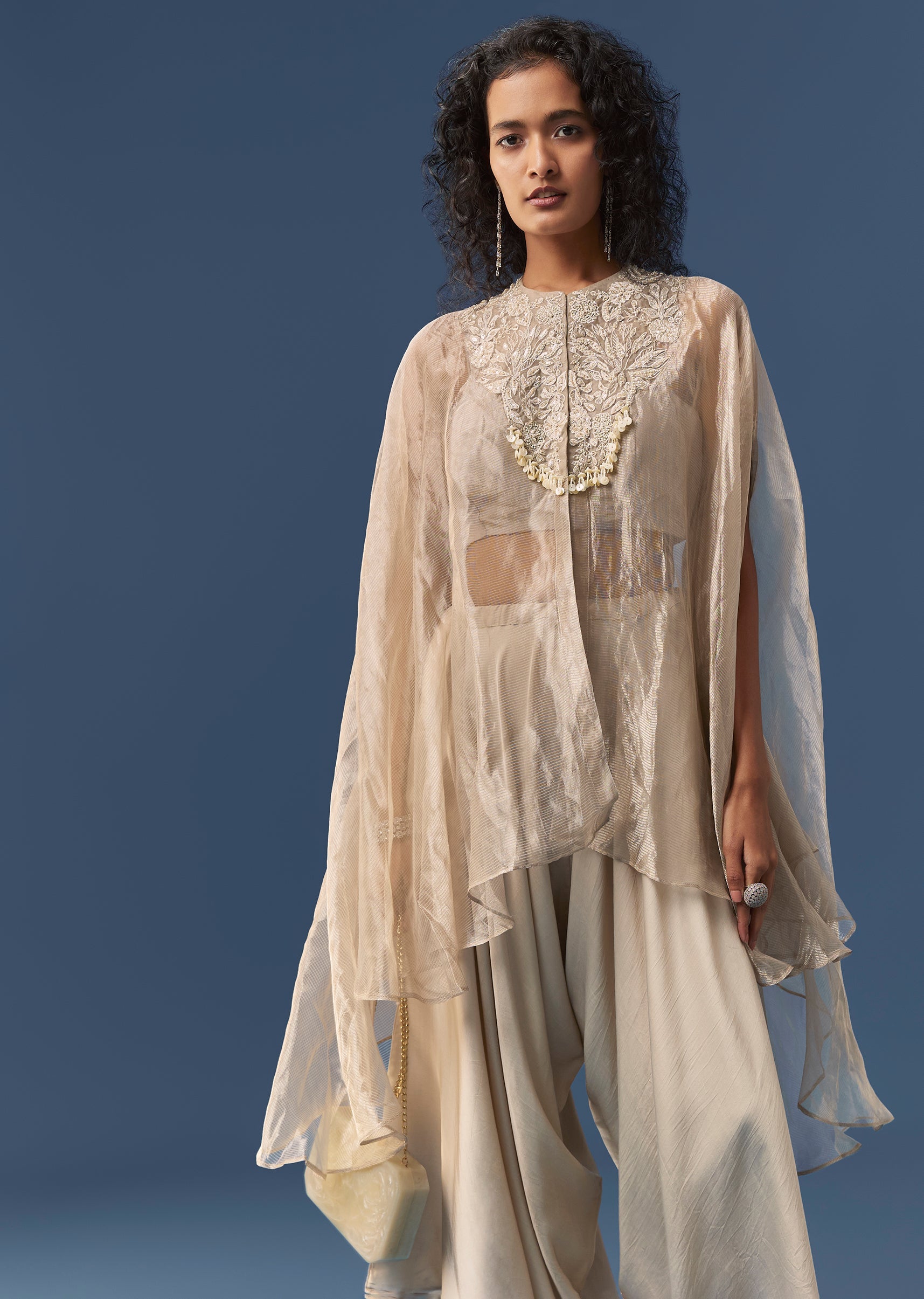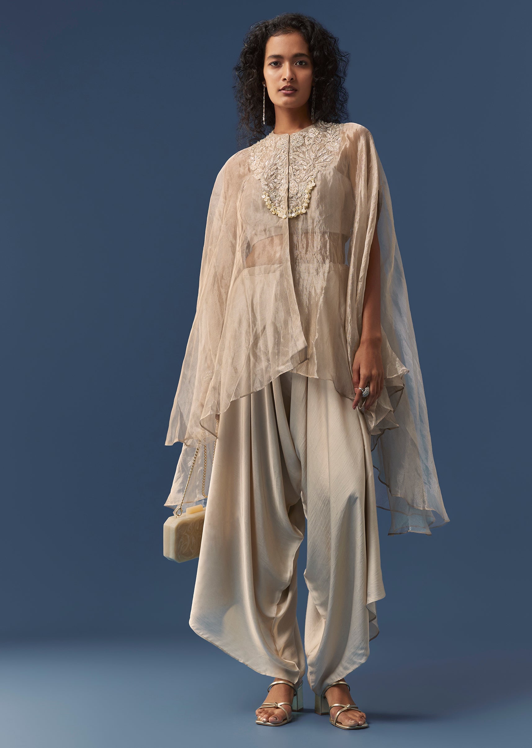 Beige Indowestern Organza Cape and Dhoti Set