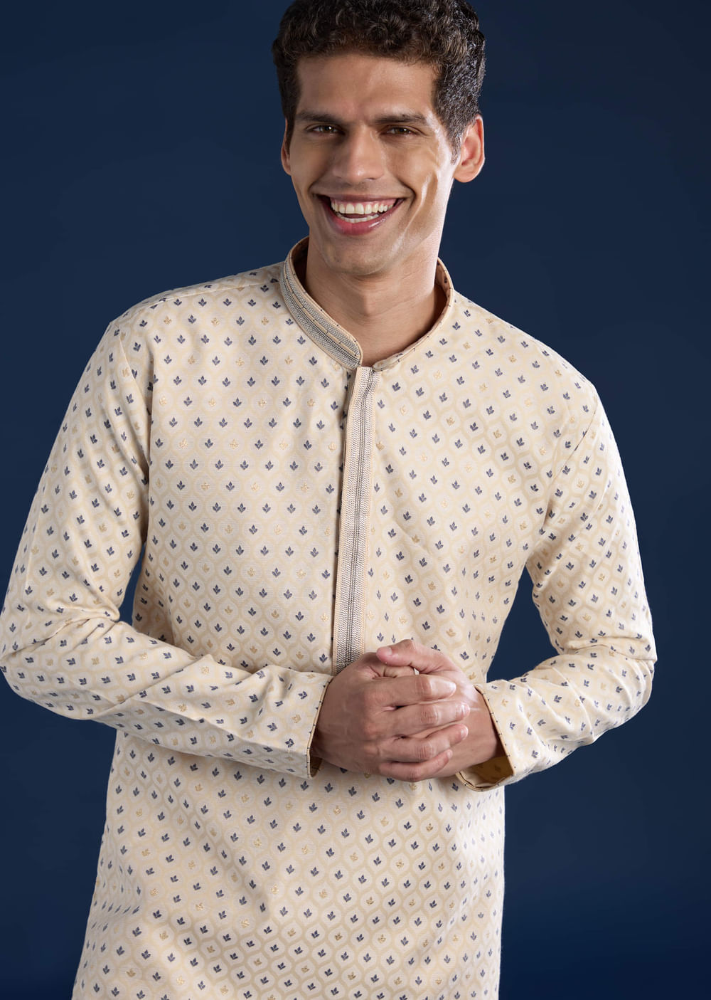 Exude classic sophistication with this beige jacquard men’s kurta set, crafted with intricate woven patterns that add rich texture and timeless charm. The luxurious jacquard fabric offers a subtle sheen, making it perfect for weddings, festive celebrations, or cultural events. This ensemble beautifully blends traditional craftsmanship with a refined, modern aesthetic. Awarded as the Most Trusted Brand, we're delivering styles you love, just as promised.