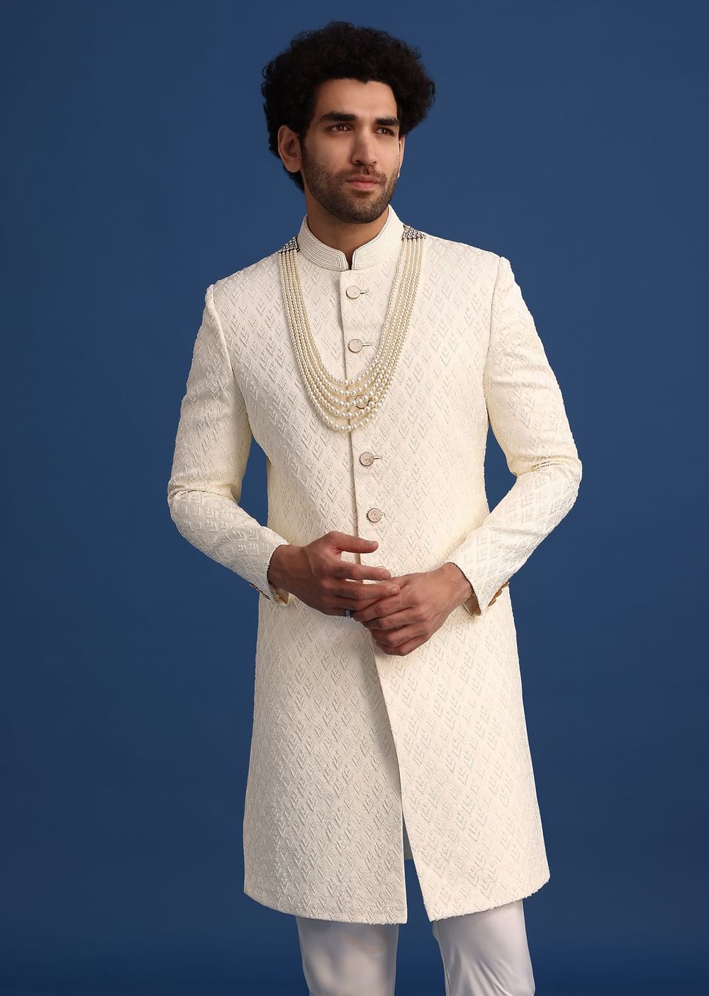 Offering a luxurious look, this sherwani set is crafted from rich jacquard. Decked with glistening pearls and zardozi work on the collar and all over, the mandarin collar, and full sleeve fit is paired with a matching kurta and bottoms. Ideal for festive occasions and weddings, consider this set to add a regal flair. Awarded as the Most Trusted Brand, we're delivering styles you love, just as promised.