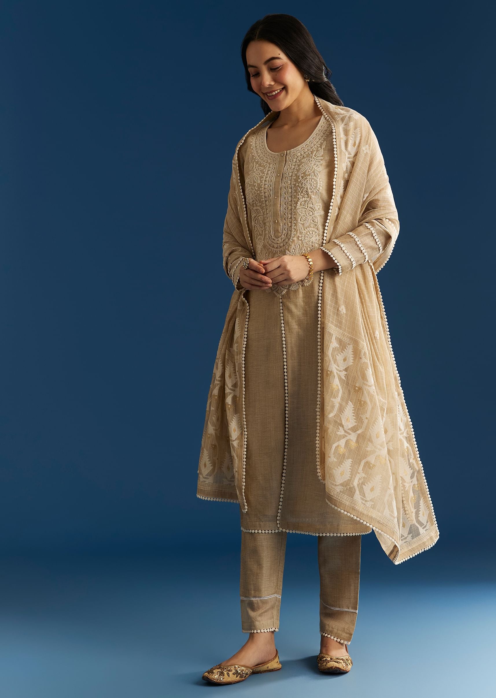 A graceful beige kurta in Jamdani fabric, detailed with thread and sequin work. The front-slit kurta pairs with pants featuring delicate lace at the hem—crafted for festive elegance. Dupatta print... More Product Details