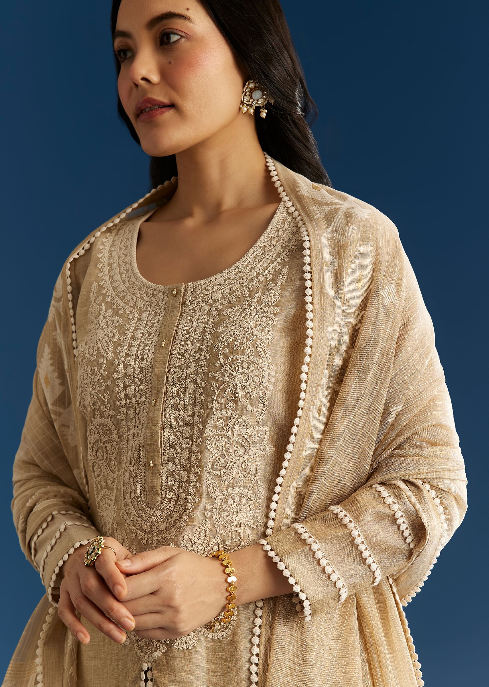 Beige Jamdani Kurta Set With Thread And Sequins Work