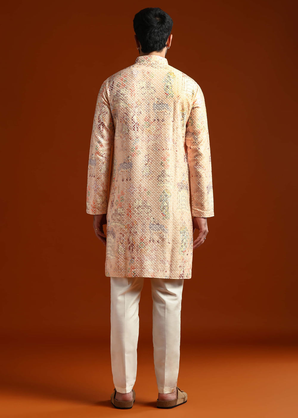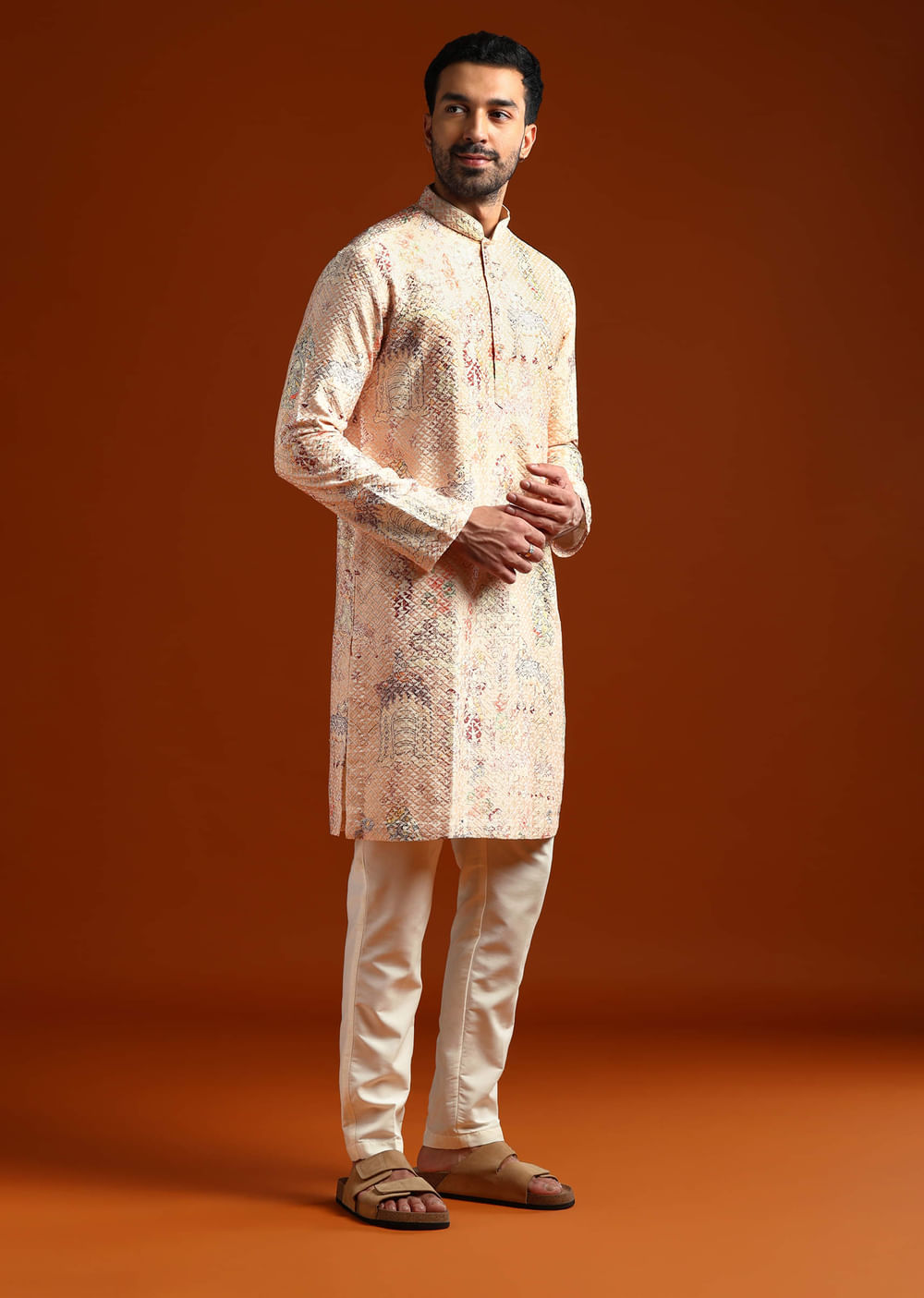 Beige Kurta Set For Men With Print And Sequins Embroidery