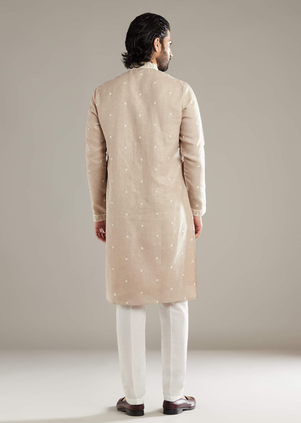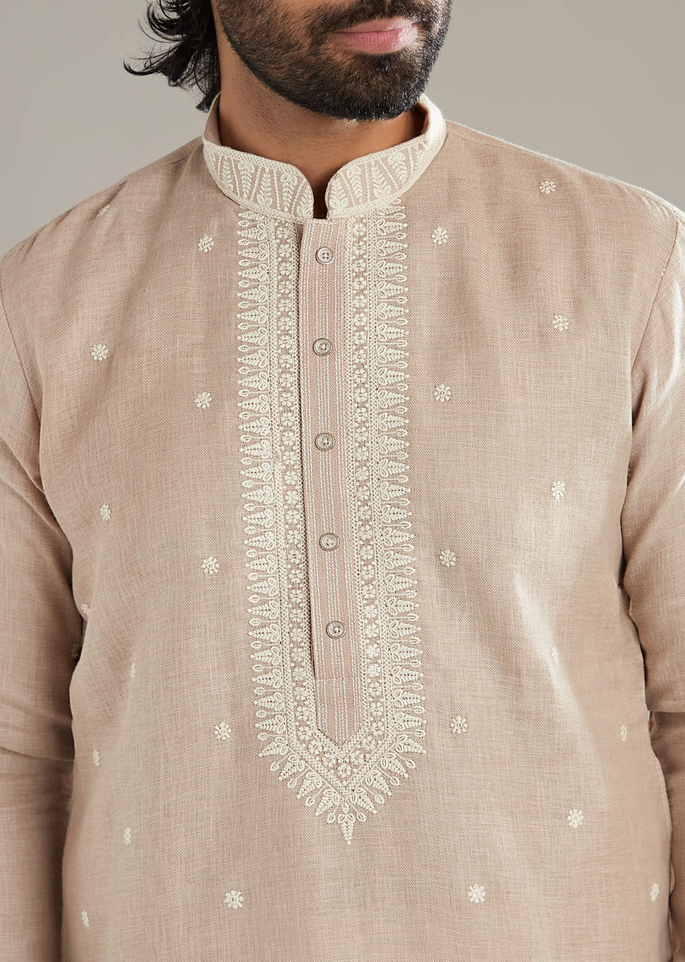 Beige Linen Kurta Set For Men With Resham Hand Work