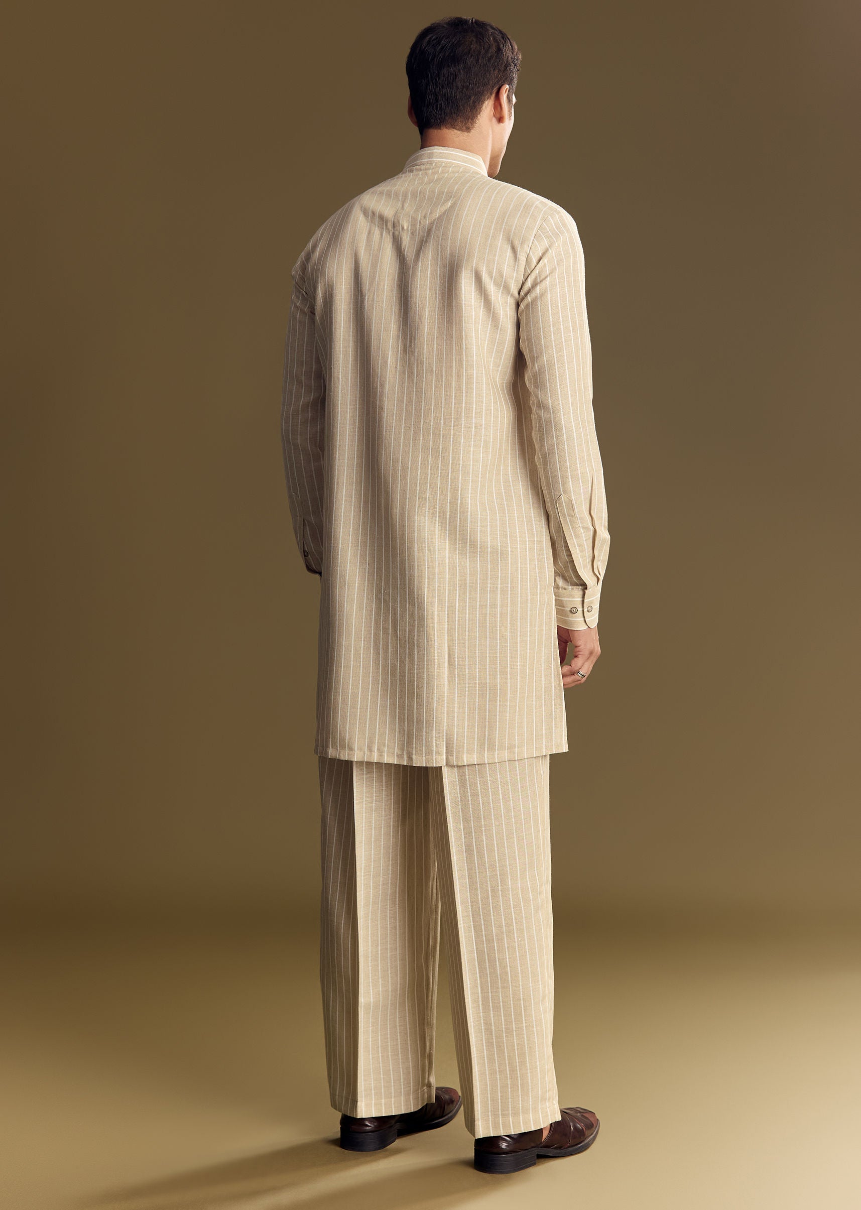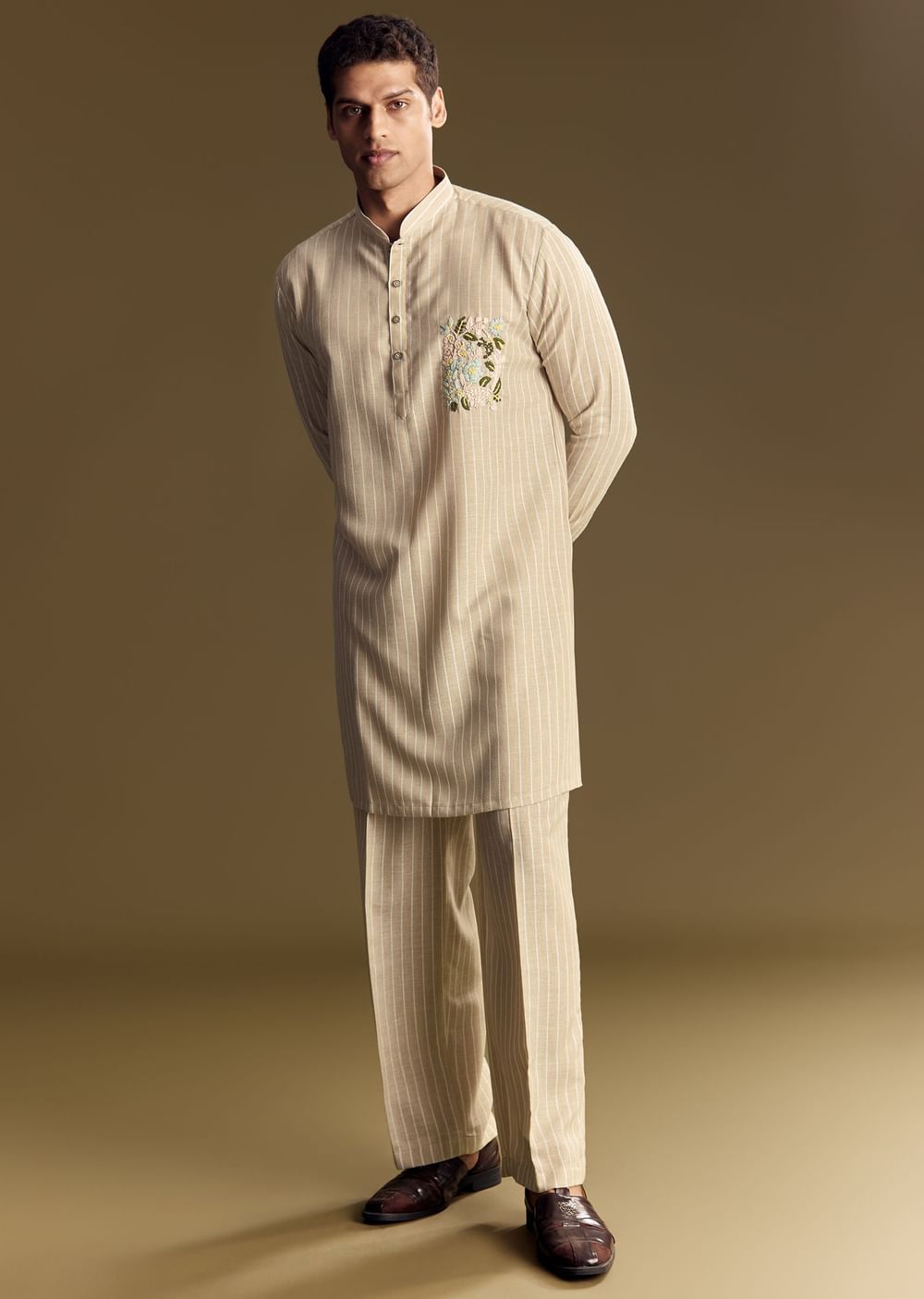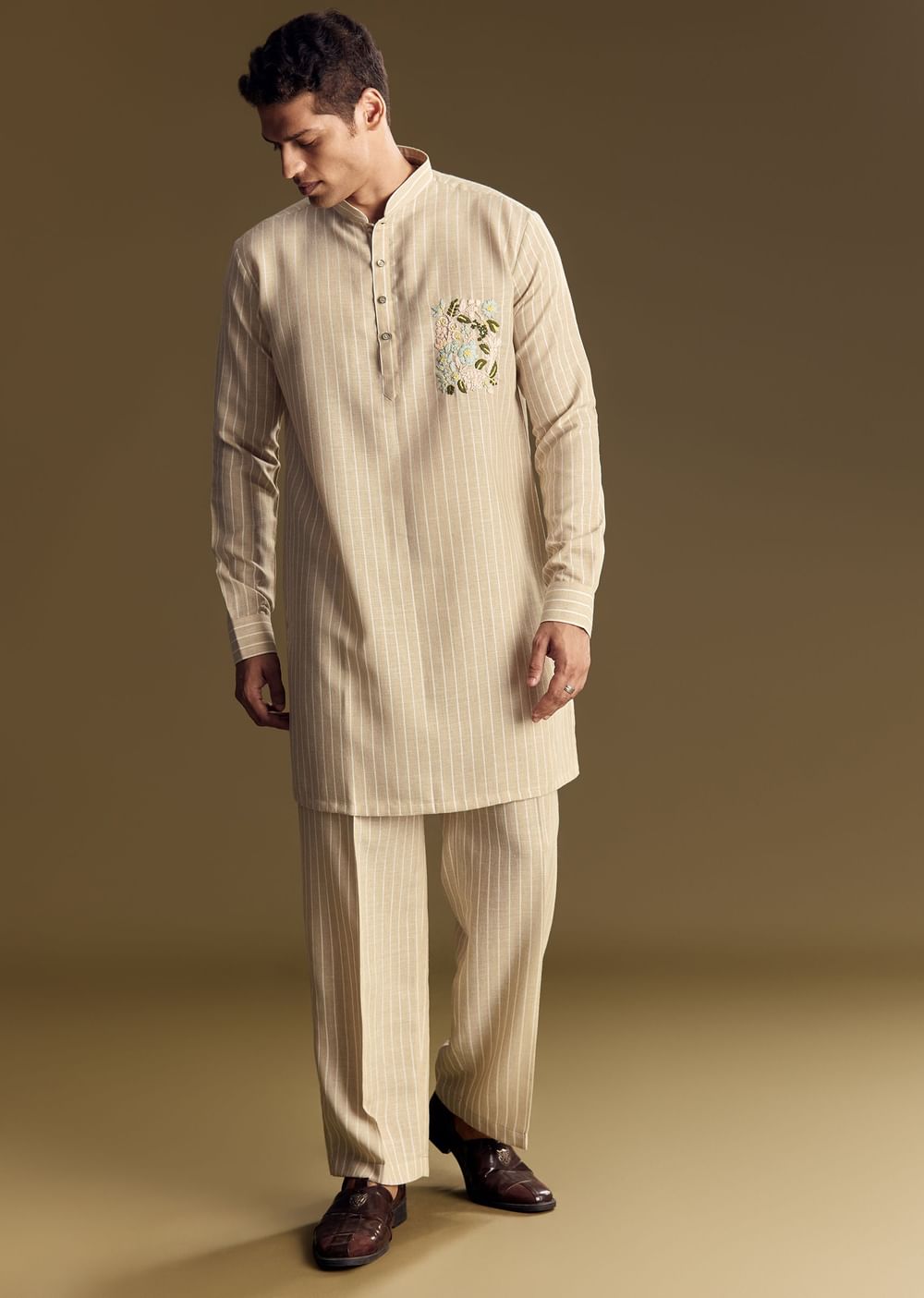 Neutral beige kurta crafted in linen, detailed with light resham embroidery and relaxed trousers, perfect for formal or festive mornings. Awarded as the Most Trusted Brand, we're delivering styles you love, just as promised.