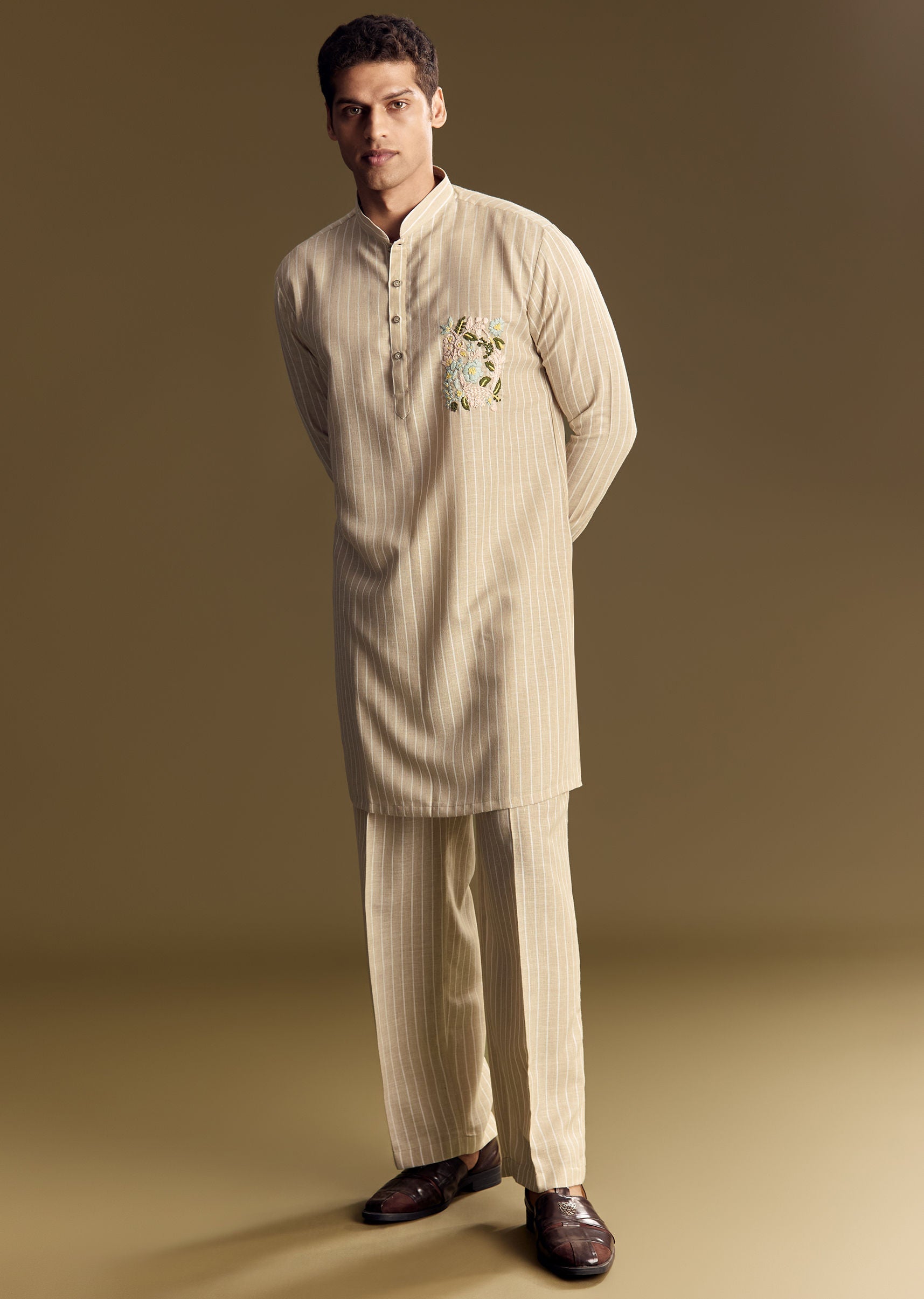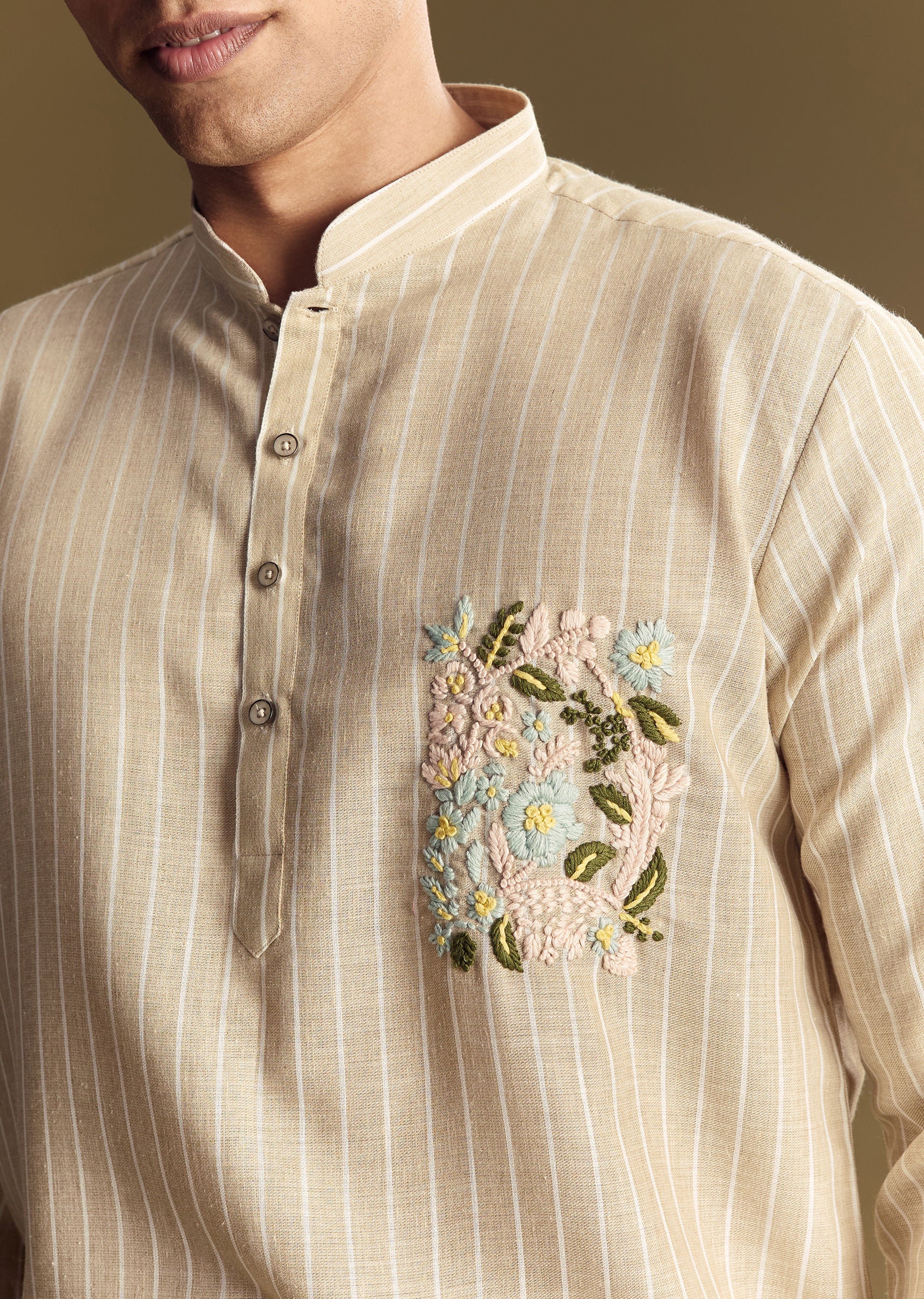 Beige Linen Kurta Set With Delicate Hand Embroidery