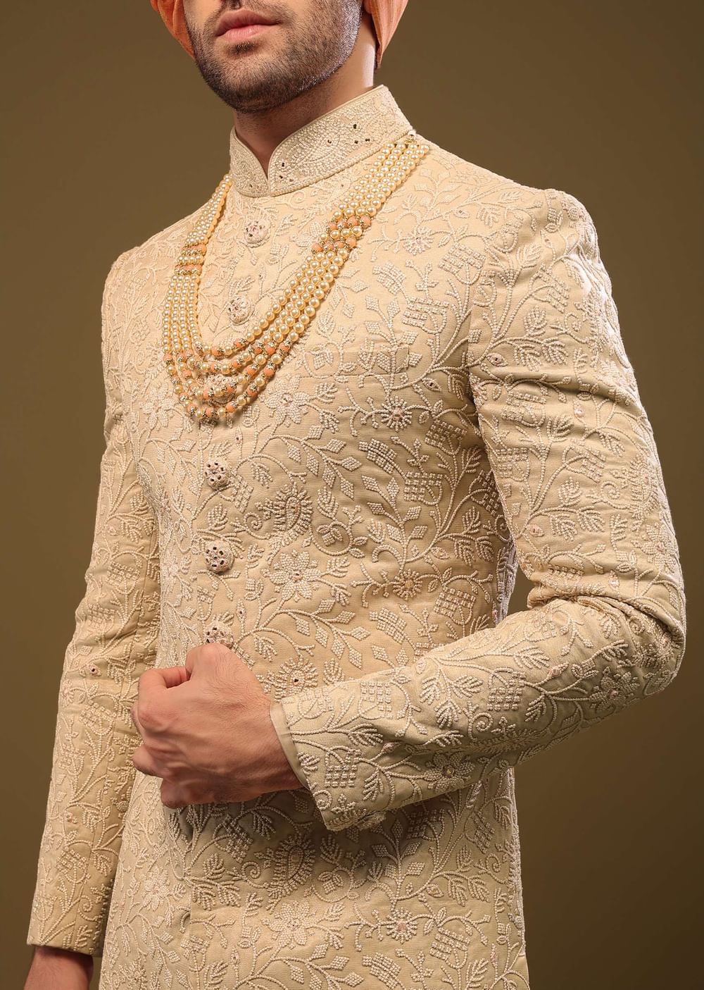 A classic beige lucknowi sherwani crafted in hand-embroidered zari, mirrorwork, and thread weave in a beautiful floral design.It has full sleeves and an embroidered mandarin collar, a front button closure,... More Product Details
