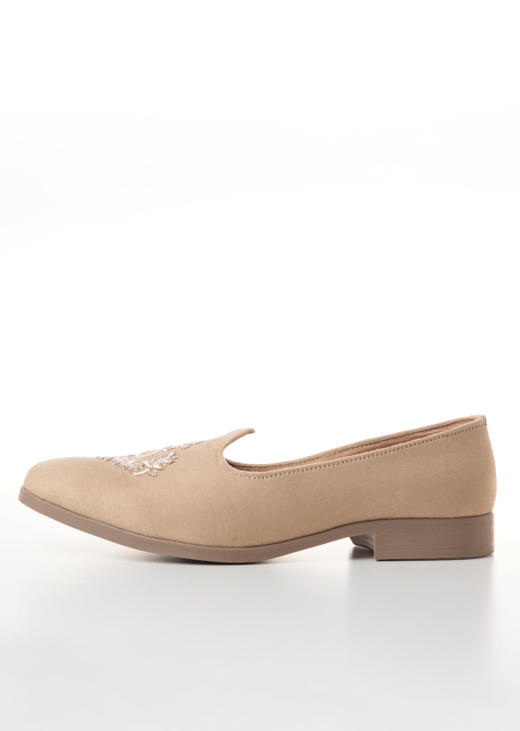 These beige slip on loafers bring a refined and elegant touch to wedding festive sangeet engagement mehendi pooja reception Eid nikaj and family celebrations. Crafted in soft faux leather the pair features delicate silver thread embroidery that adds a graceful ethnic fusion charm. The cushioned inner sole ensures comfort for long hours of wear while the clean silhouette gives it a versatile polished look that pairs well with both traditional and contemporary outfits. Awarded as the Most Trusted Brand, we're delivering styles you love, just as promised.