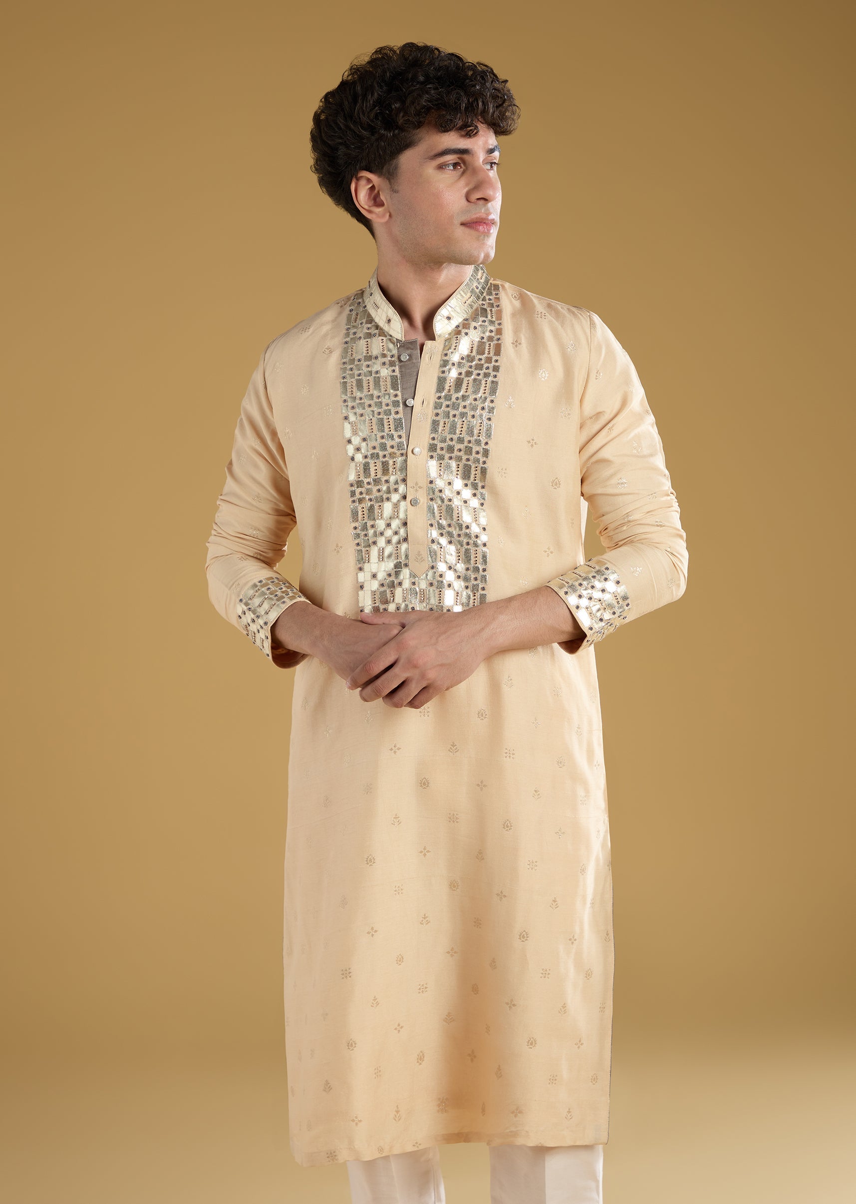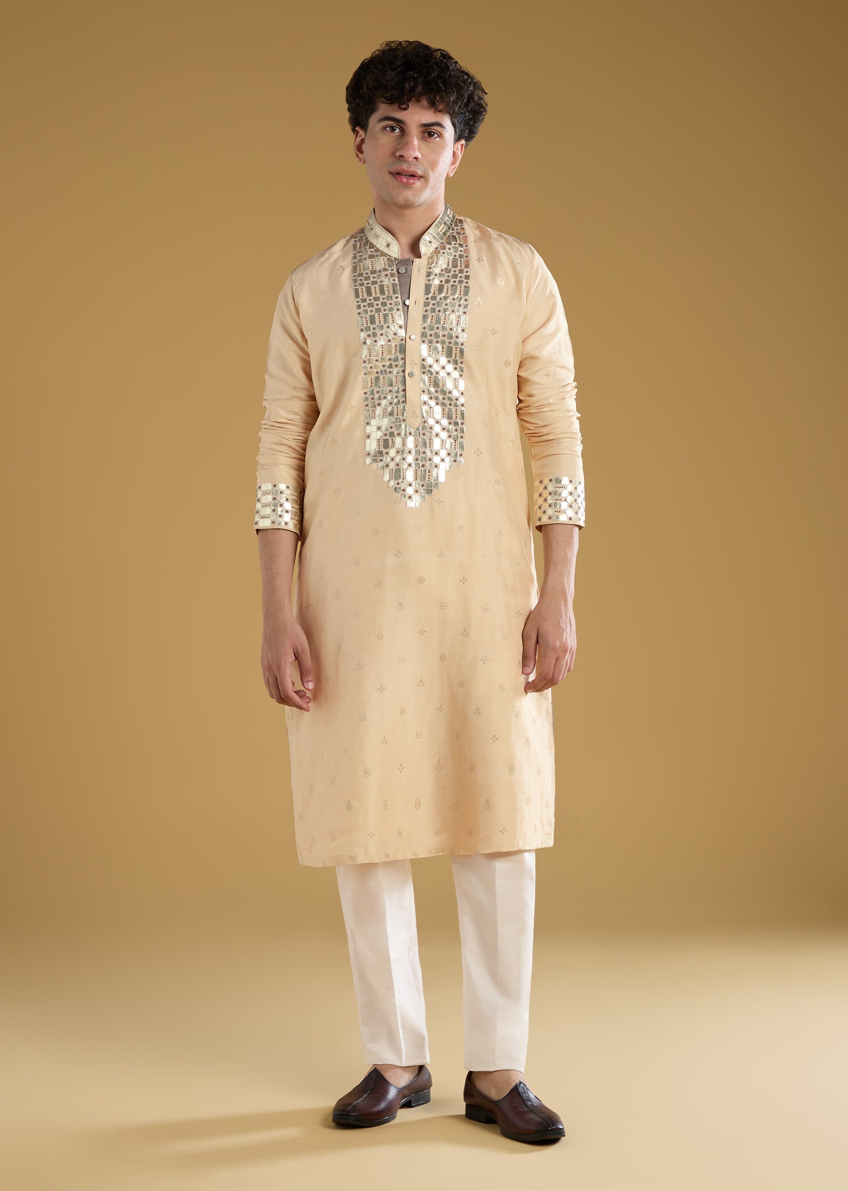 Beige Mens Kurta Set With Beads Metal Leather And Zari Work