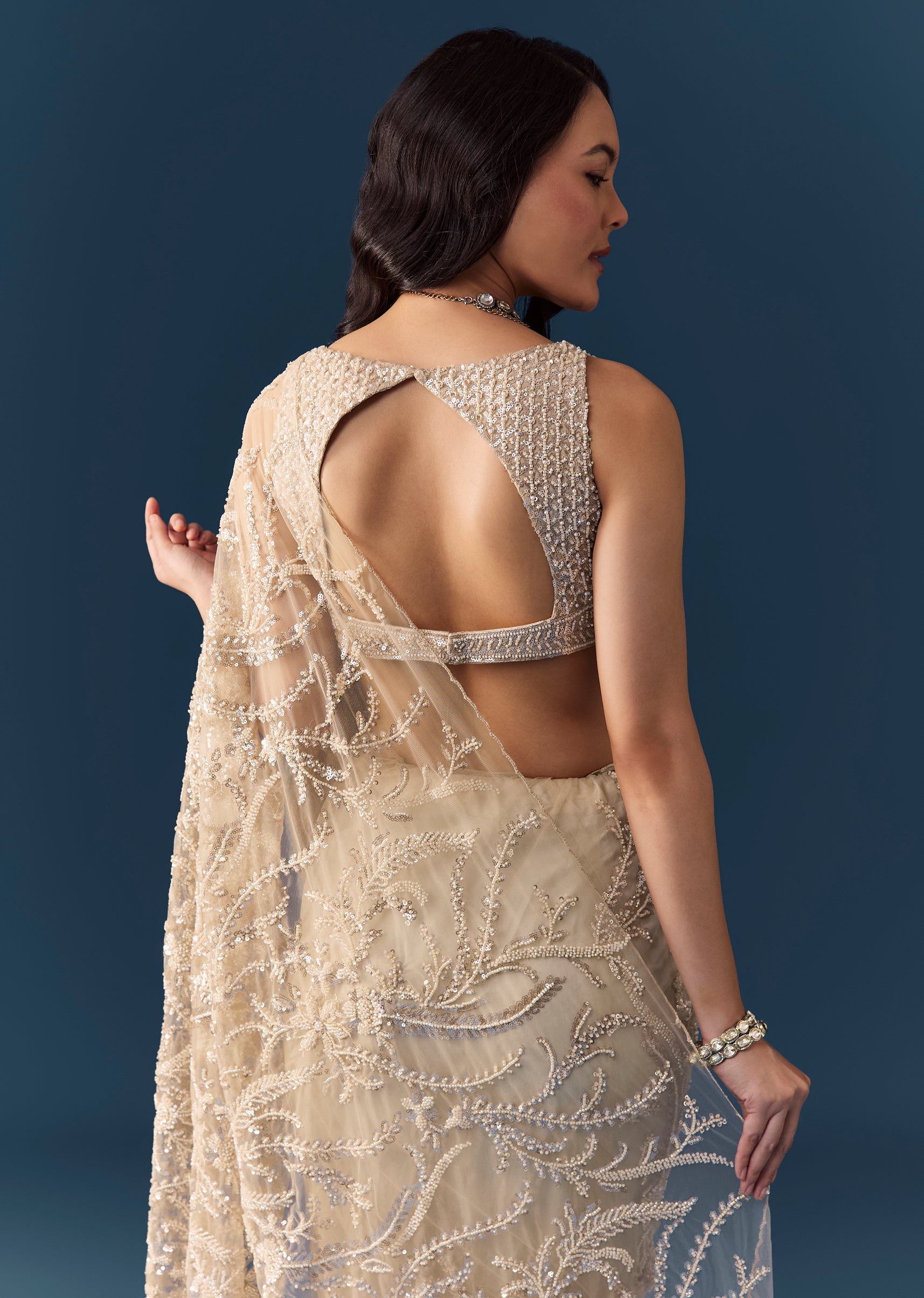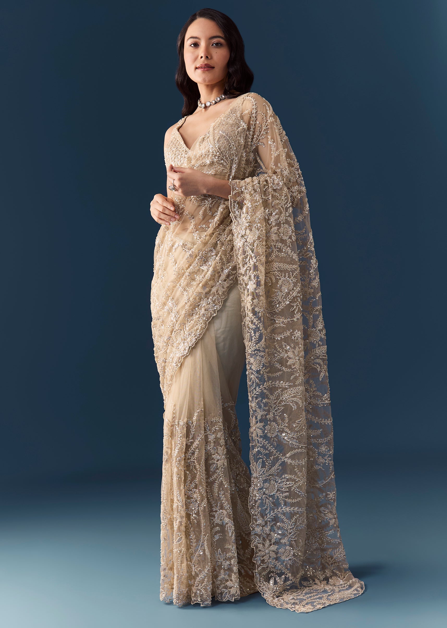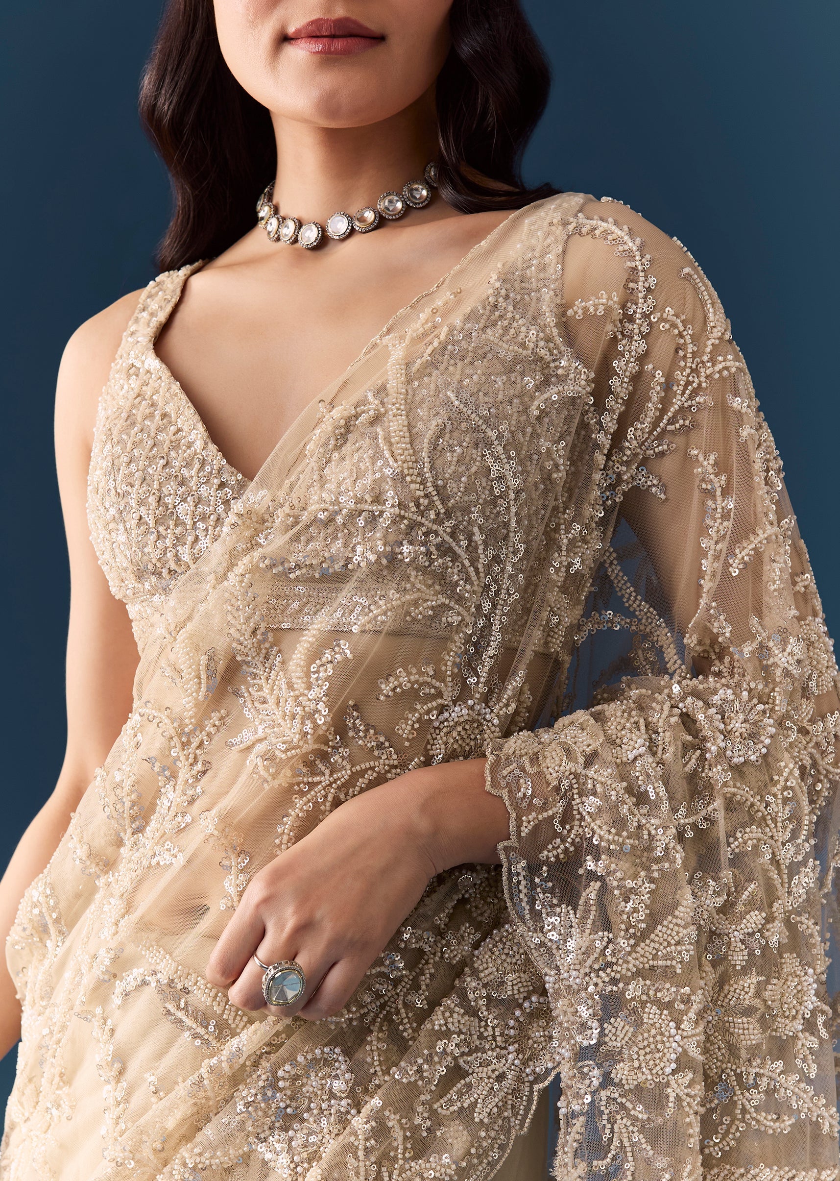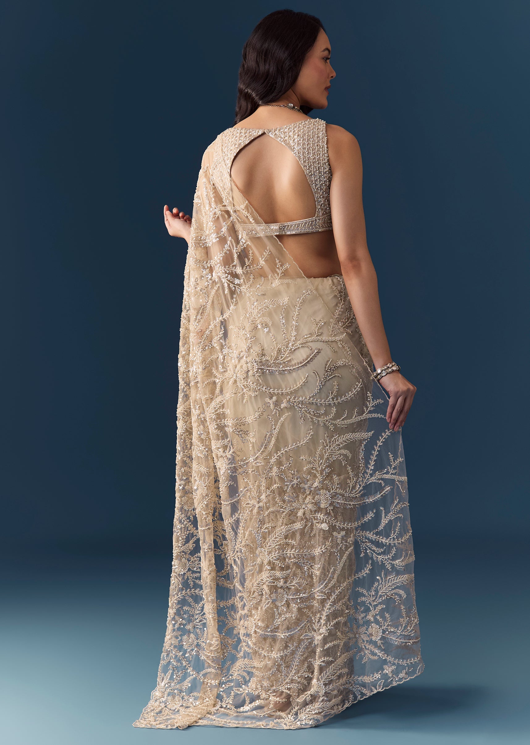 Beige Net Floral Jaal Bead Work Saree with Unstitched Blouse