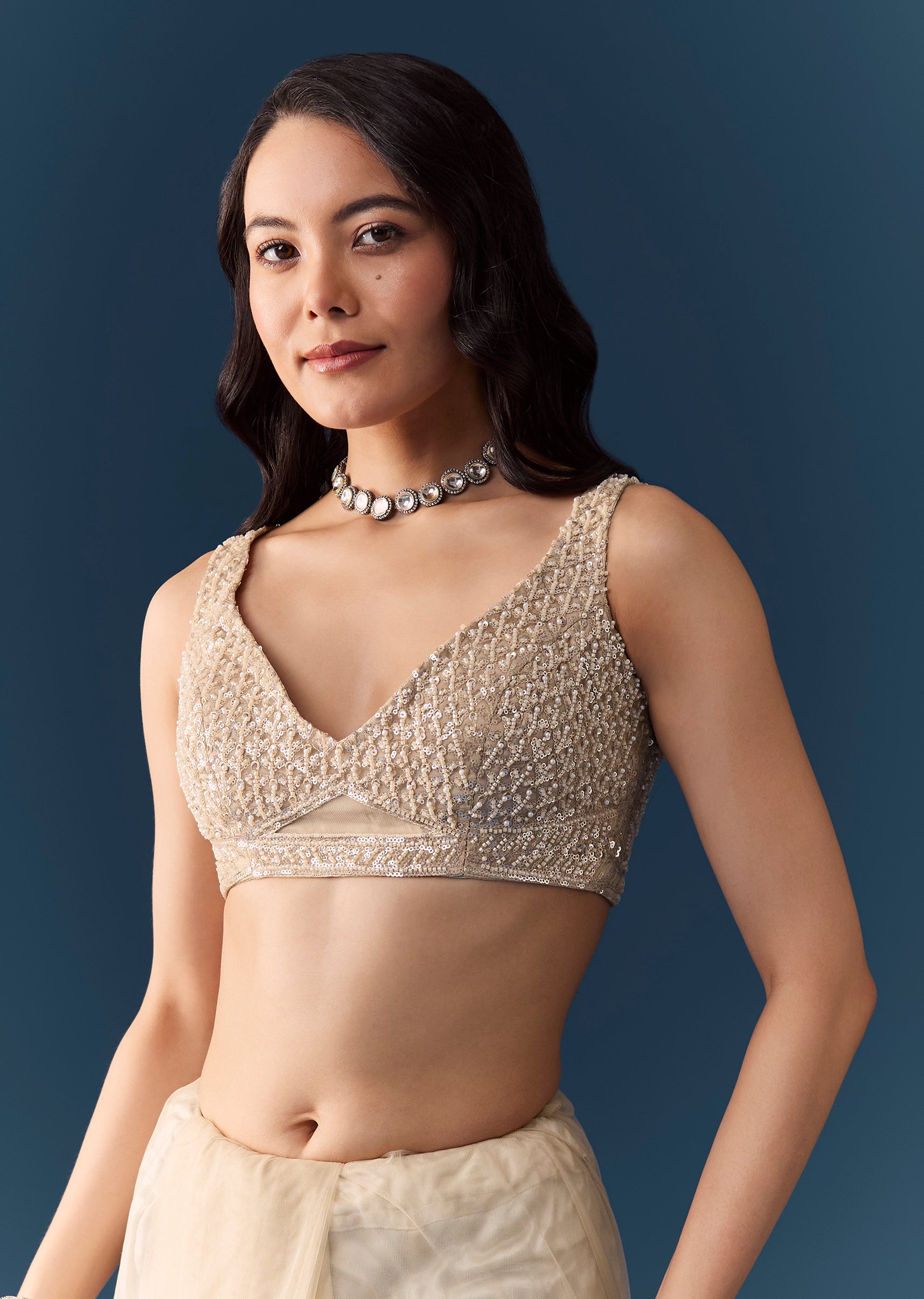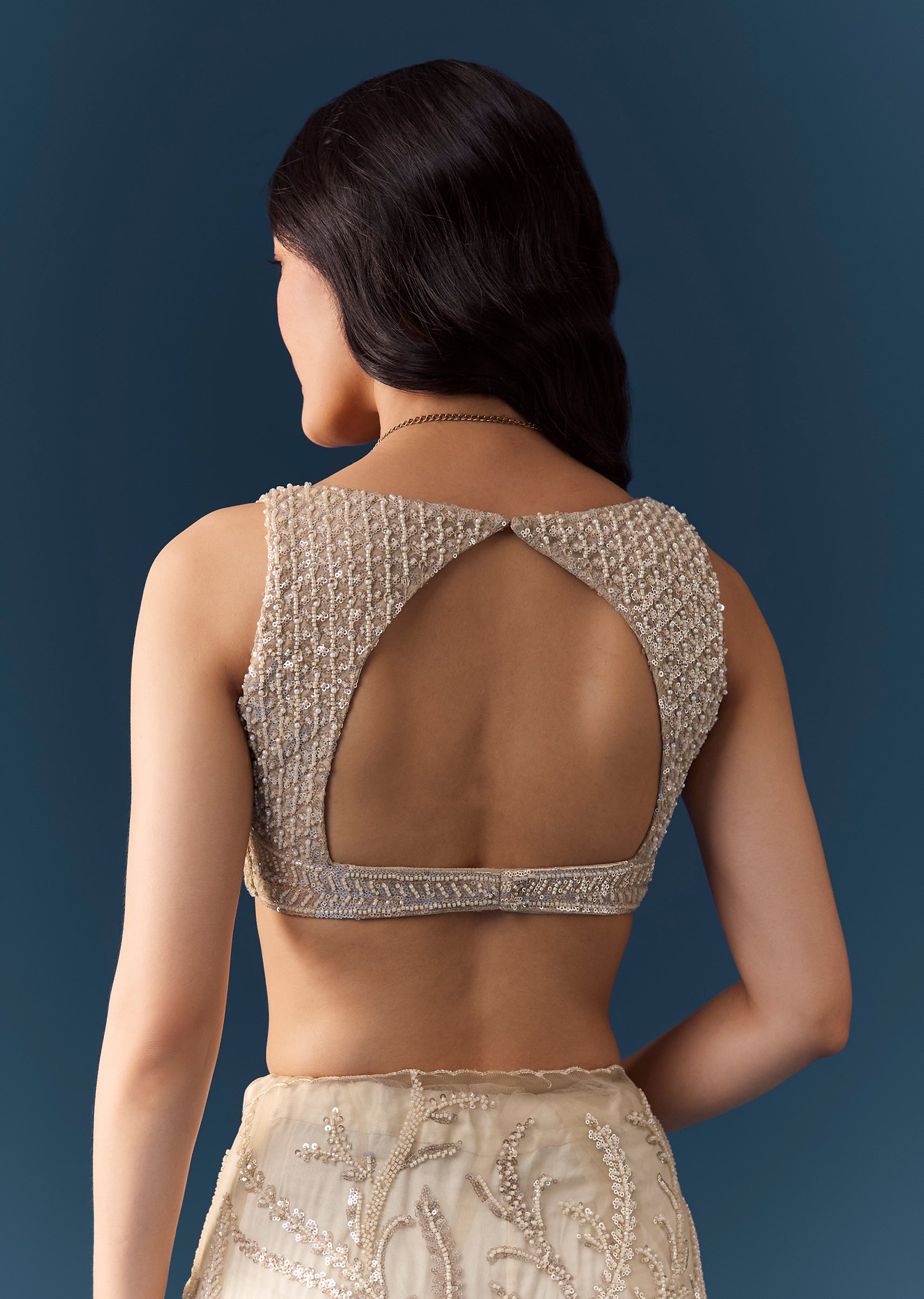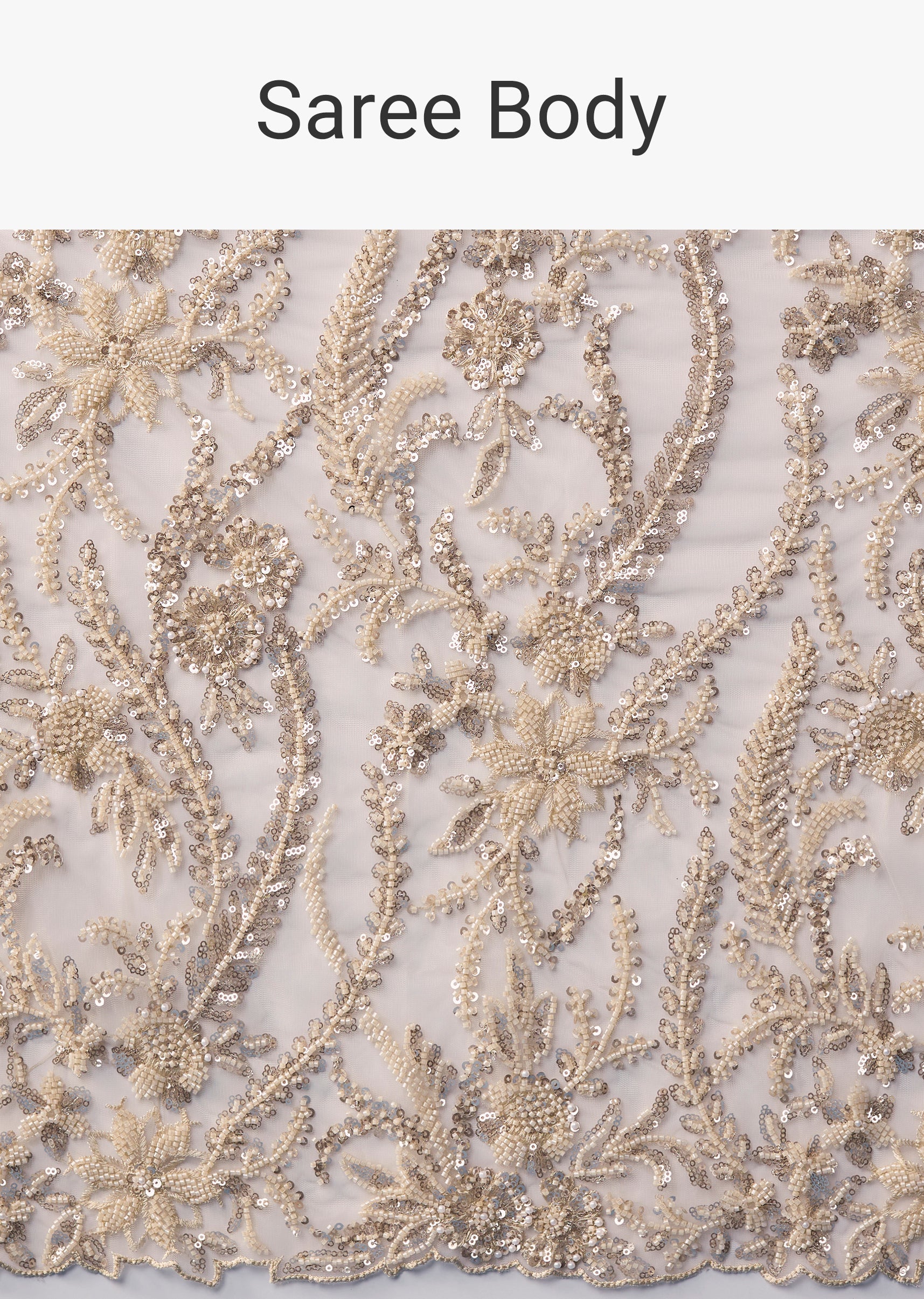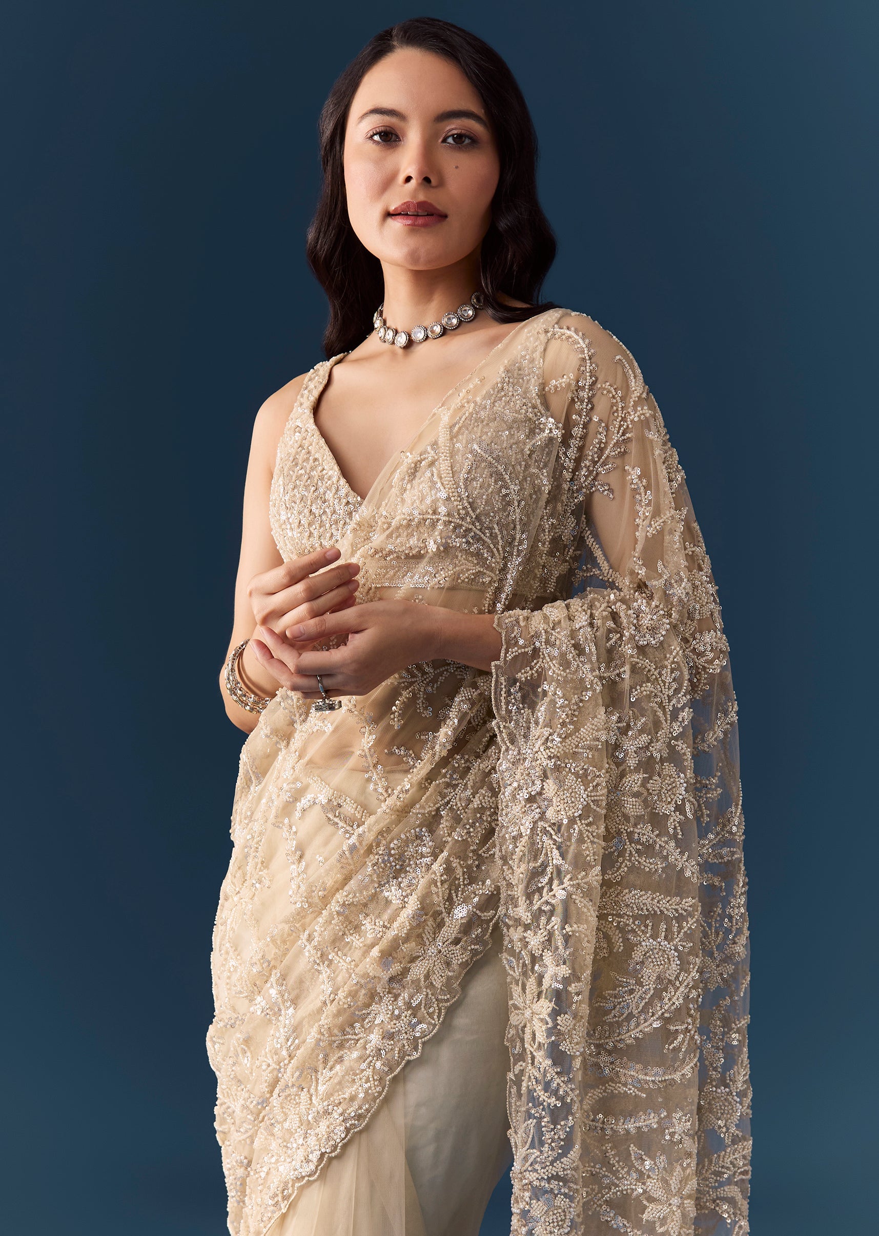 Beige Net Floral Jaal Bead Work Saree with Unstitched Blouse