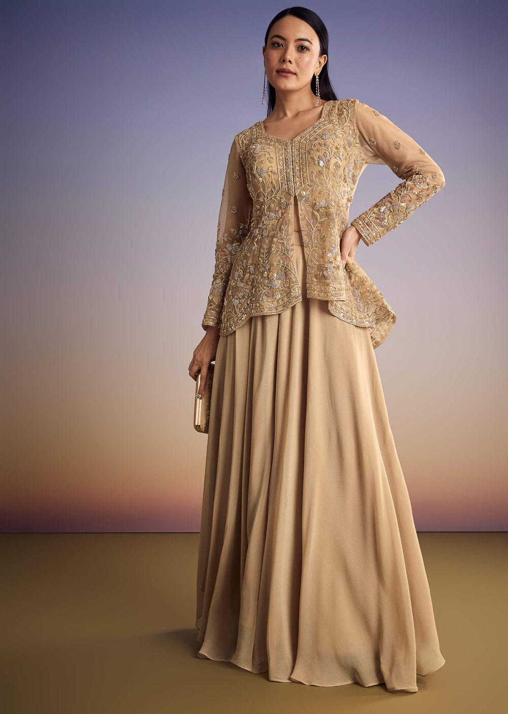 Beige Net Peplum Kurta Set With Beads And Sequins Work