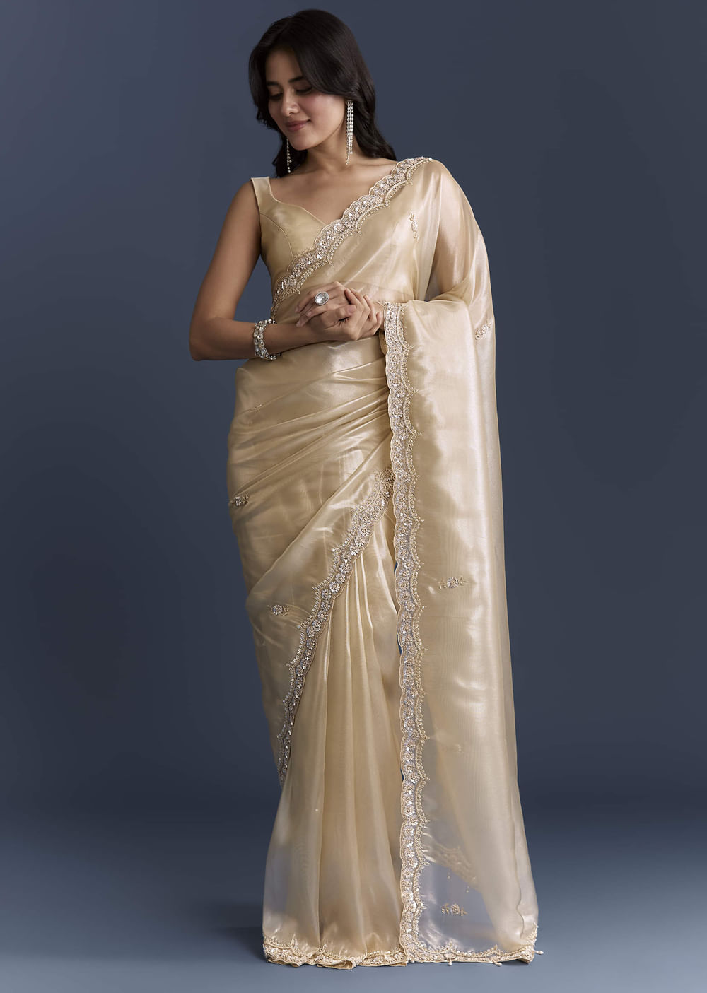 Soft neutrals meet statement craft in this beige net saree, where butti and a scalloped edge are hand-embroidered with cutdana, zardosi, sequins and moti. The net base keeps the look light even with rich detailing. You feel poised, polished and ready for festive occasions. Awarded as the Most Trusted Brand, we're delivering styles you love, just as promised.