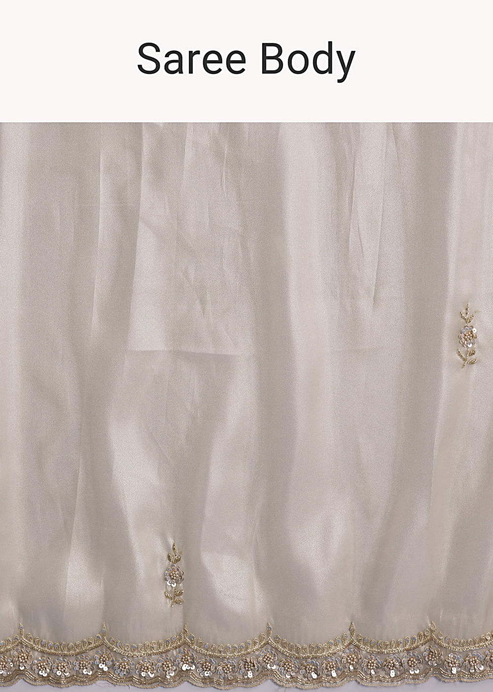 Soft neutrals meet statement craft in this beige net saree, where butti and a scalloped edge are hand-embroidered with cutdana, zardosi, sequins and moti. The net base keeps the look... More Product Details