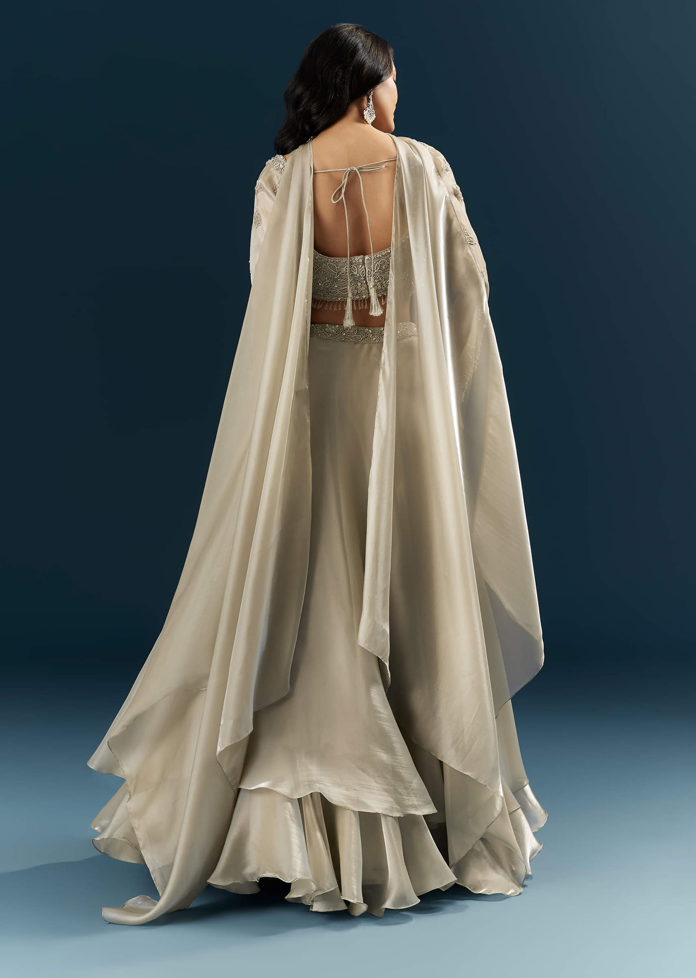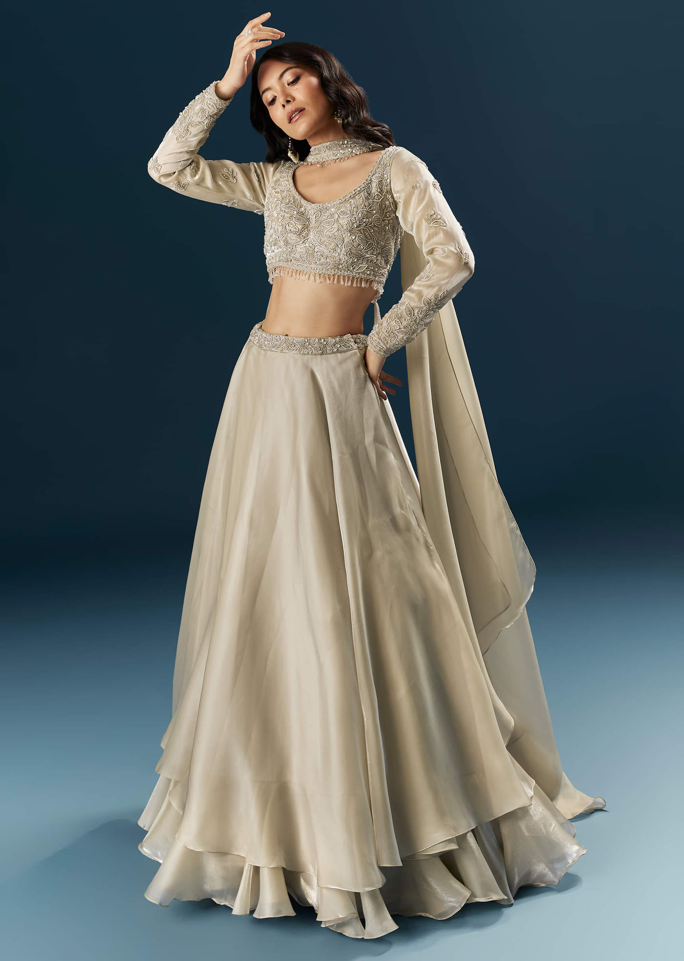 The lehenga should feel light and easy while the dupatta rests comfortably on the shoulder.