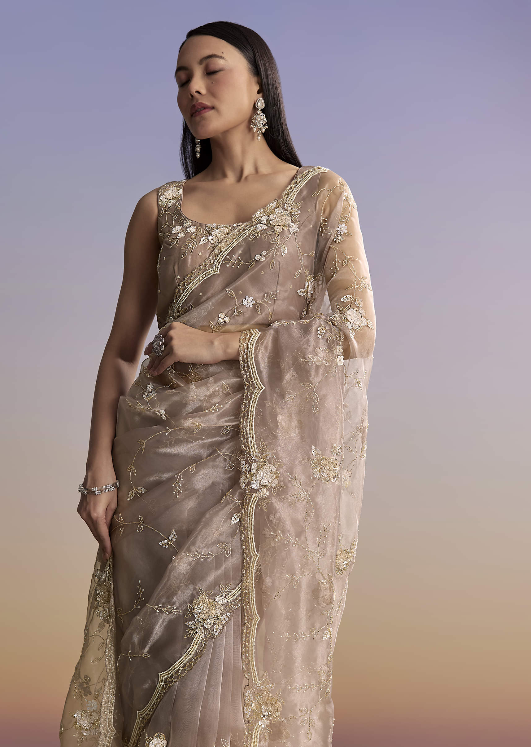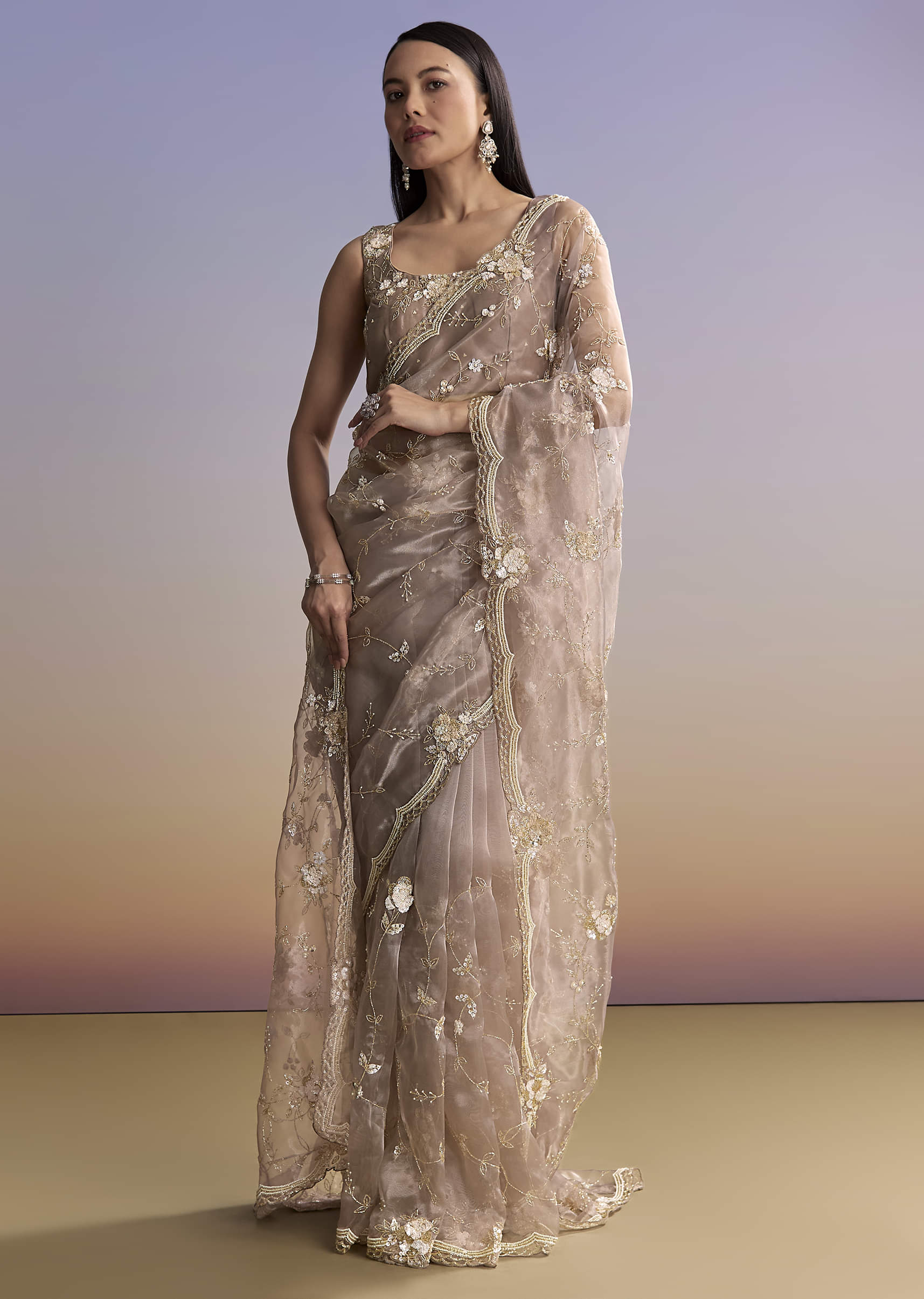 Graceful and light, this beige organza embroidered saree feels airy and chic. The scallop border, floral jaal, and heavy handwork in moti, cutdana, sequins, and beads bring richness to every fold. It lets you shine at a reception or sangeet without taking the spotlight away. Awarded as the Most Trusted Brand, we're delivering styles you love, just as promised.