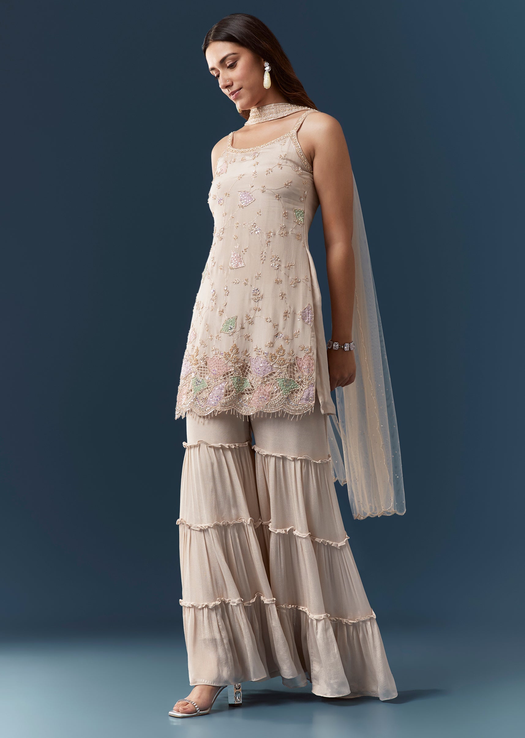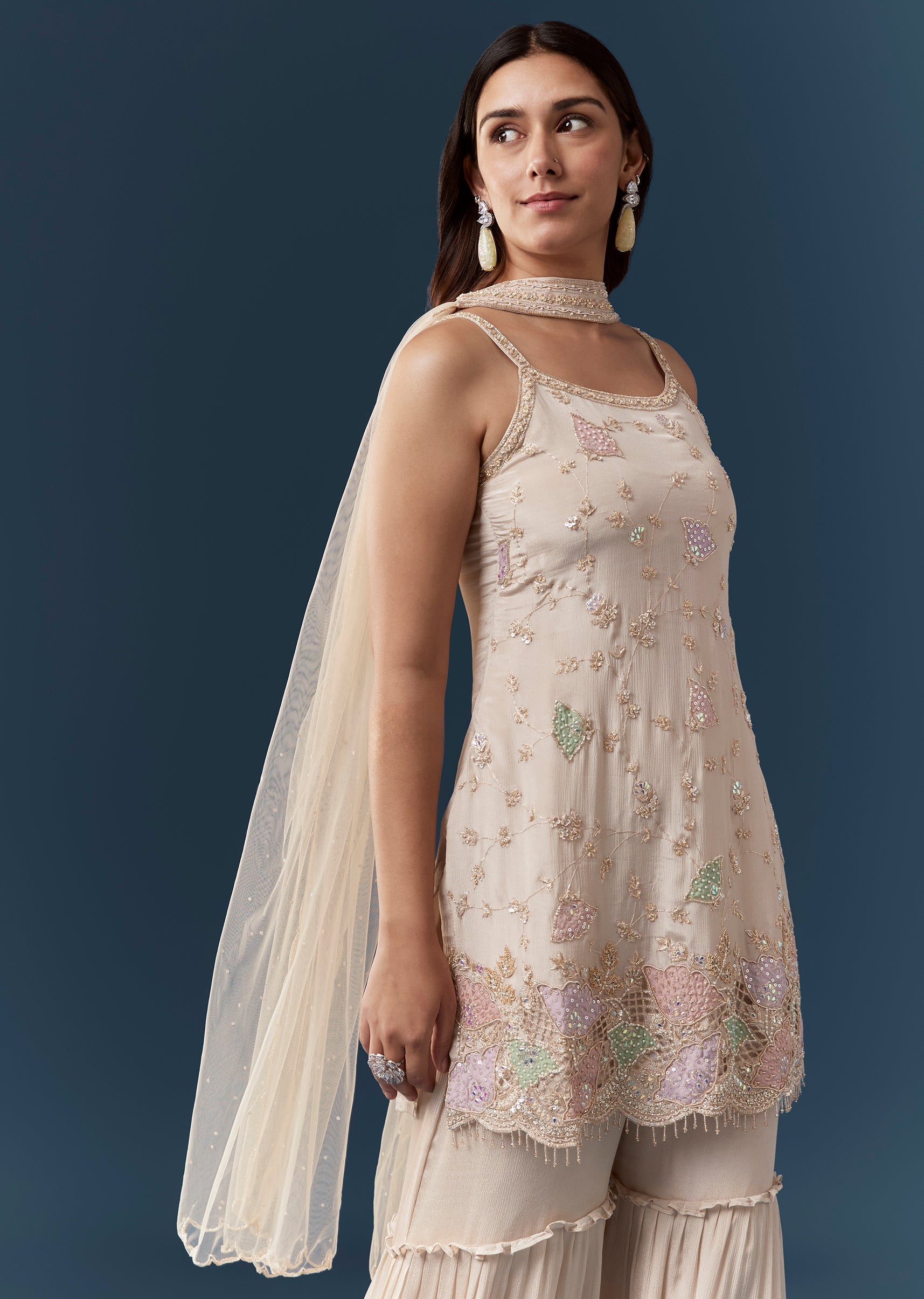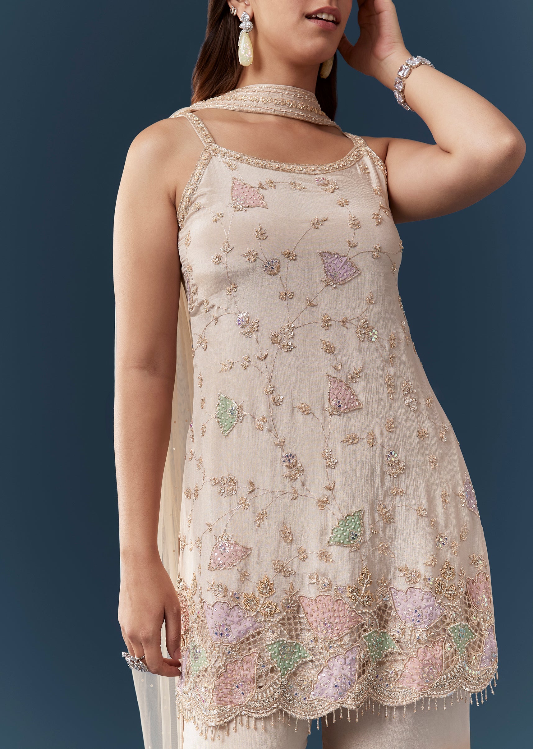 Add graceful festive charm to your wardrobe with this beige chinon kurta set embellished with patch work, shimmering sequins, moti accents, and intricate zari detailing that create a beautifully ornate... More Product Details