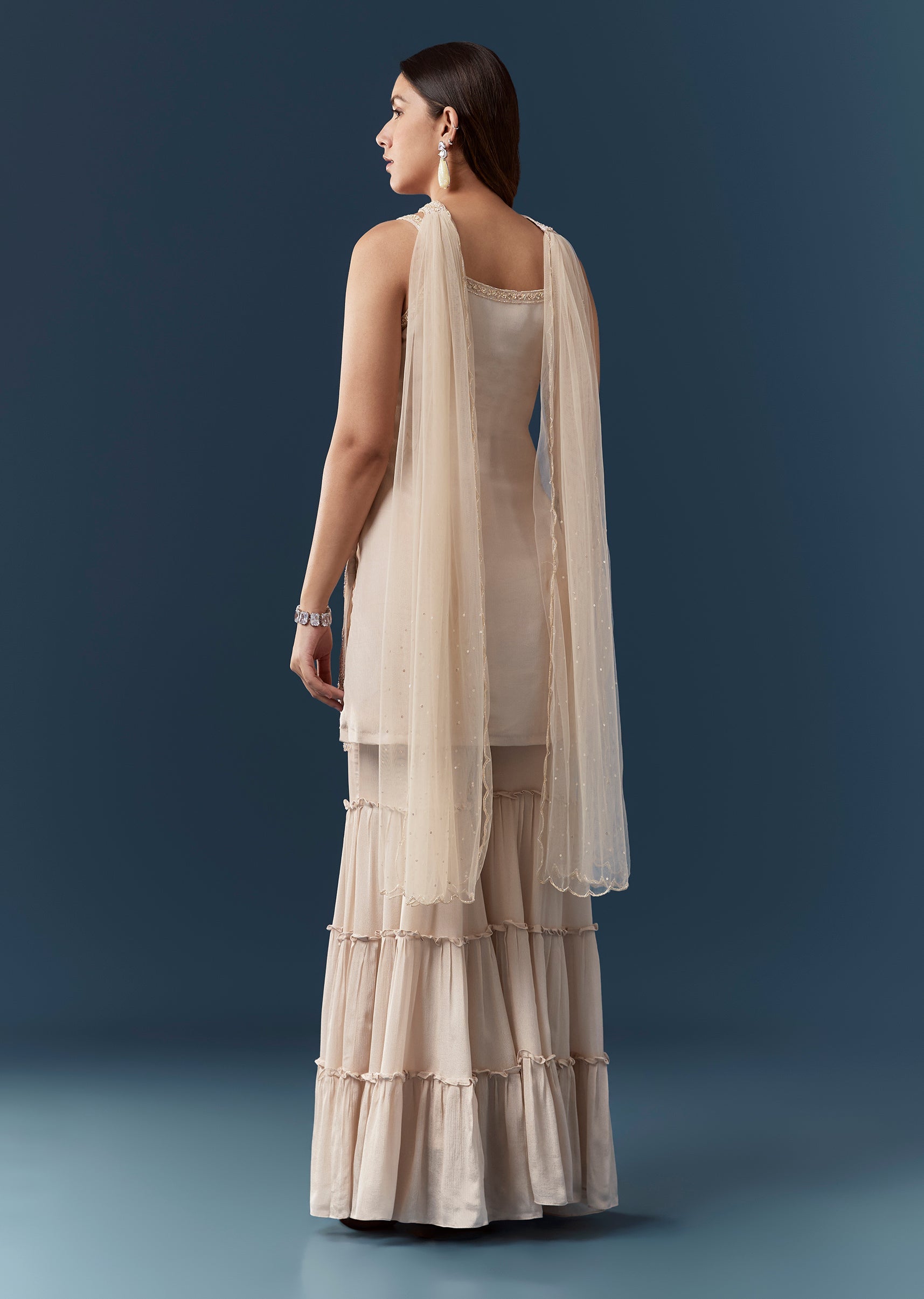 Ensure the kurta fits comfortably at the bust and neckline and check that the sharara rests securely at the waist for easy graceful movement.