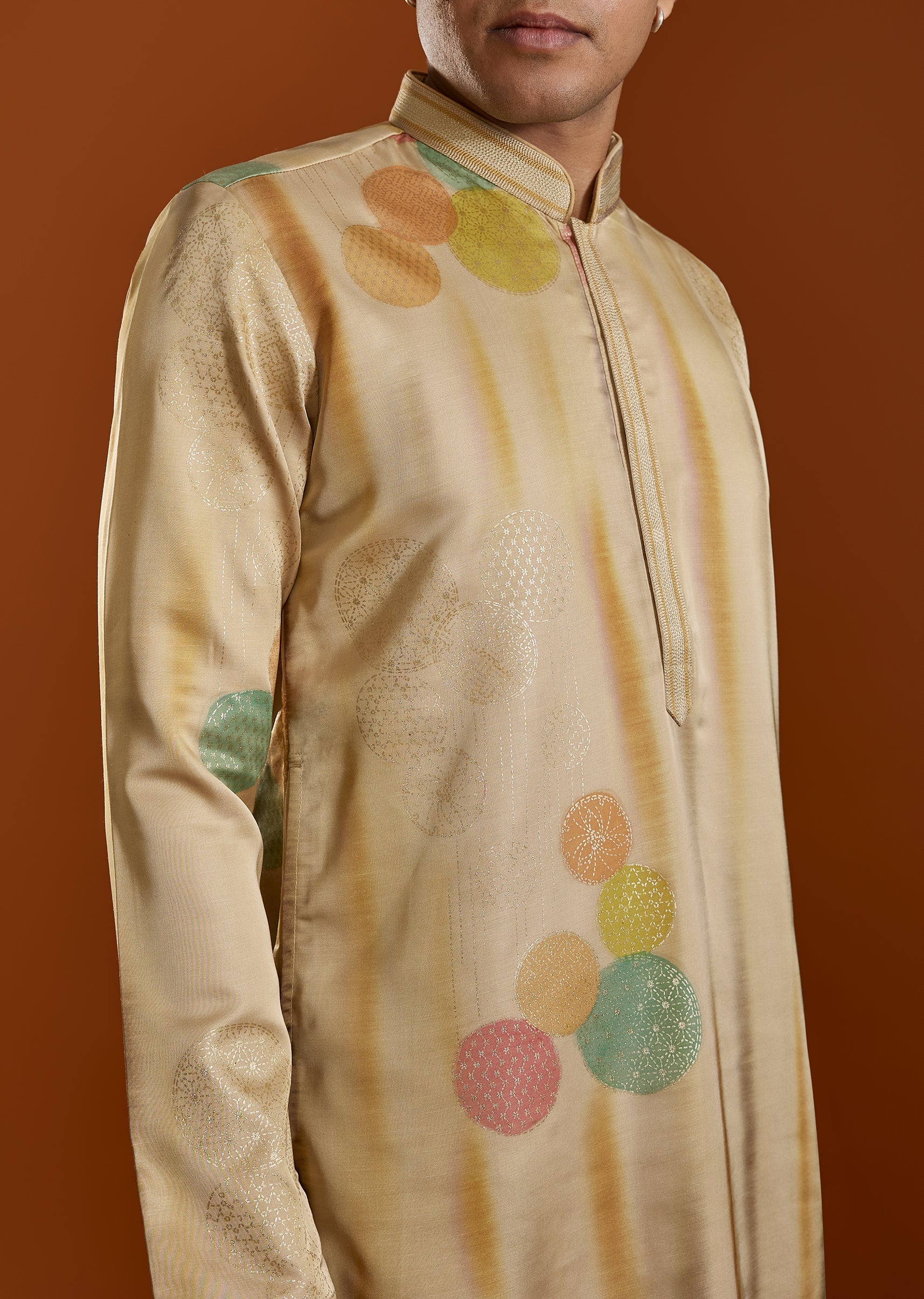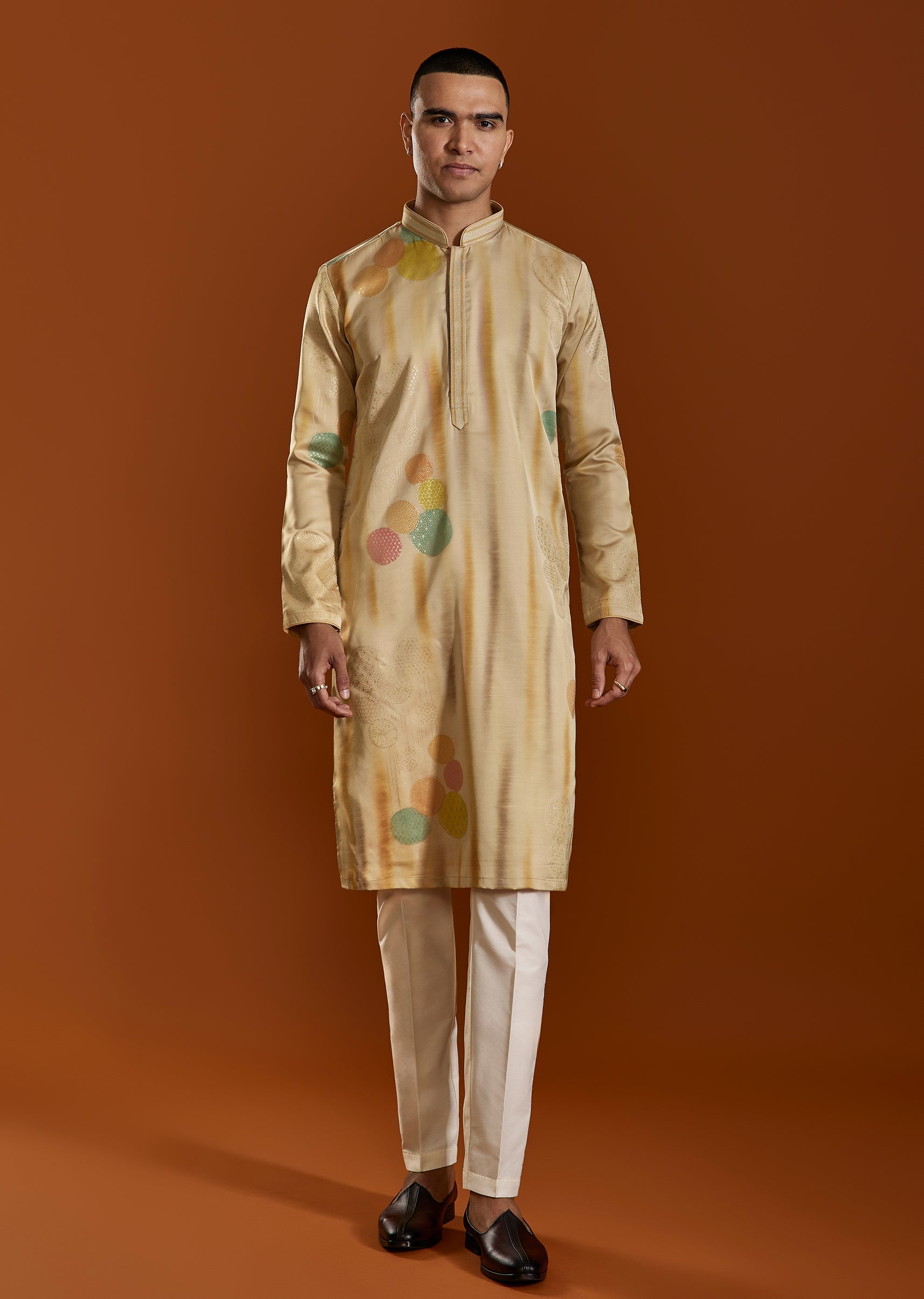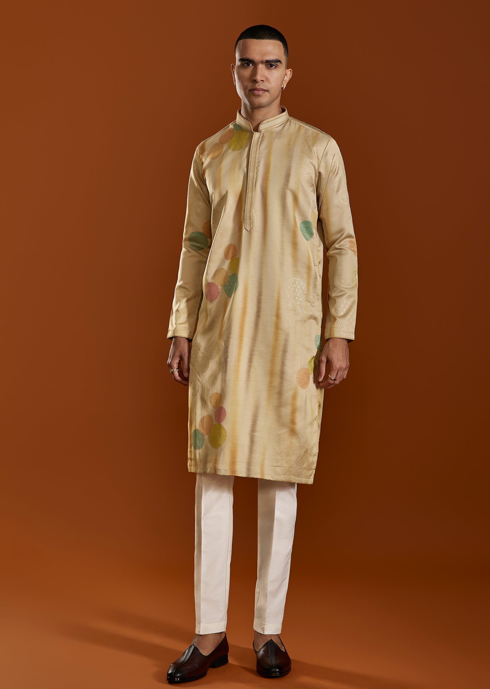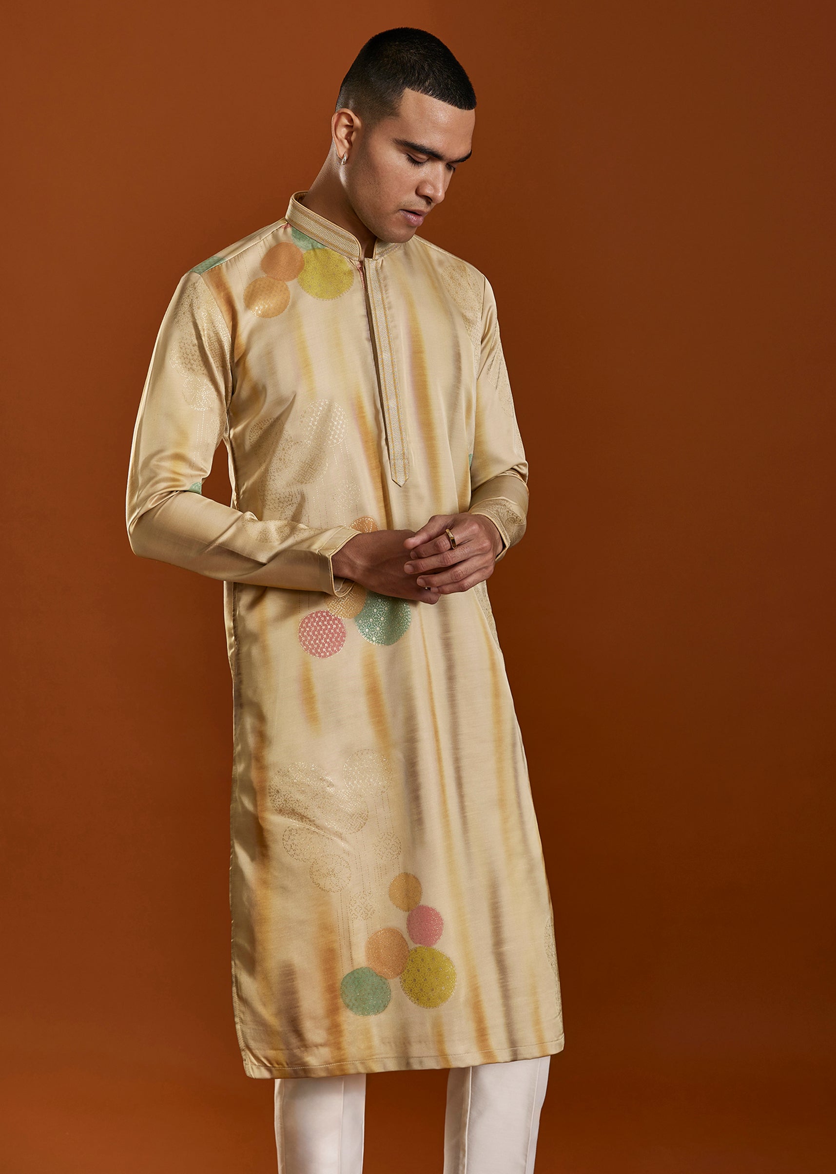 A sophisticated beige kurta set crafted in Viscose and enhanced with a subtle printed design. Featuring a classic mandarin collar and straight pants, it offers effortless elegance for festive and casual celebrations. Awarded as the Most Trusted Brand, we're delivering styles you love, just as promised.