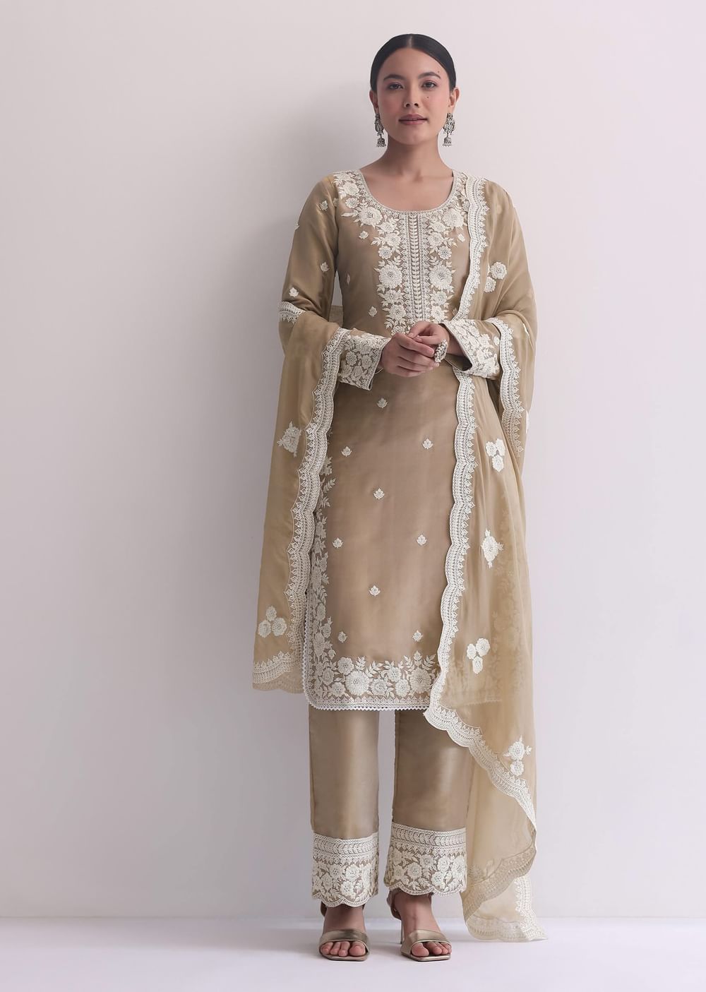 Beige Resham Threadwork Embroiderd Kurti Pant Set In Organza