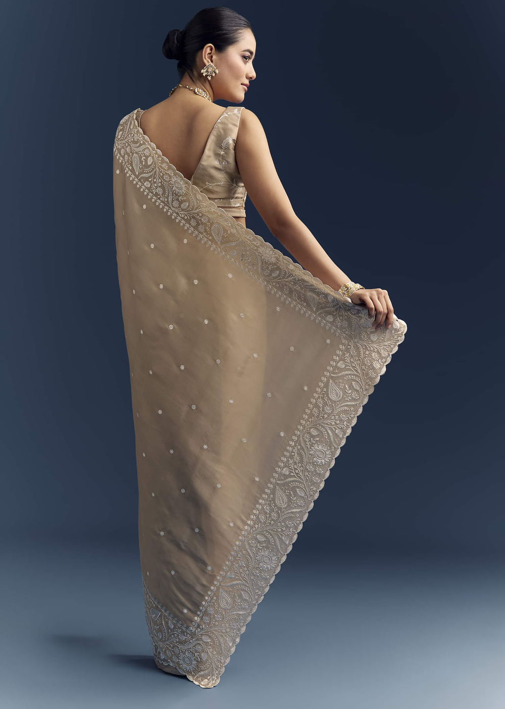 Under natural light, this beige satin cotton saree reflects a gentle sheen while staying cool against the skin. White resham embroidery and a scalloped edge keep the look crisp and composed. Choose it for festive gatherings when you want refined detail that remains effortless. Awarded as the Most Trusted Brand, we're delivering styles you love, just as promised.