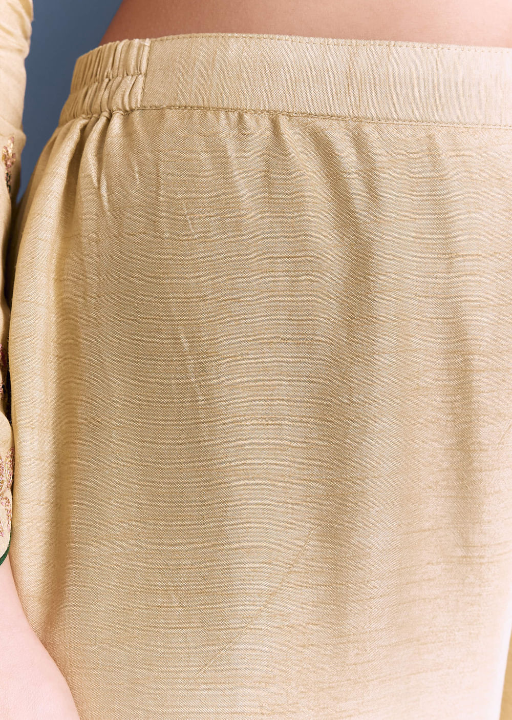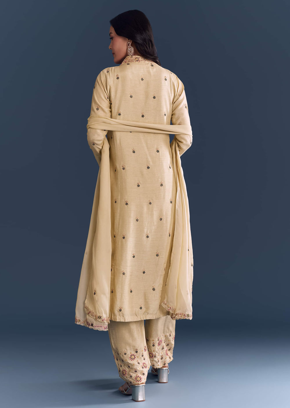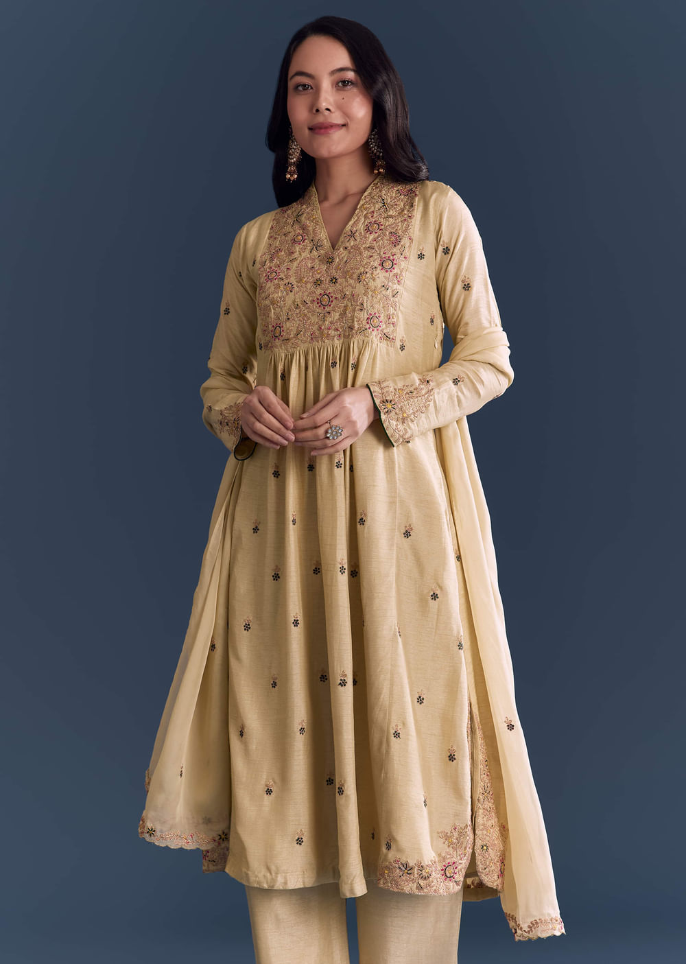 For ceremonies that ask for grace, this beige silk anarkali suit pairs gentle sheen with classic craft. Zari embroidery decorates the set to add ceremonial polish without weight. You feel... More Product Details