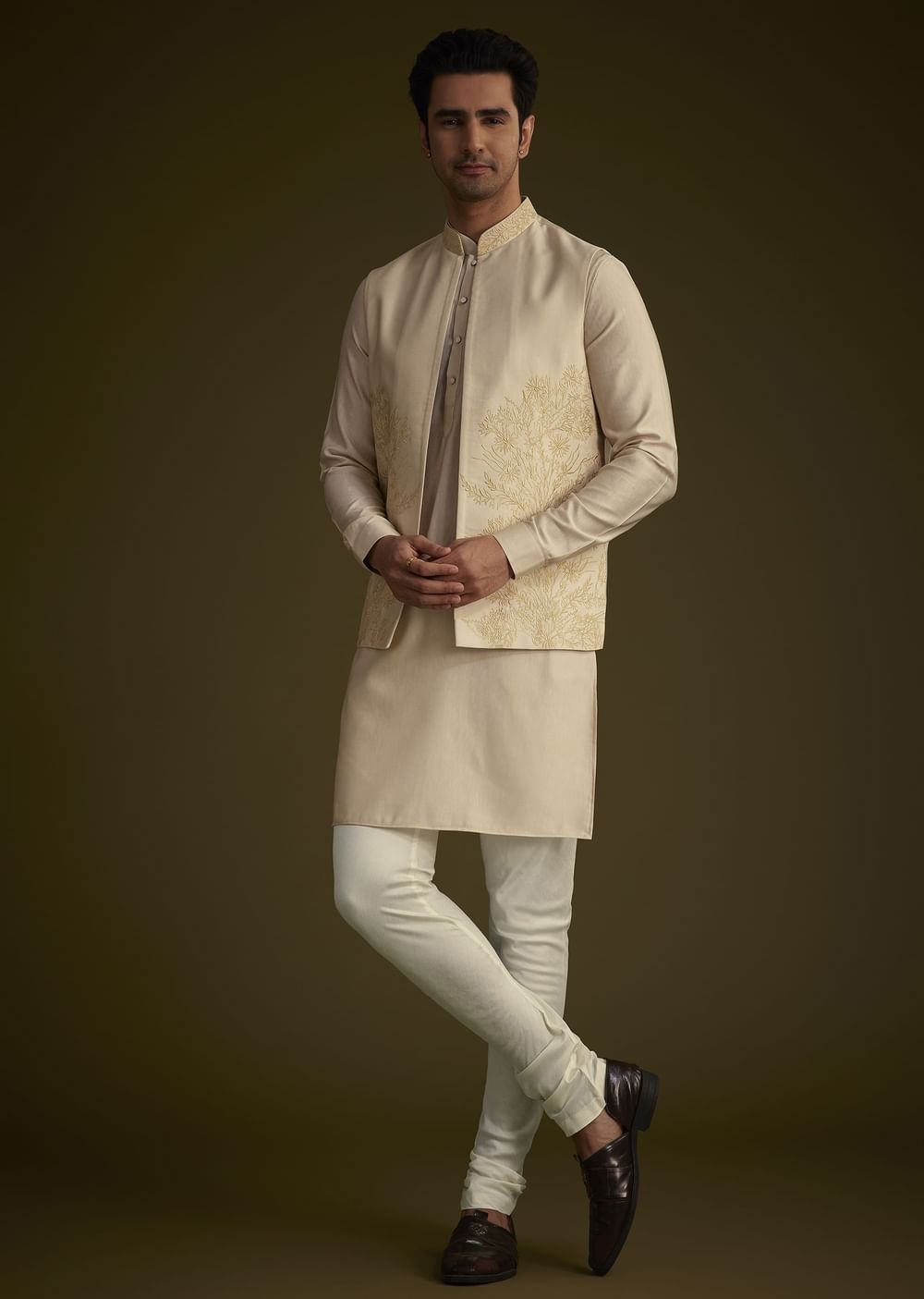 Beige Silk Blend Kurta Set With Embroidered Nehru Jacket