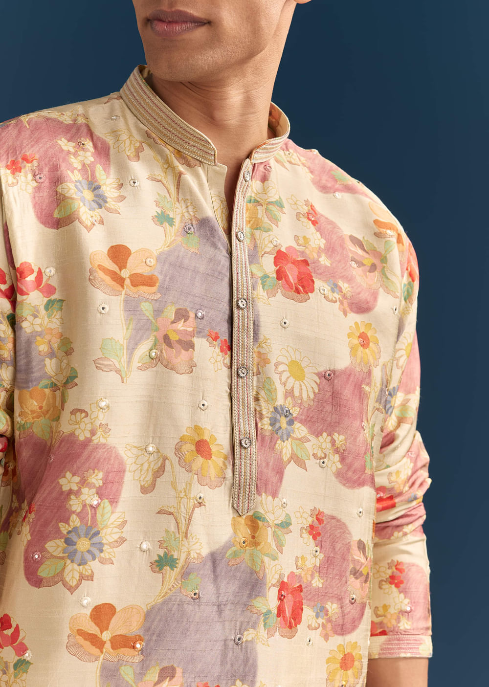 Beige Silk Floral Kurta Set For Men With Mirror Embroidery