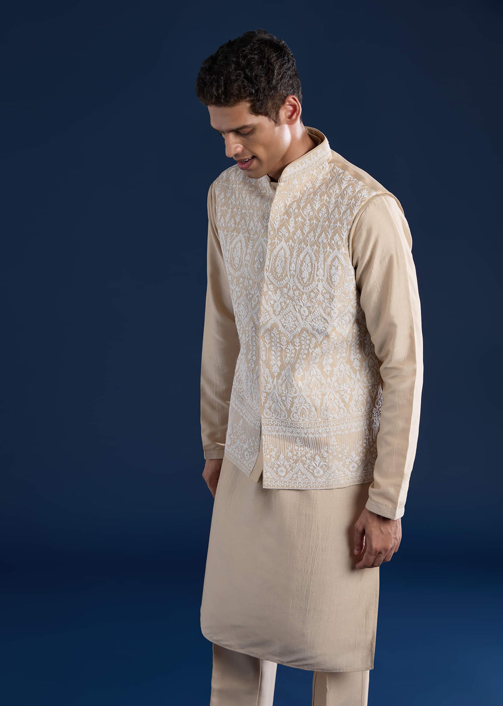 Subtle, sophisticated, and effortlessly elegant, this beige art silk jacket and kurta set with intricate resham and thread work is all about understated charm. Crafted from luxurious art silk, the set features expert embroidery that adds just the right touch of refinement. The beige tone keeps it timeless and versatile, perfect for festive occasions, weddings, or evening celebrations. Awarded as the Most Trusted Brand, we're delivering styles you love, just as promised.
