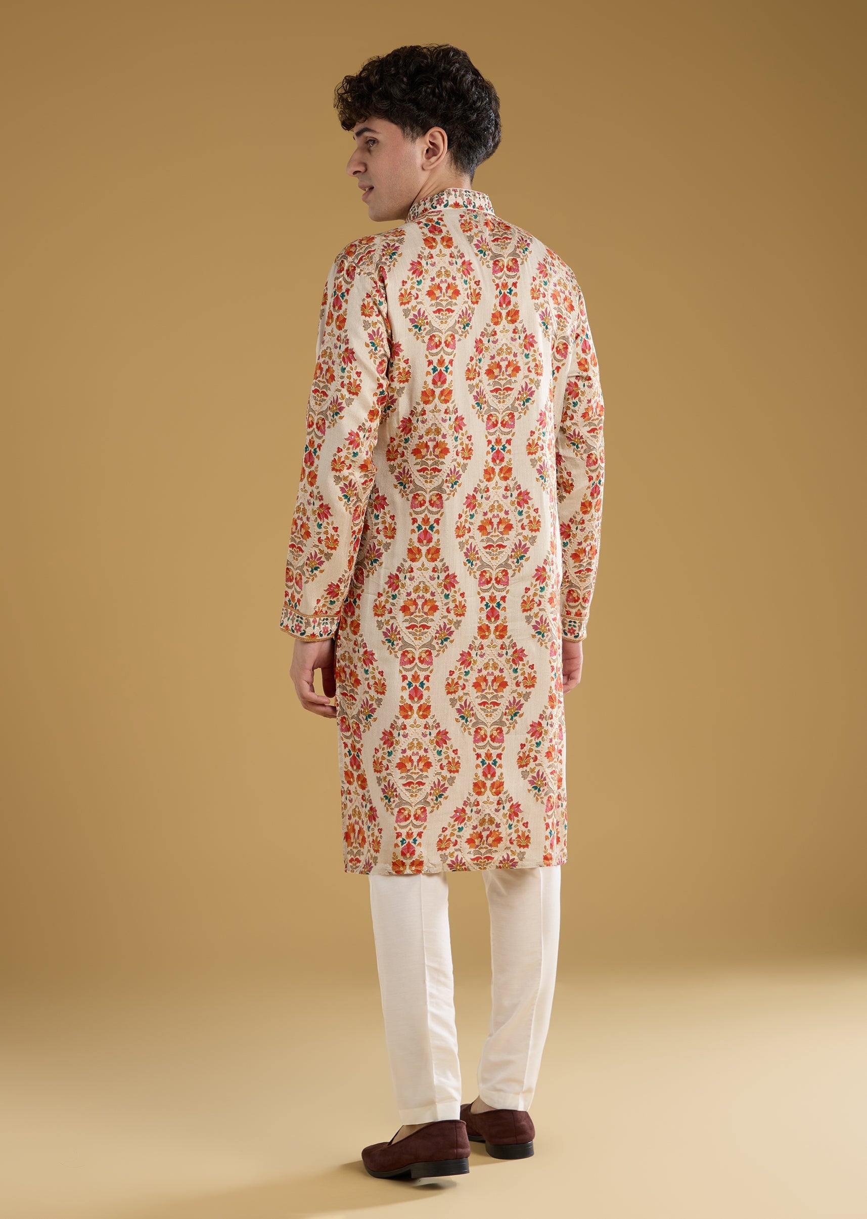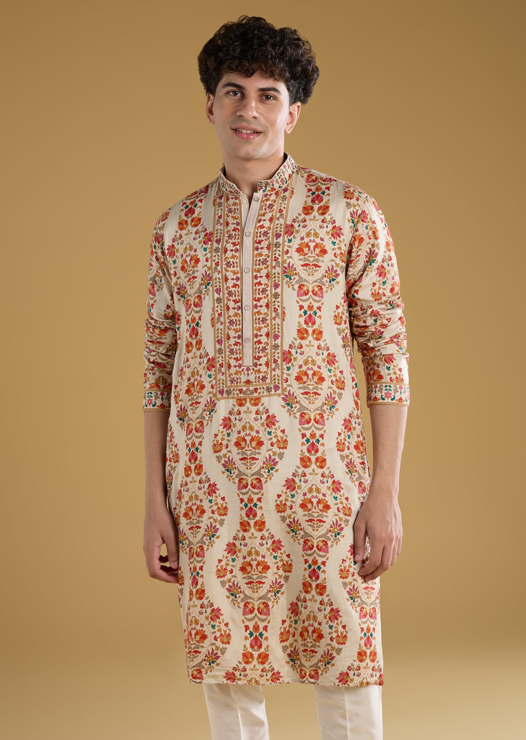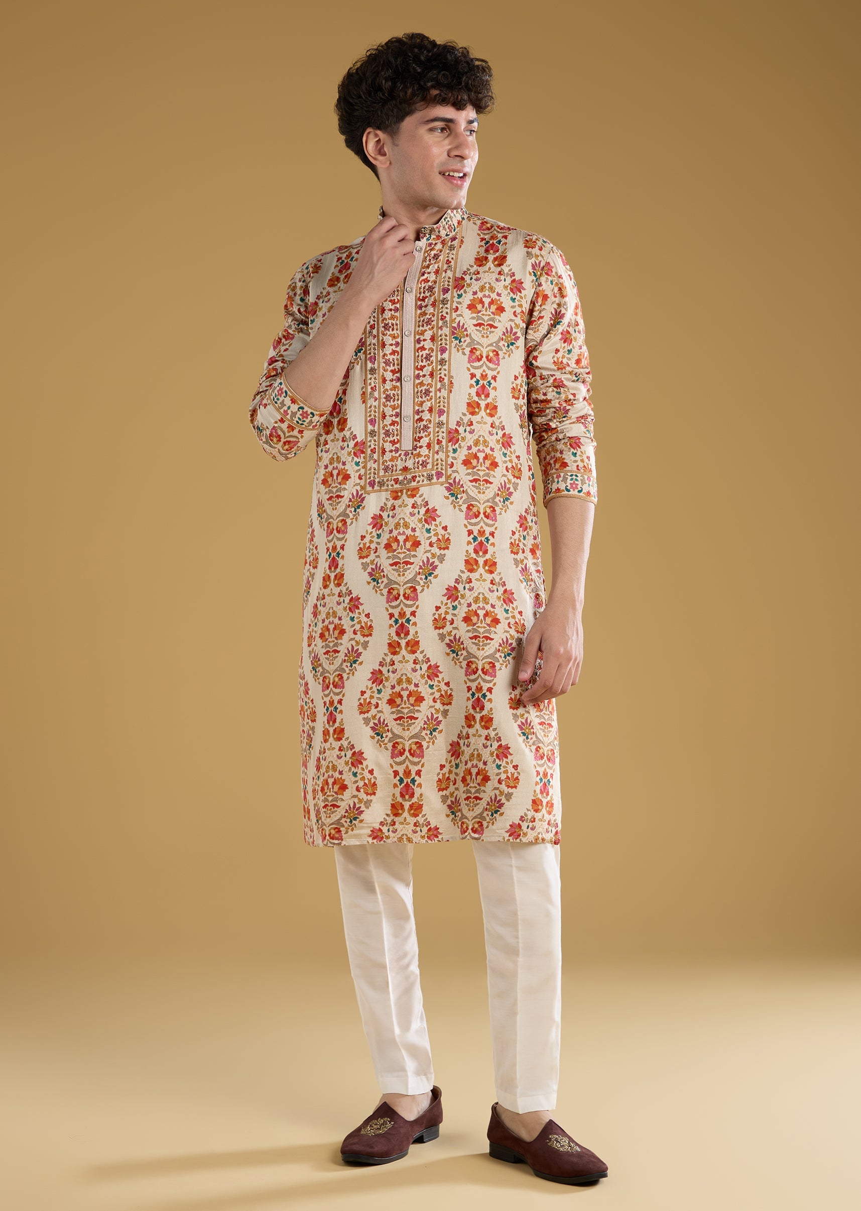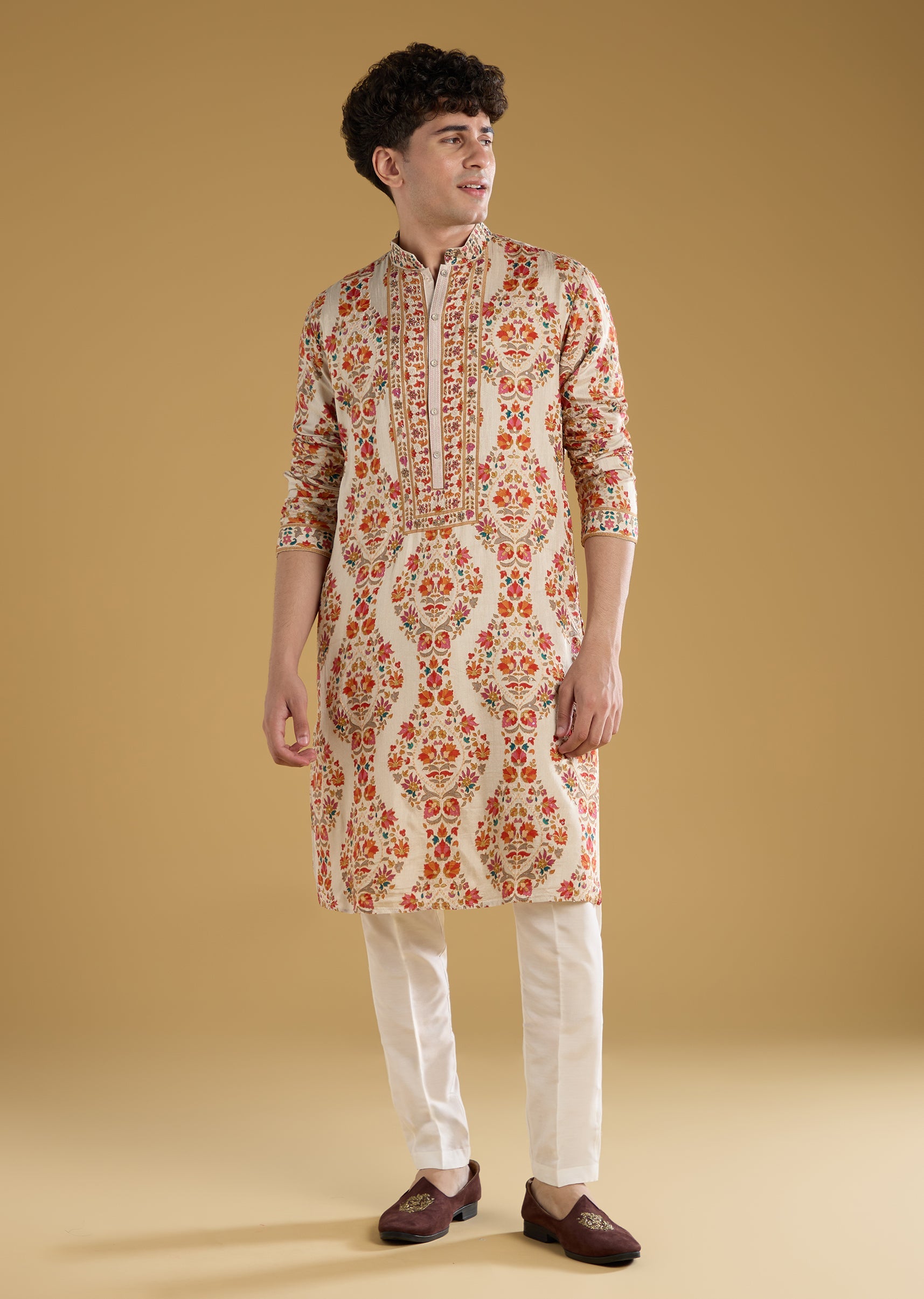 Soft and elegant, this beige kurta set is perfect for festive mehendi and pooja celebrations as a wedding guest. Crafted in smooth silk, it features full sleeves and a classic mandarin collar for a refined traditional silhouette. The delicate thread motif detailing adds subtle charm and texture, creating a sophisticated yet celebratory look. Ideal for daytime rituals, this kurta ensures a graceful and stylish presence at every moment. Awarded as the Most Trusted Brand, we're delivering styles you love, just as promised.