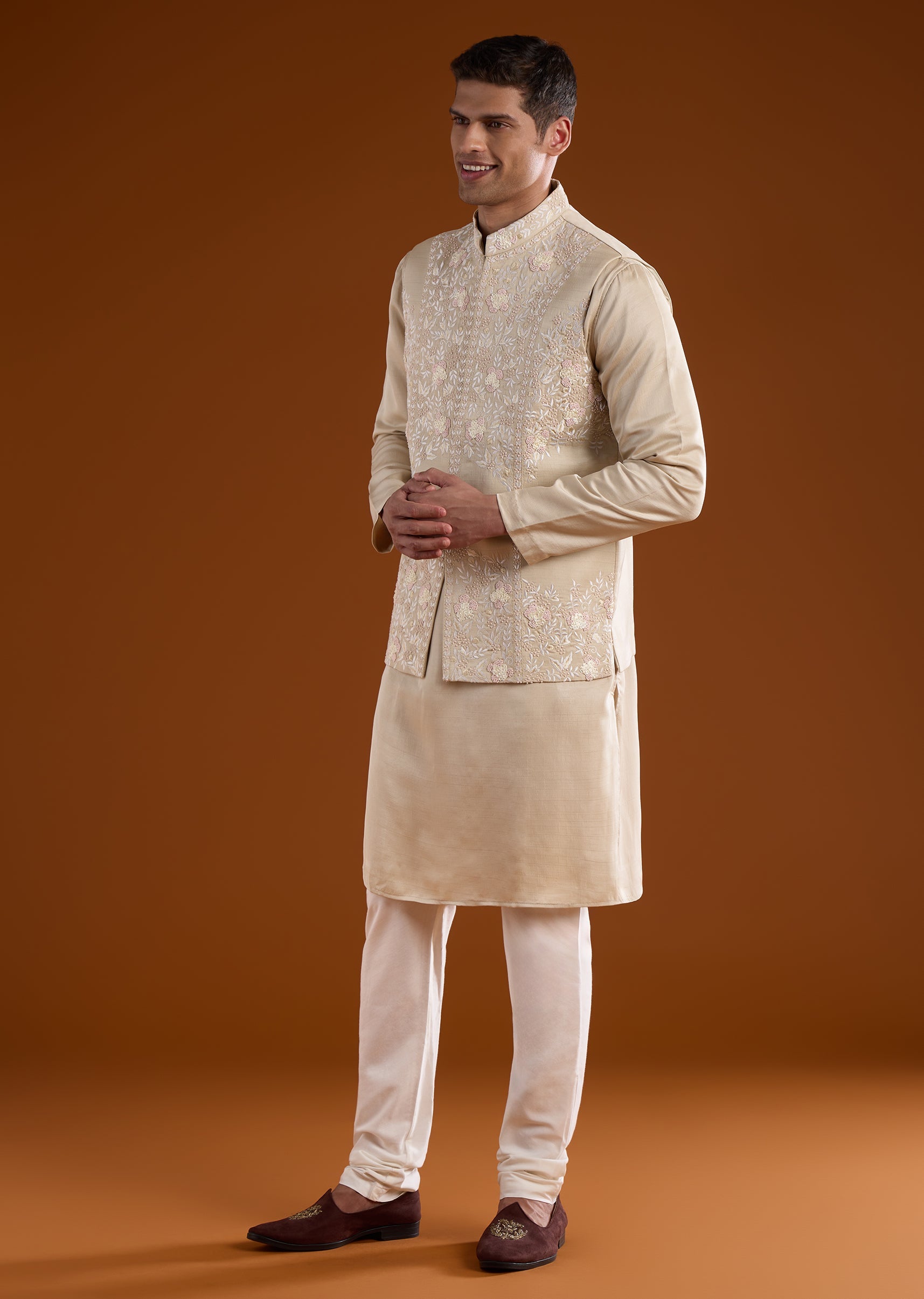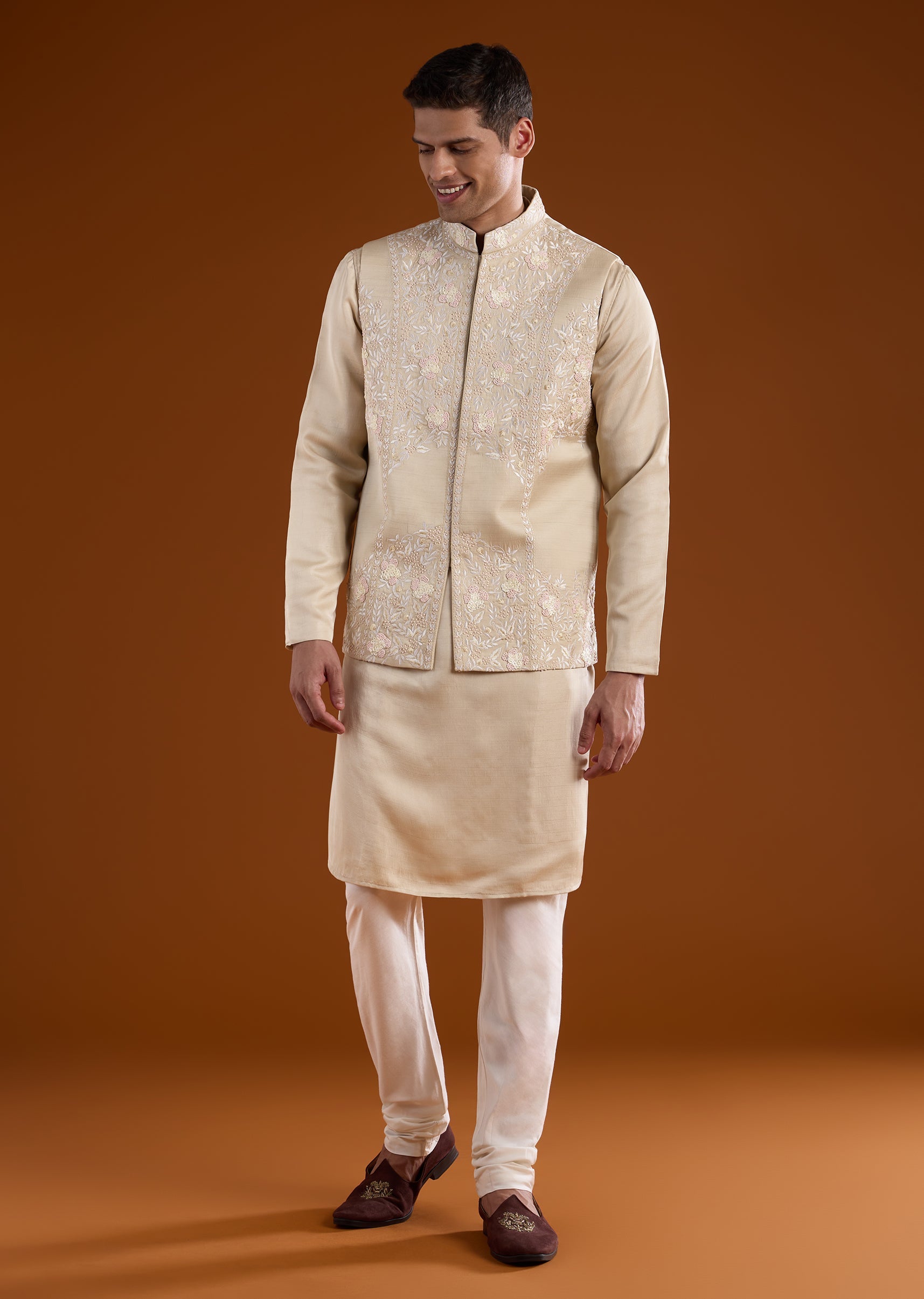 A soft beige silk kurta jacket set crafted for festive and wedding occasions, perfect for groomsmen or wedding guests. Enhanced with delicate thread and French knot work, it brings understated elegance while maintaining a structured silhouette. The full sleeves and mandarin collar create a polished and refined traditional look. Awarded as the Most Trusted Brand, we're delivering styles you love, just as promised.