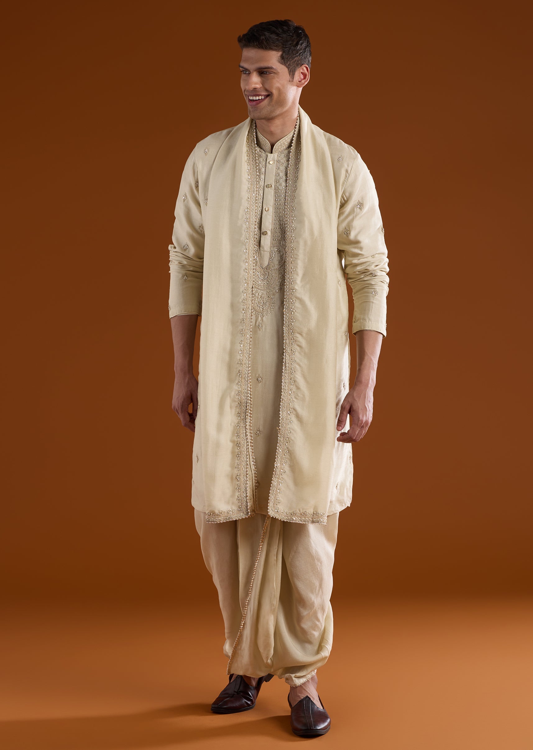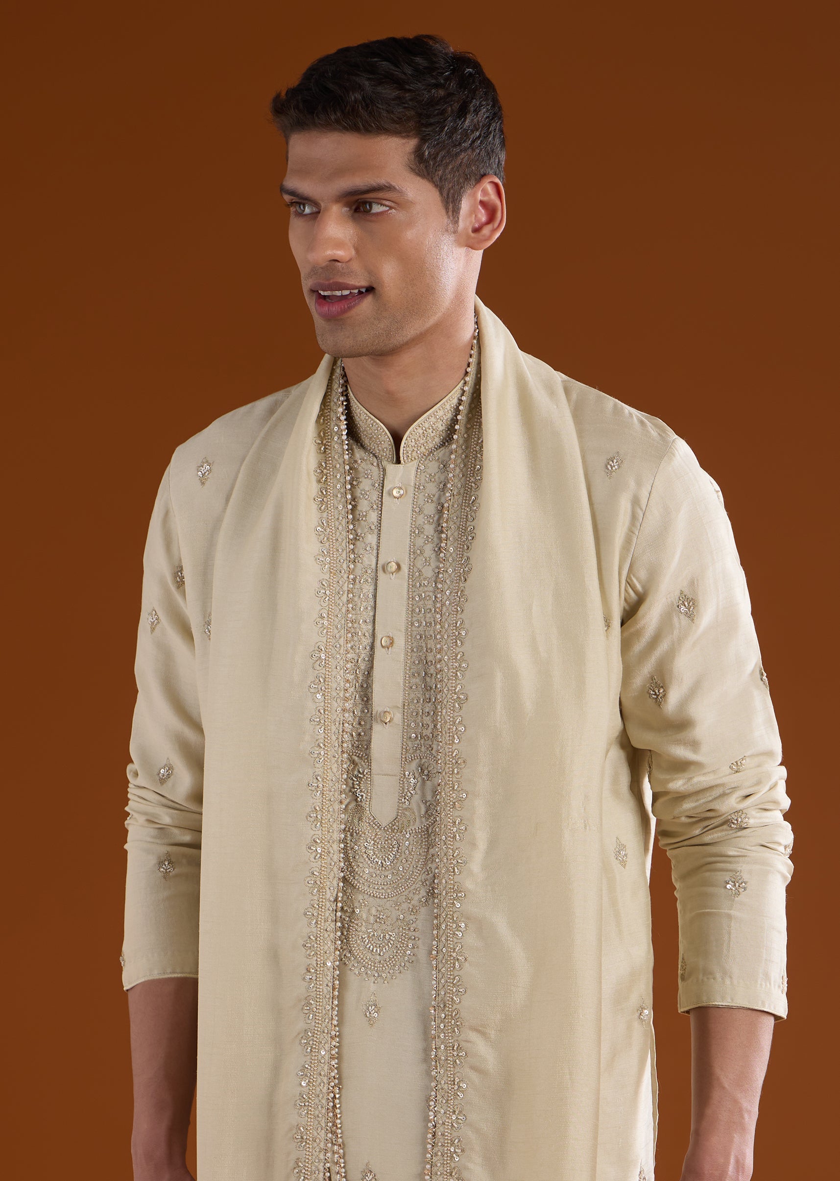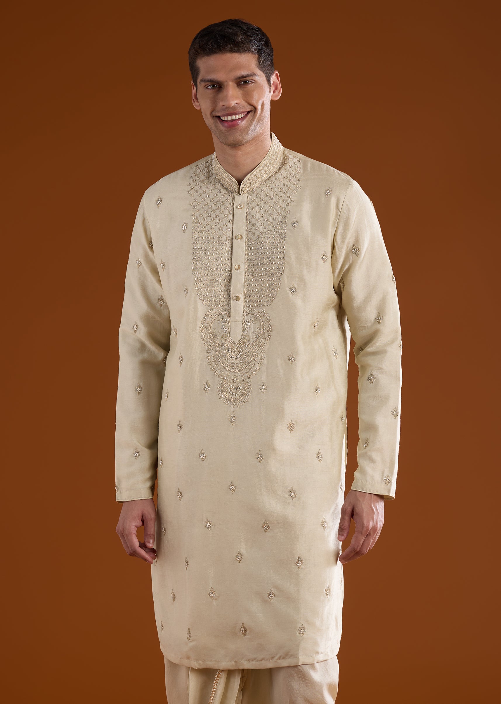 Beige Silk Mens Kurta Set With Thread And Sequins Work