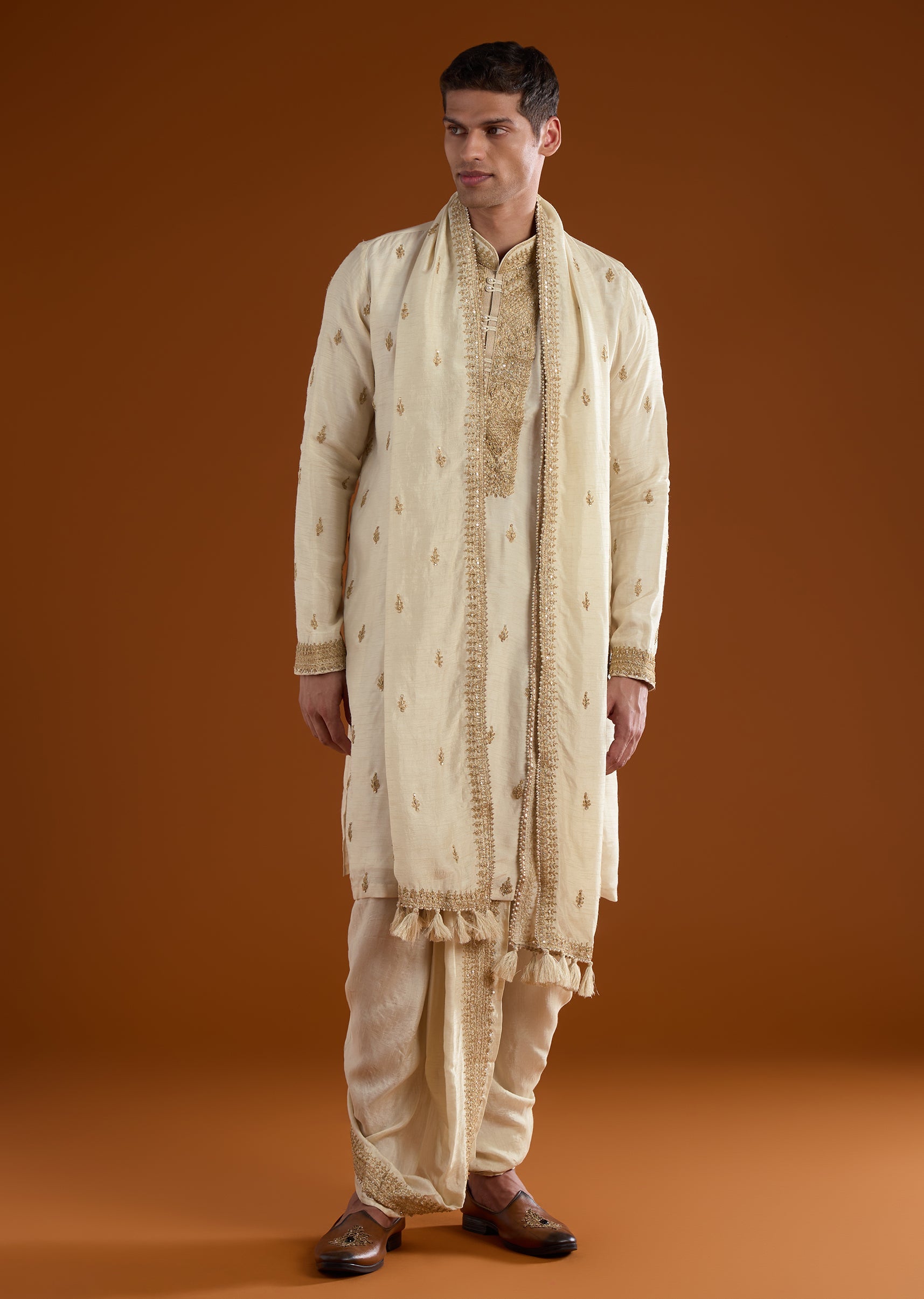 Beige Silk Mens Kurta Set With Thread Zari And Dori Work