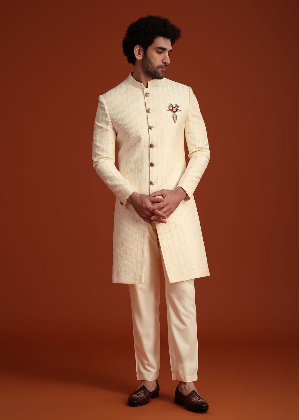Fit Tips:The tailored fit of this sherwani offers a sharp silhouette, ideal for slim to medium body types.