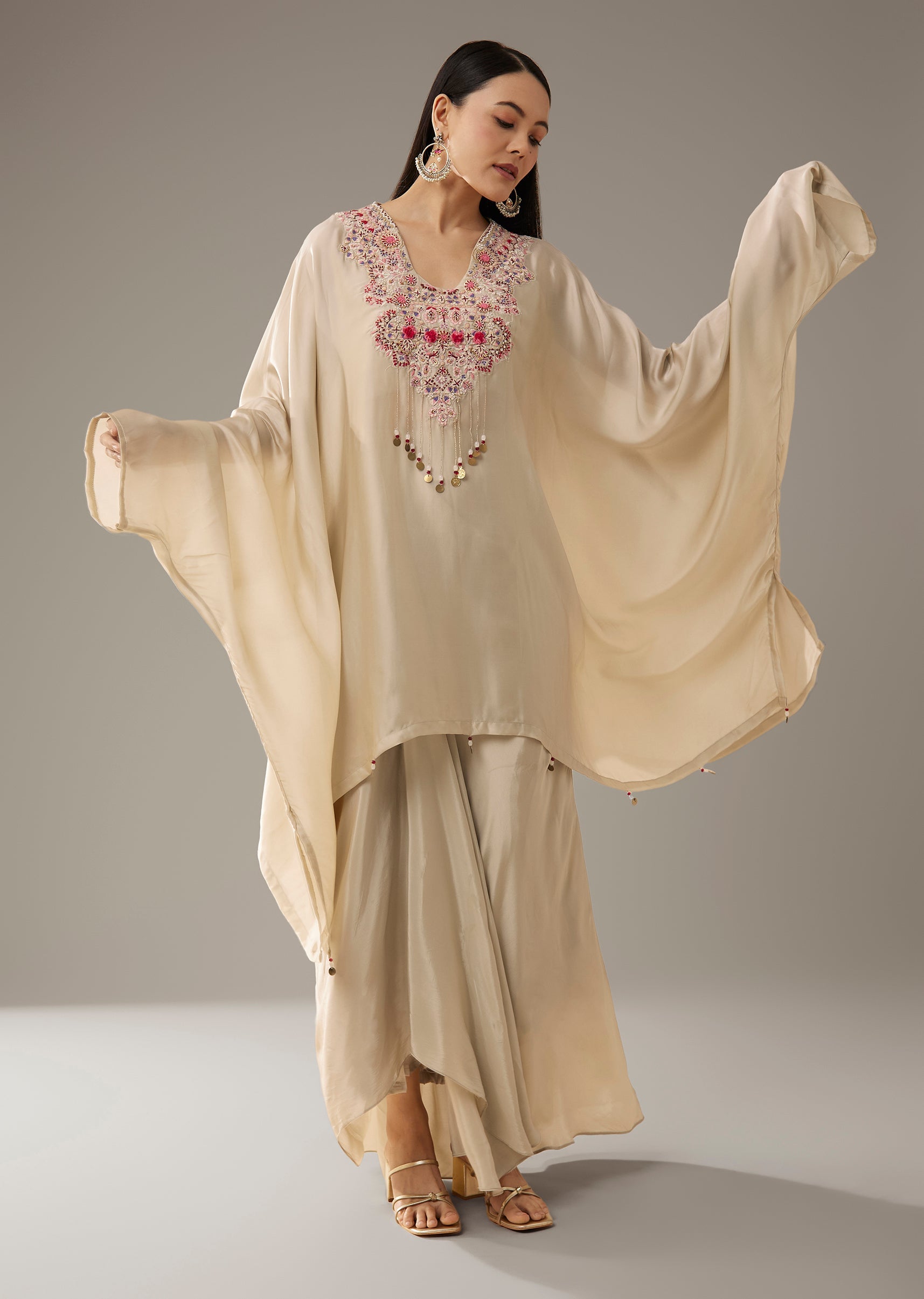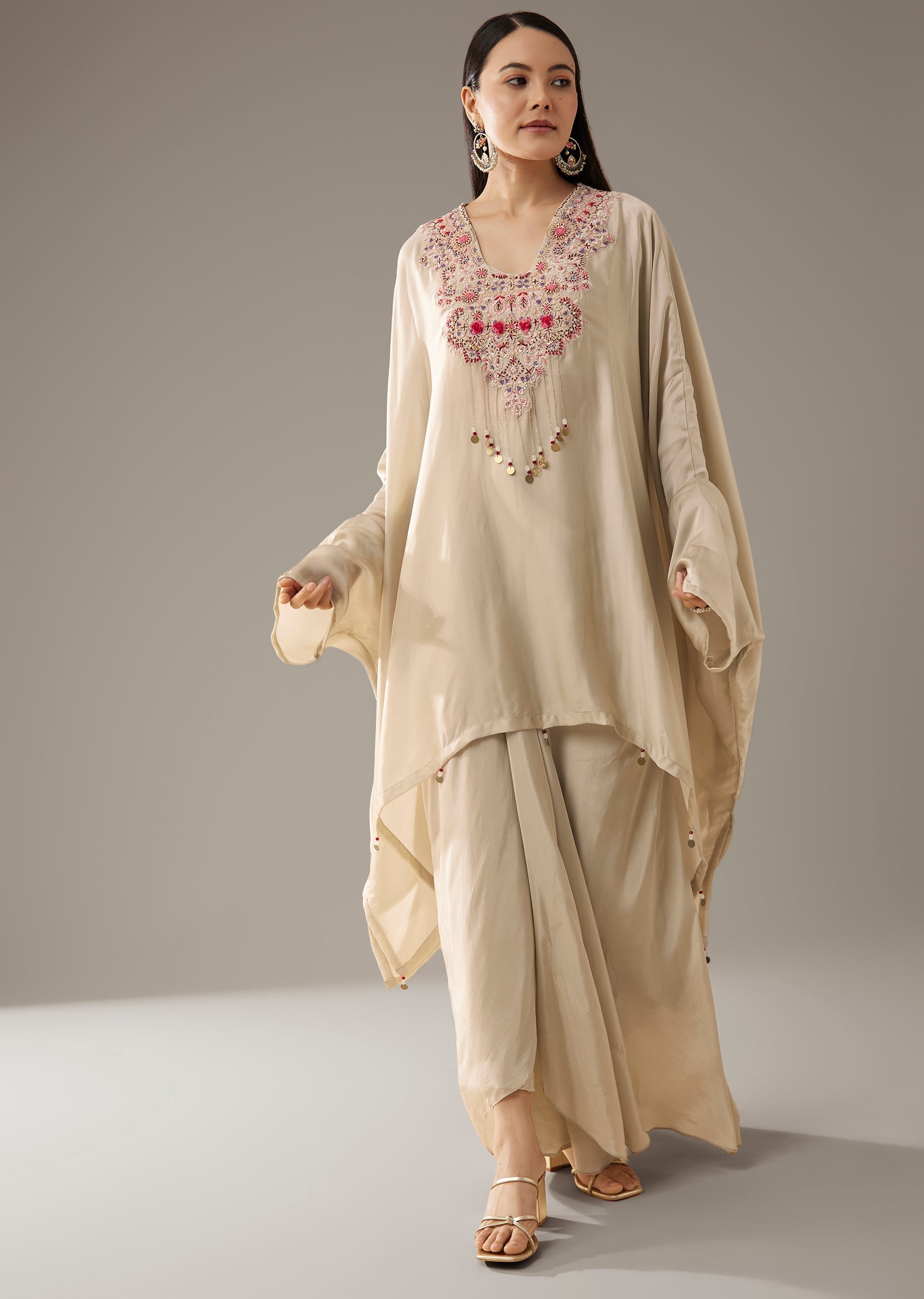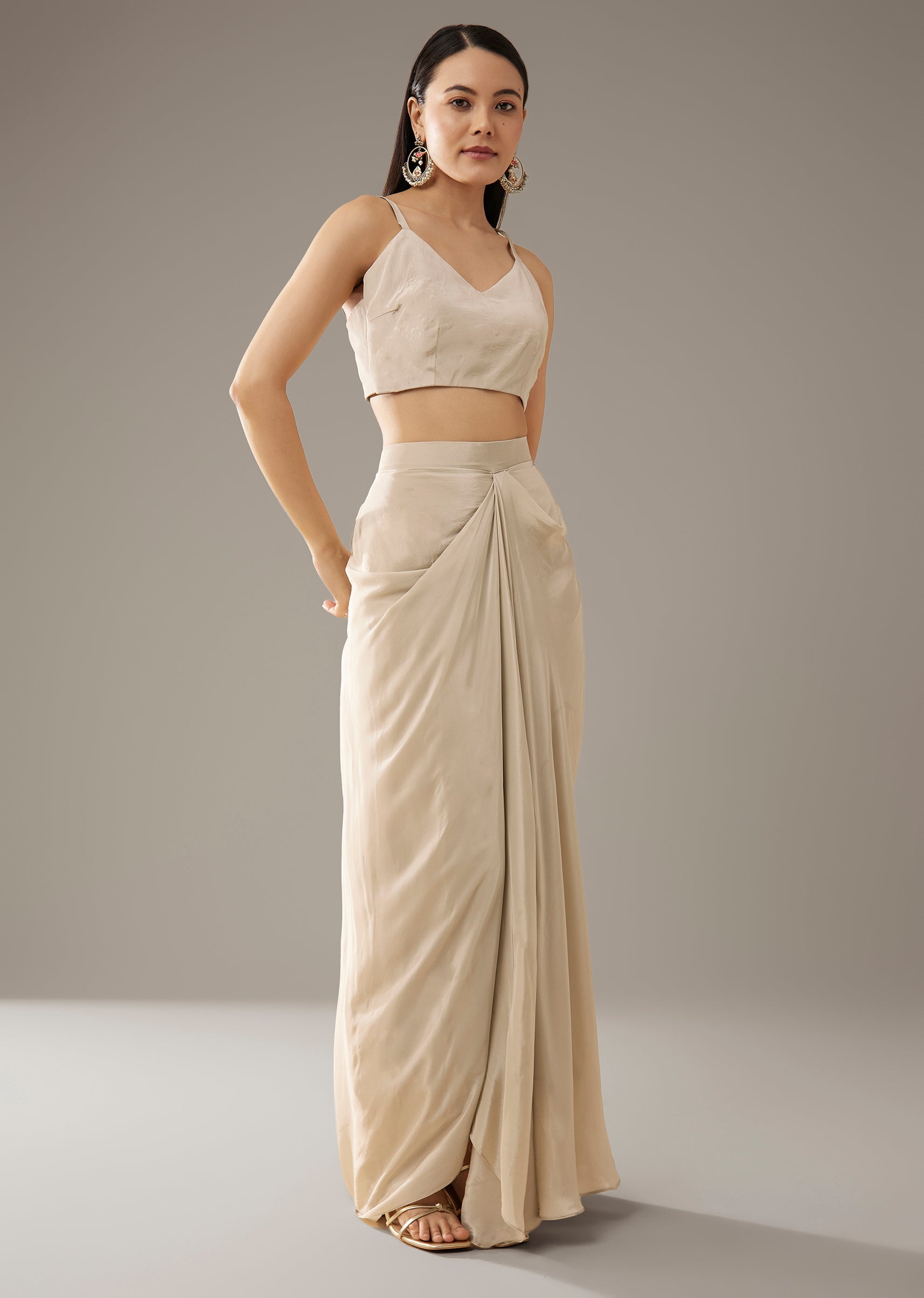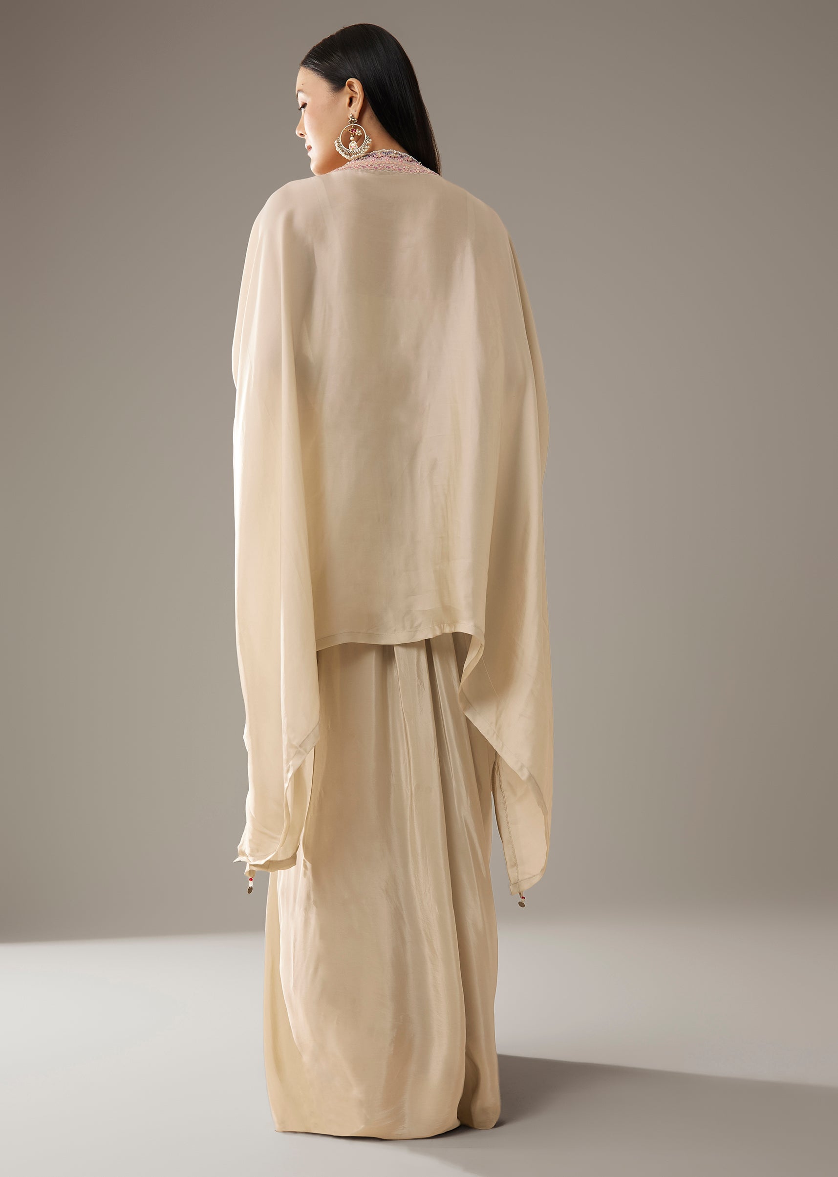 Beige Thread Embroidered Top and Dhoti Skirt Set