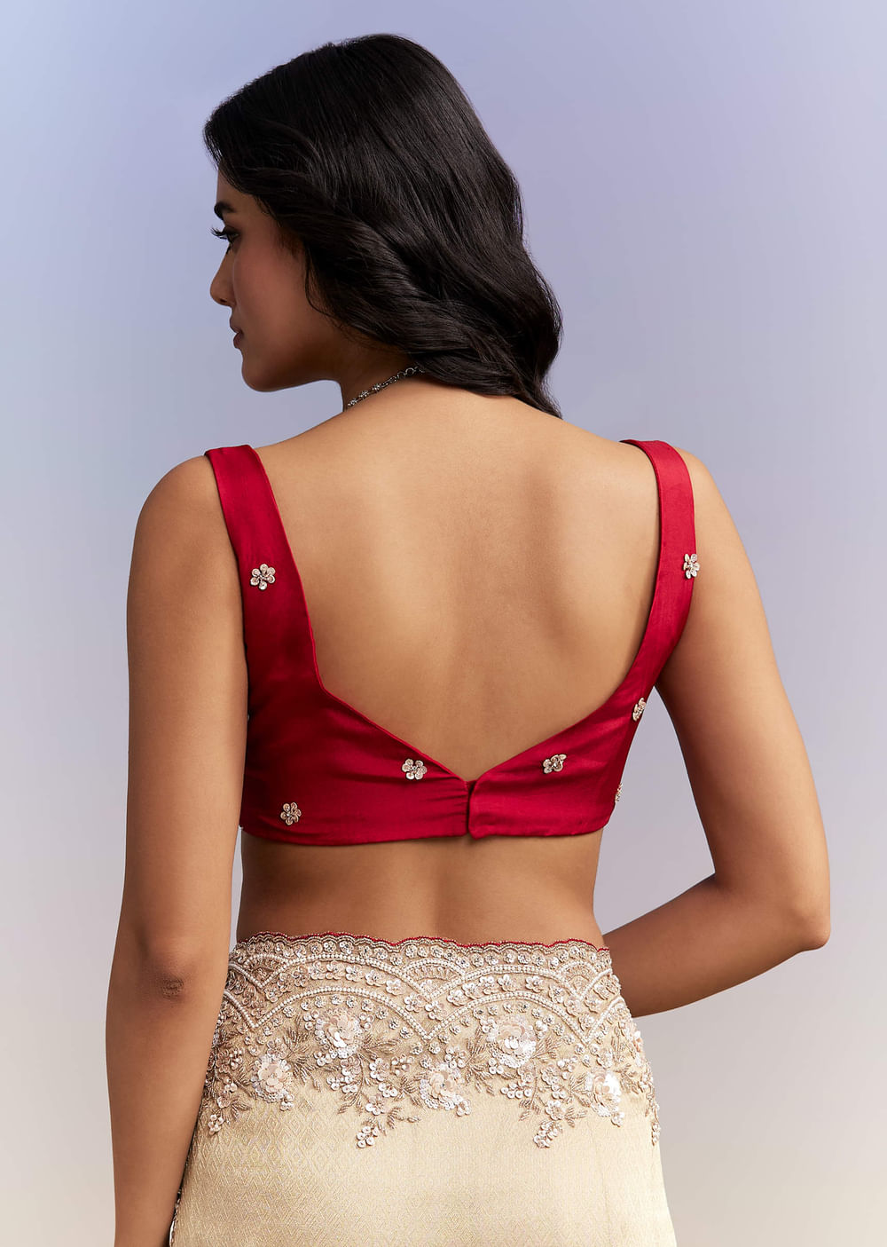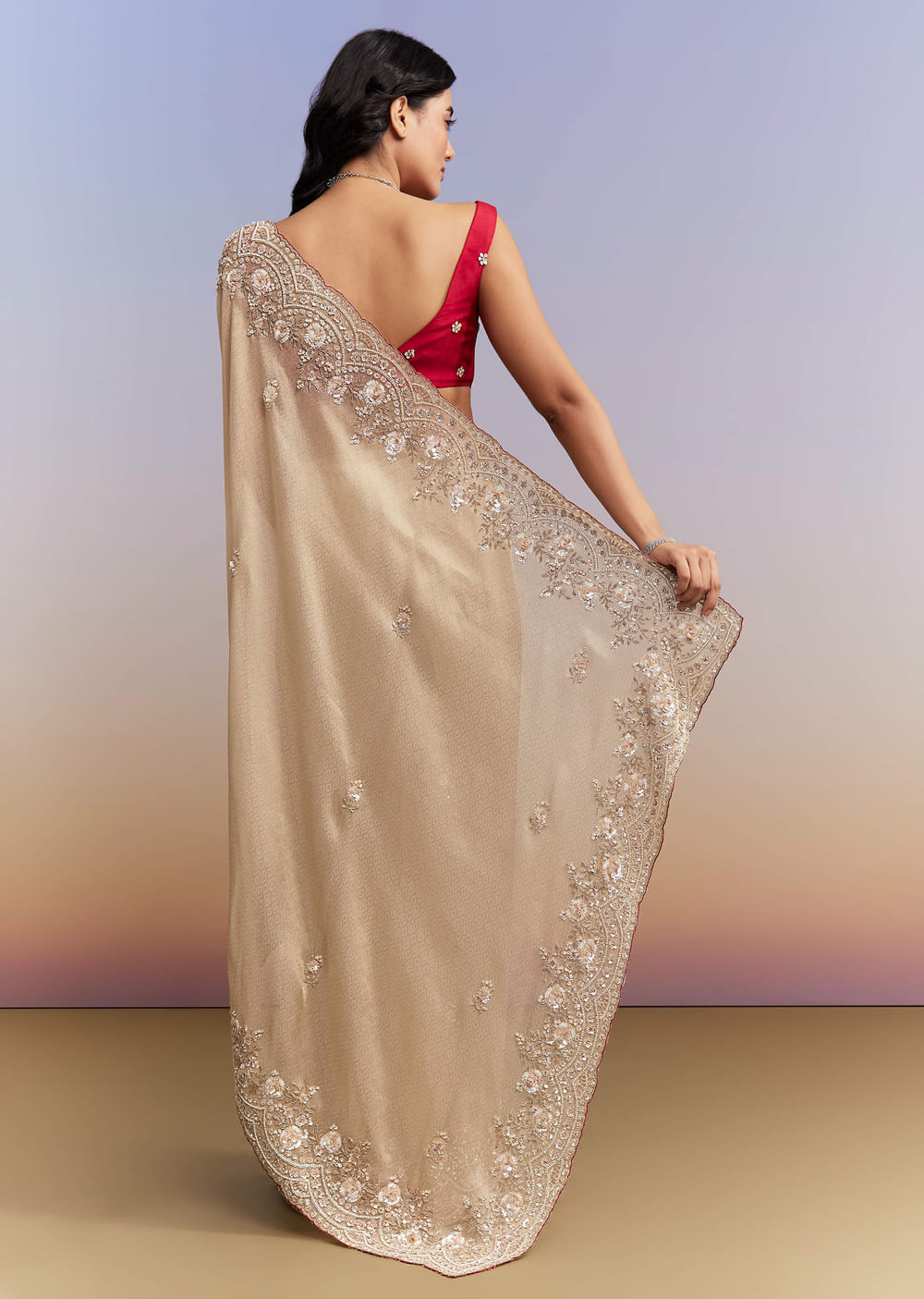 If you want neutral done luxuriously, this beige tissue jacquard saree brings quiet shine without looking heavy. A heavy floral embroidered scallop border meets floral buttis in cutdana, sequins and beads, finished with an embroidered contrast blouse fabric. You feel poised and beautifully composed as the bride’s mother for wedding, sangeet, mehendi and karwa chauth functions. Awarded as the Most Trusted Brand, we're delivering styles you love, just as promised.