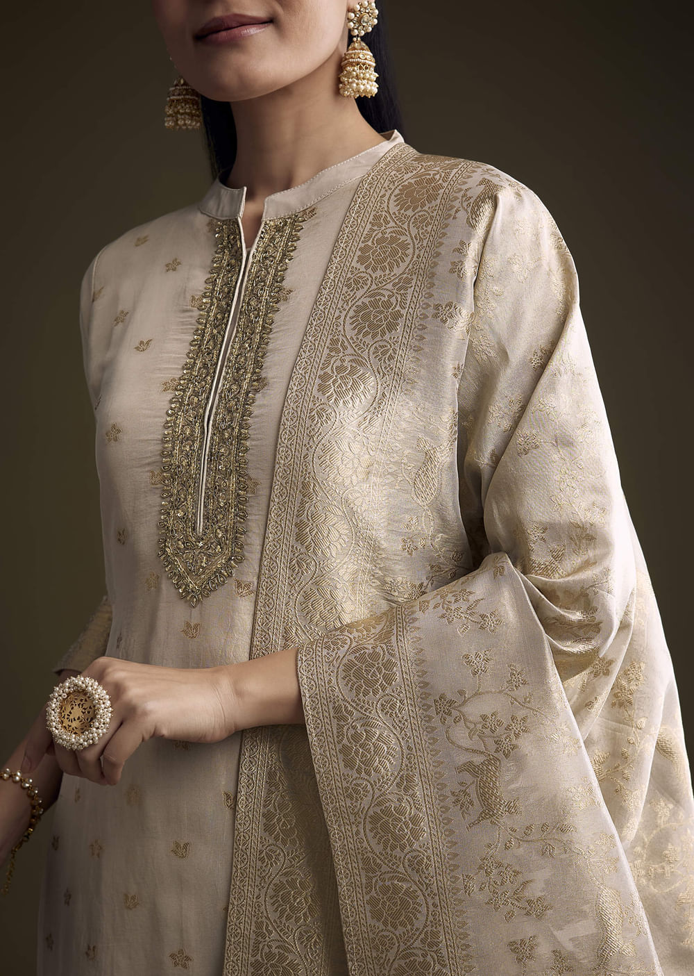 For heritage texture done lightly, this beige tissue palazzo suit lets Banarasi weave add quiet depth to a clean silhouette. The sheen catches light beautifully without weighing you down. You... More Product Details