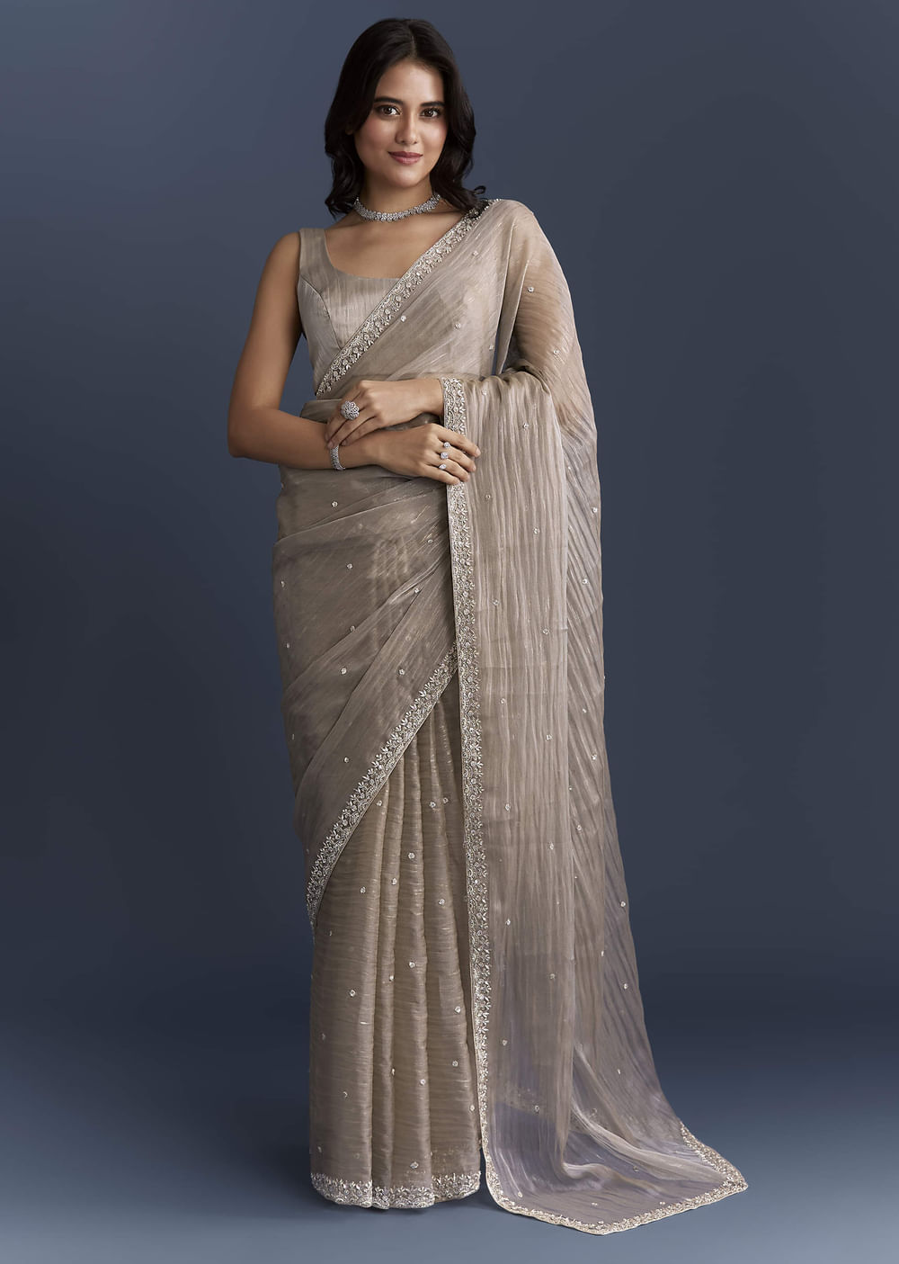 Elegant and light on the skin, this beige tissue saree offers a soft glow that photographs beautifully. Tiny sequin buttis and a worked border in cutdana and sequins bring hand-finished detail without making the drape heavy. You feel polished, effortless and perfect for reception and festive settings. Awarded as the Most Trusted Brand, we're delivering styles you love, just as promised.