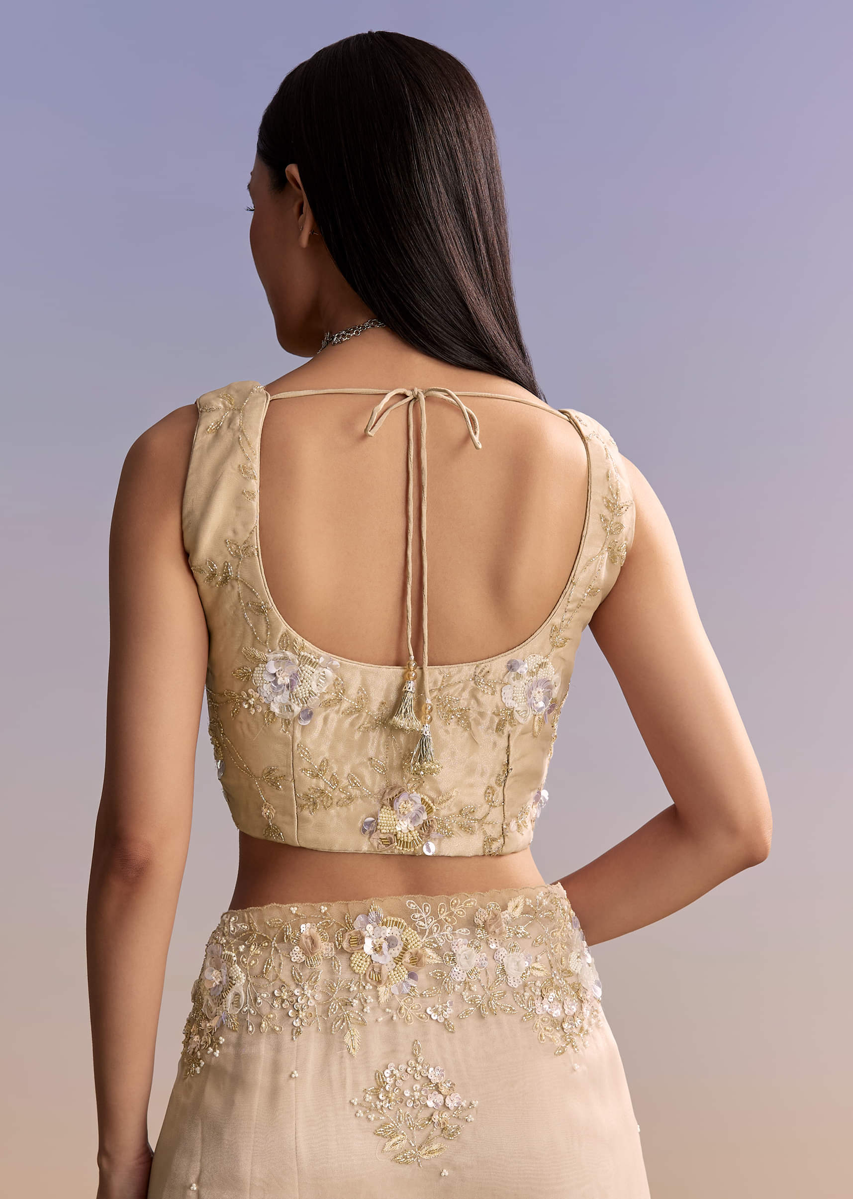 Beige Tissue Saree With Moti And Cutdana Embroidery