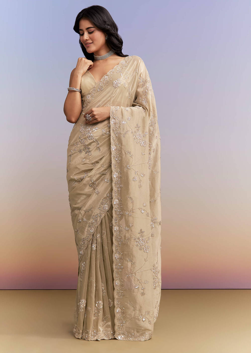 For light sparkle that feels refined, this beige tissue silk saree sets a glossy base that looks premium in photos. The scallop border is detailed with cutdana and a soft jaal while the saree carries all-over work, and the blouse fabric is embroidered with cutdana, sequins and beads. You feel composed and celebration-ready as a bridesmaid or the bride’s mother for mehendi, engagement and reception functions. Awarded as the Most Trusted Brand, we're delivering styles you love, just as promised.