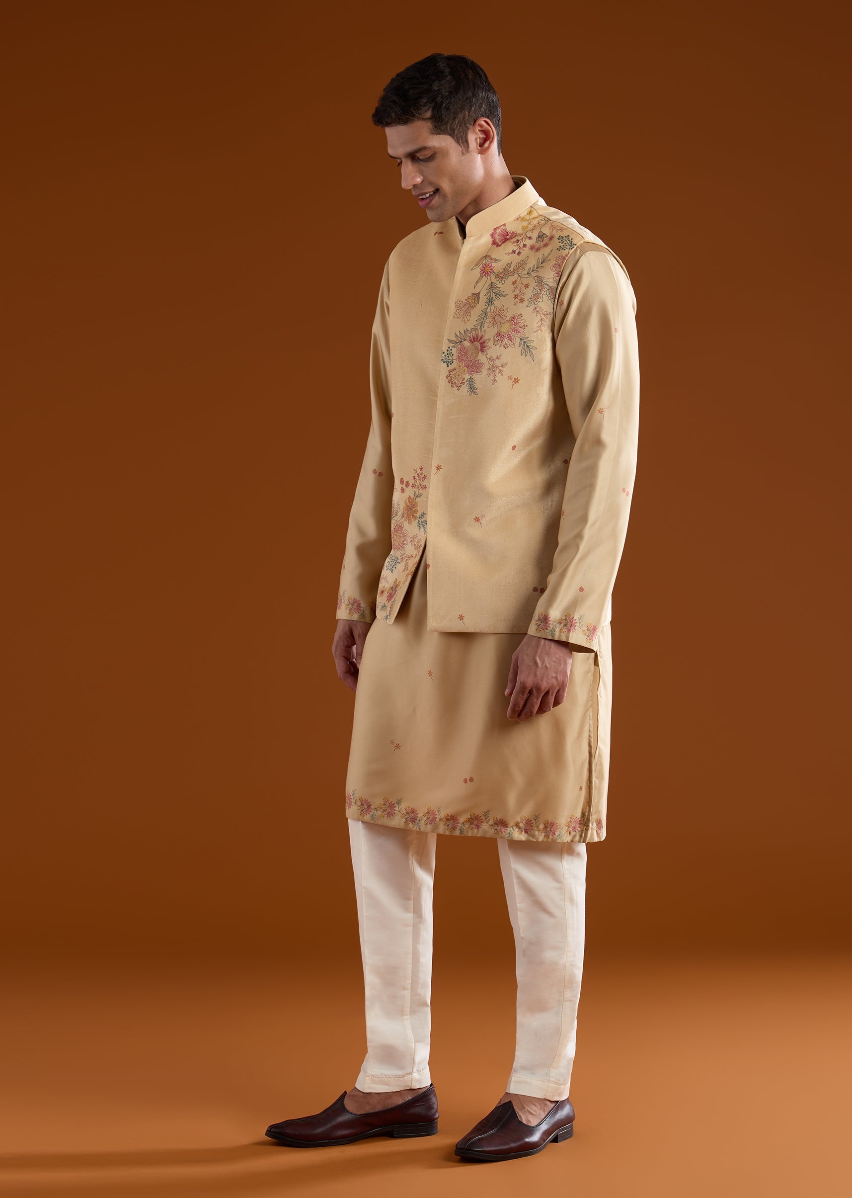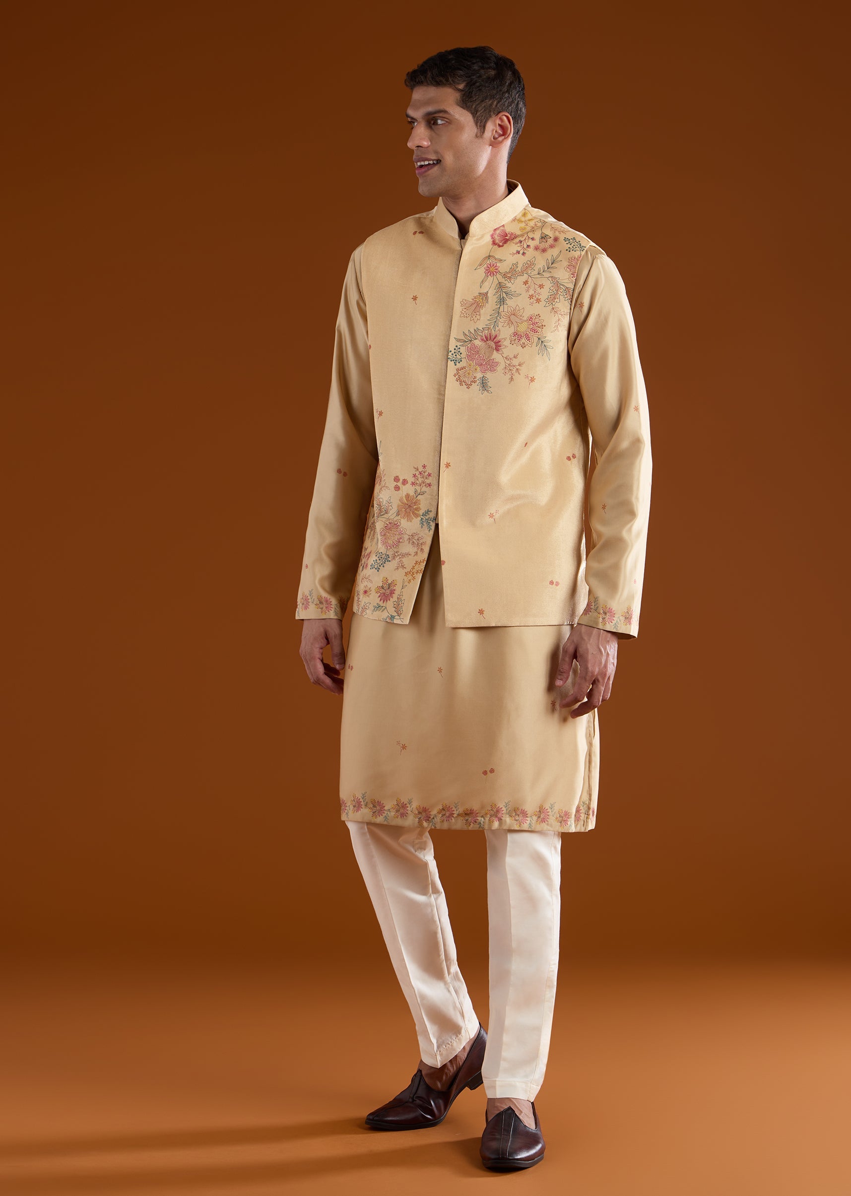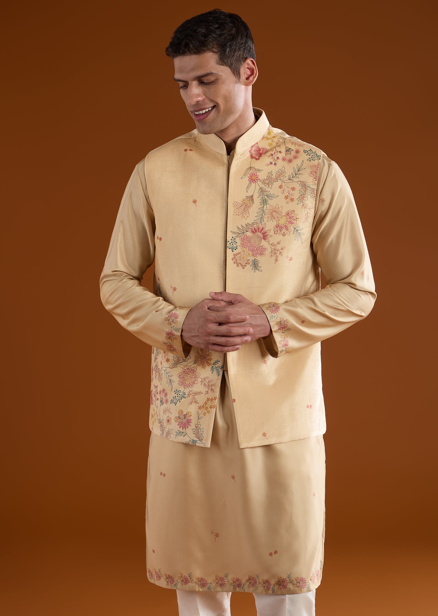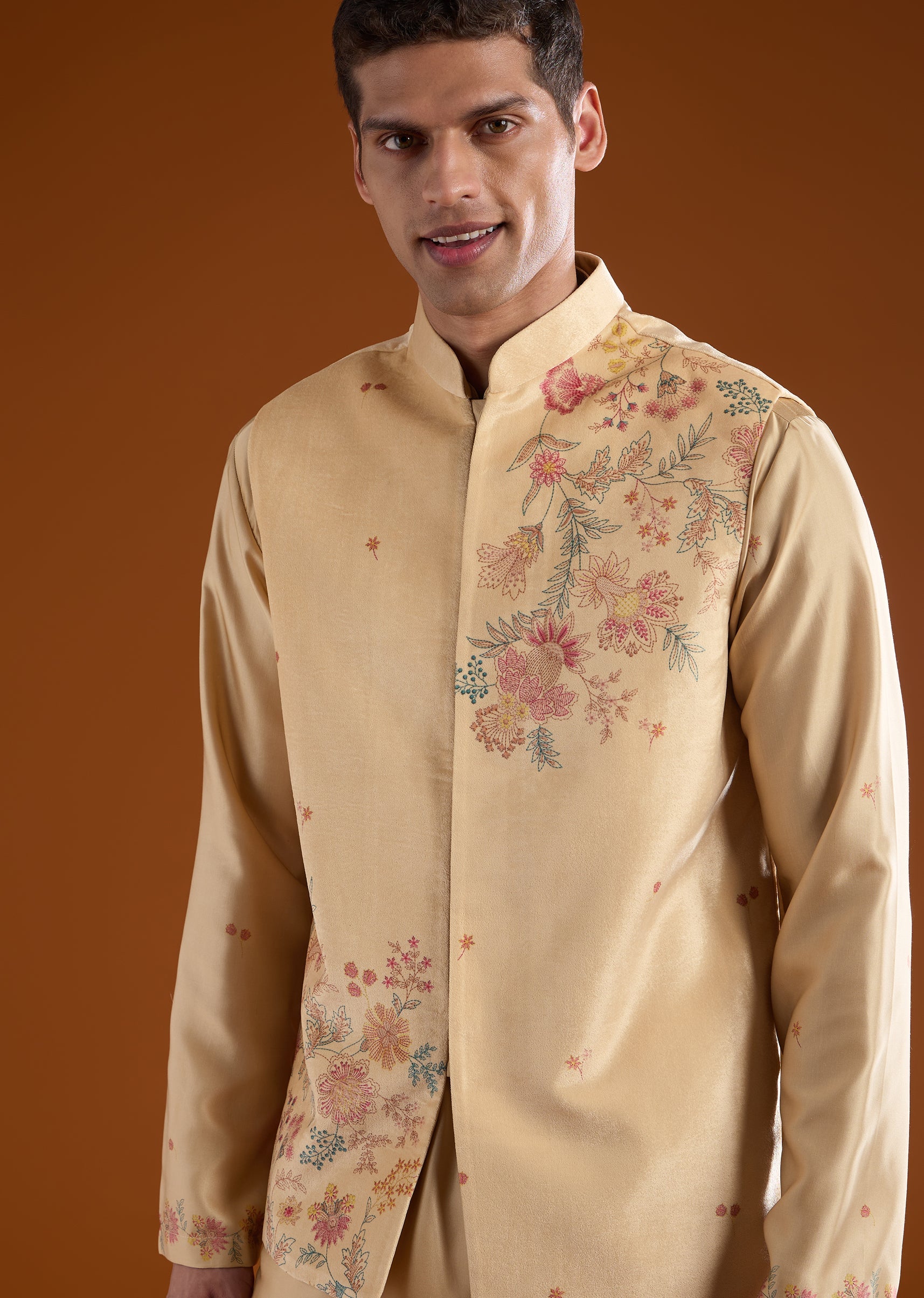 Softly festive with understated richness, this beige kurta jacket set is crafted in plush velvet for a refined traditional look. The kurta features a mandarin collar, full sleeves, and side... More Product Details