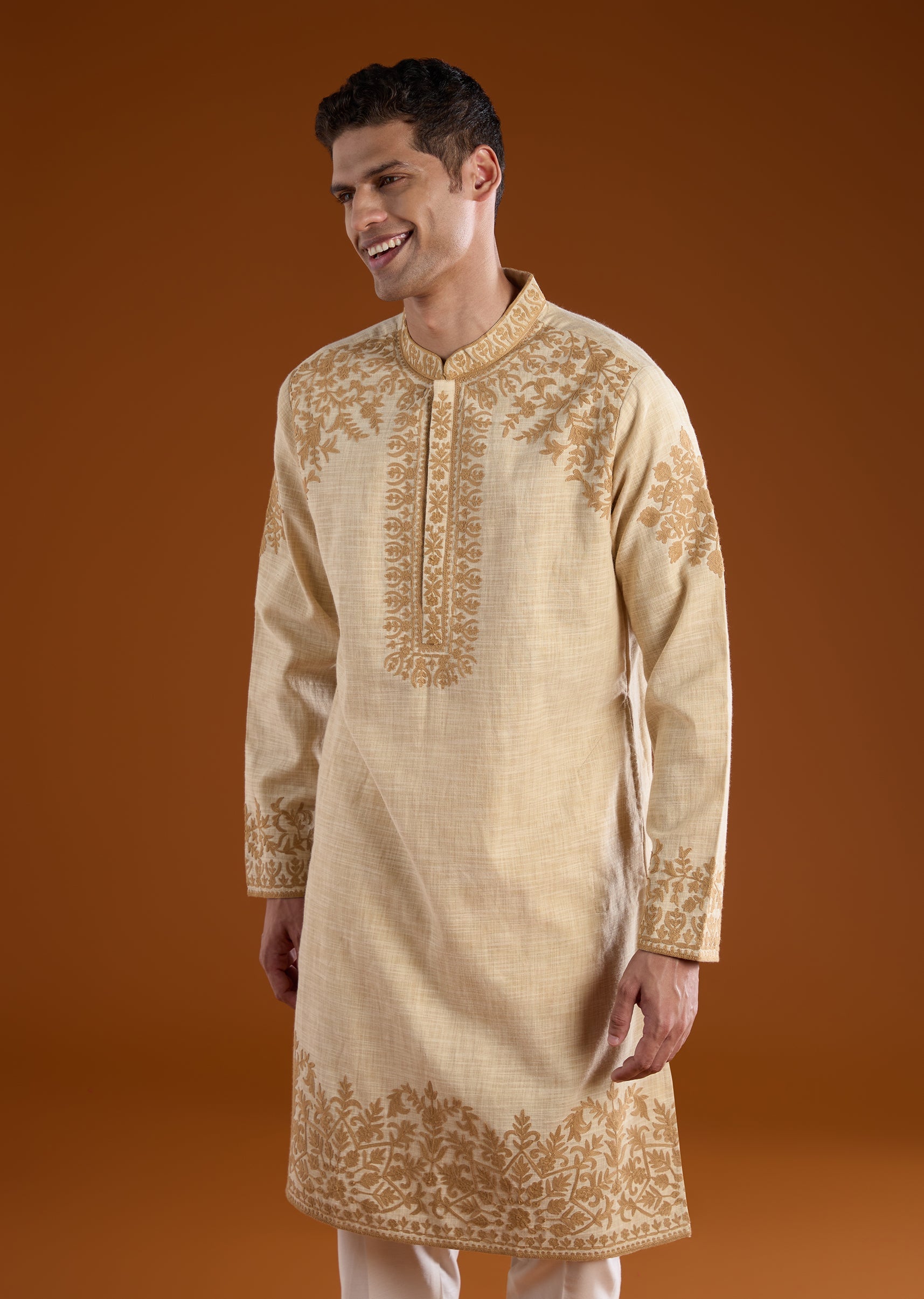 Beige Viscose Embroidered Mens Kurta Pant Set