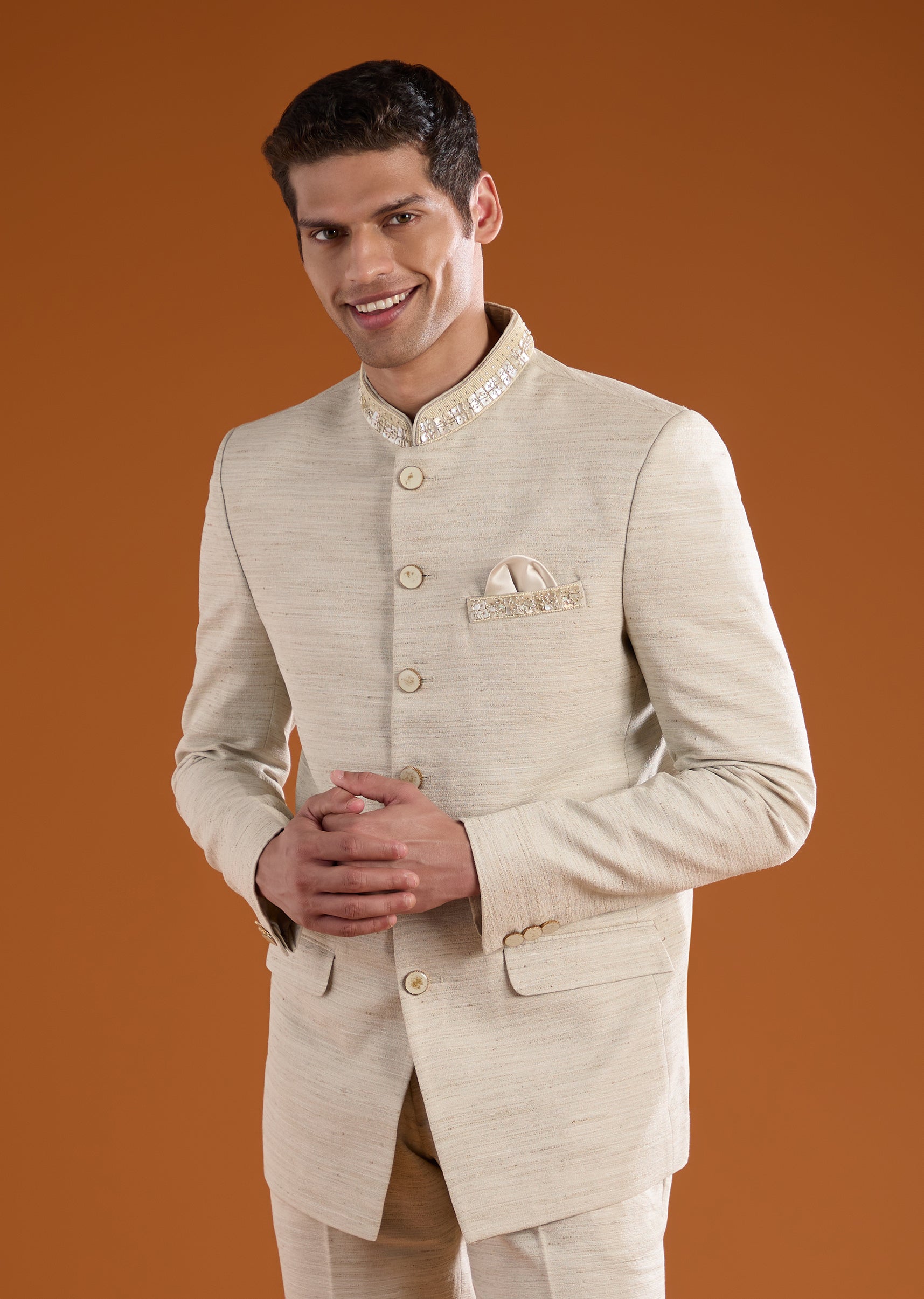Beige Viscose Jodhpuri Pant Set with Pearl Work