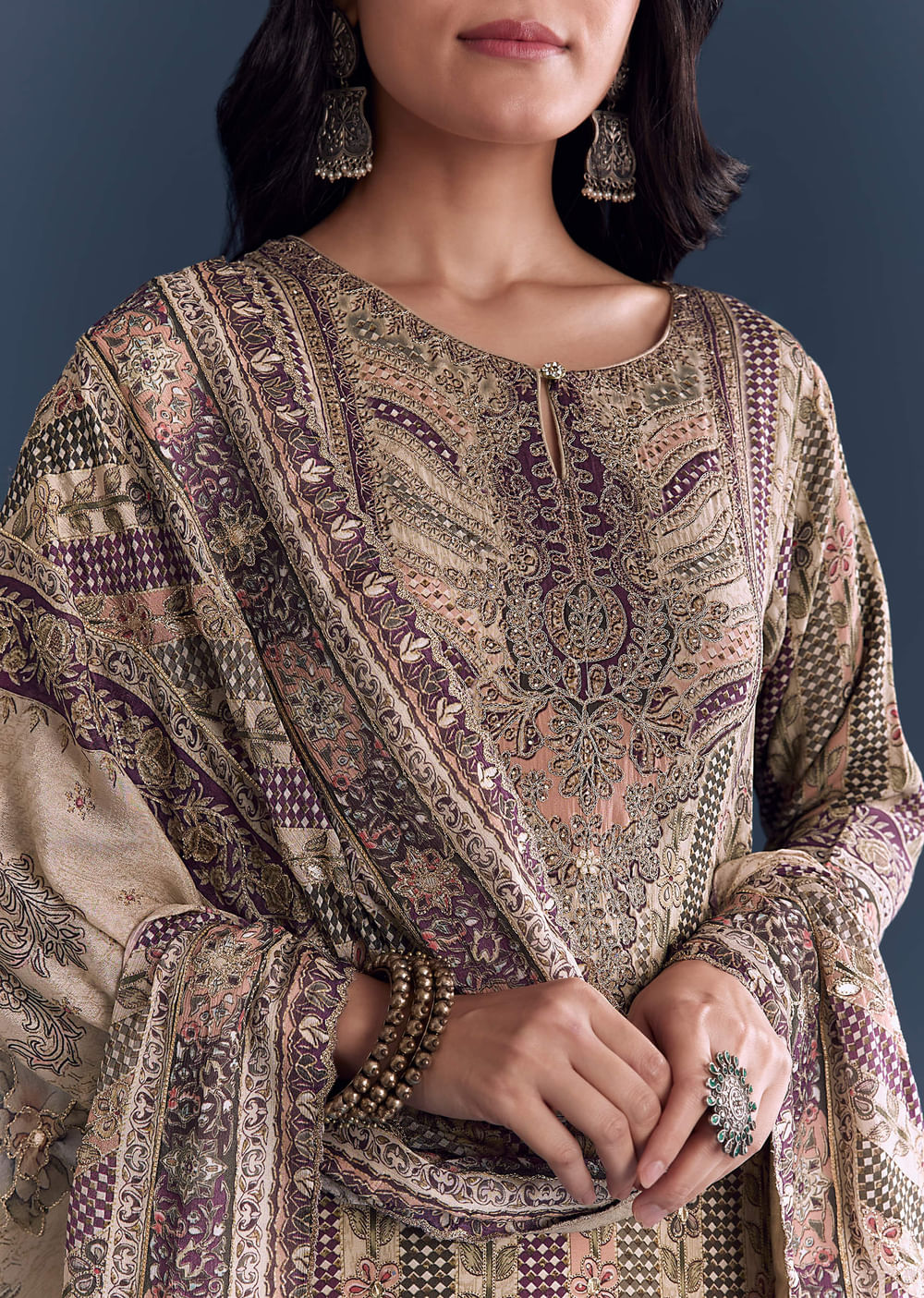When you want neutral with a statement note, this beige wine crepe kurta set balances soft base tones with floral detail. The coordinating trousers keep the outline tidy so the... More Product Details