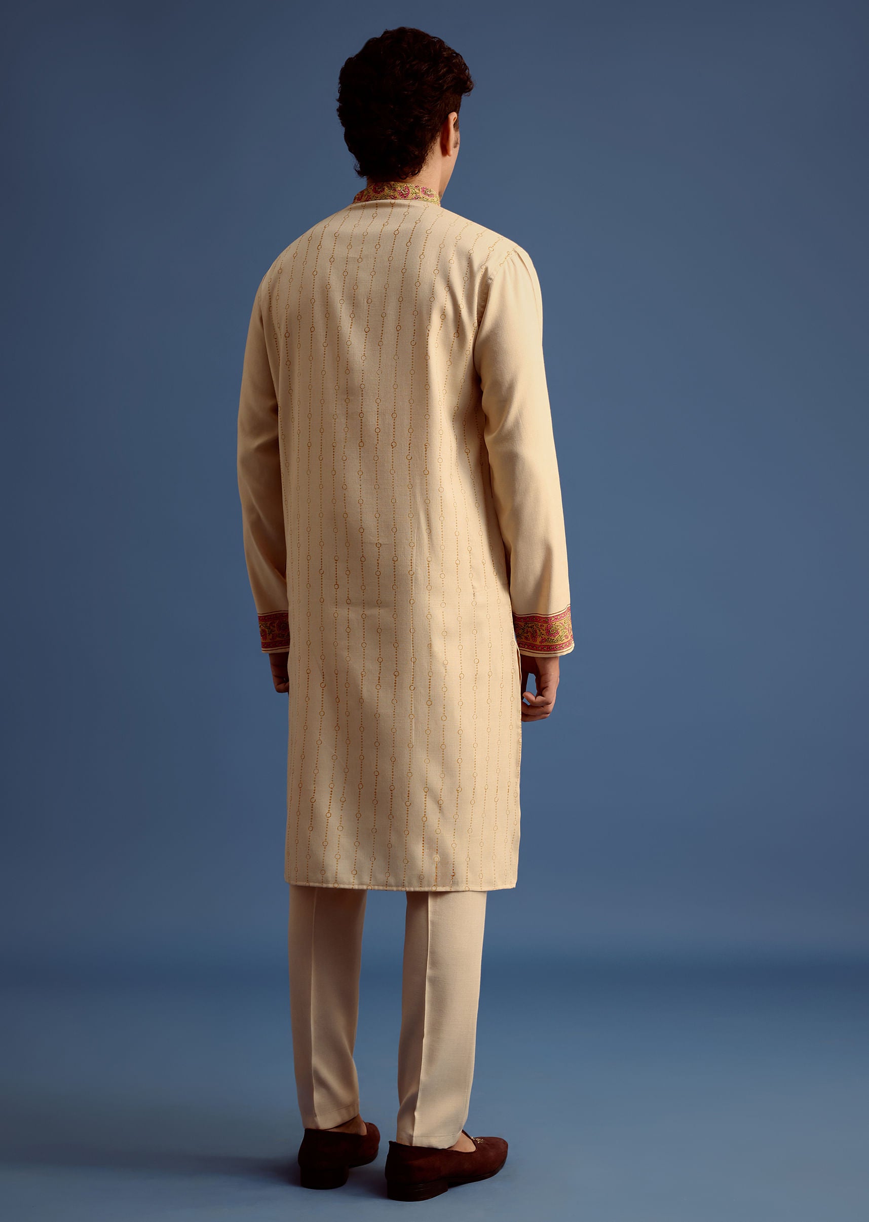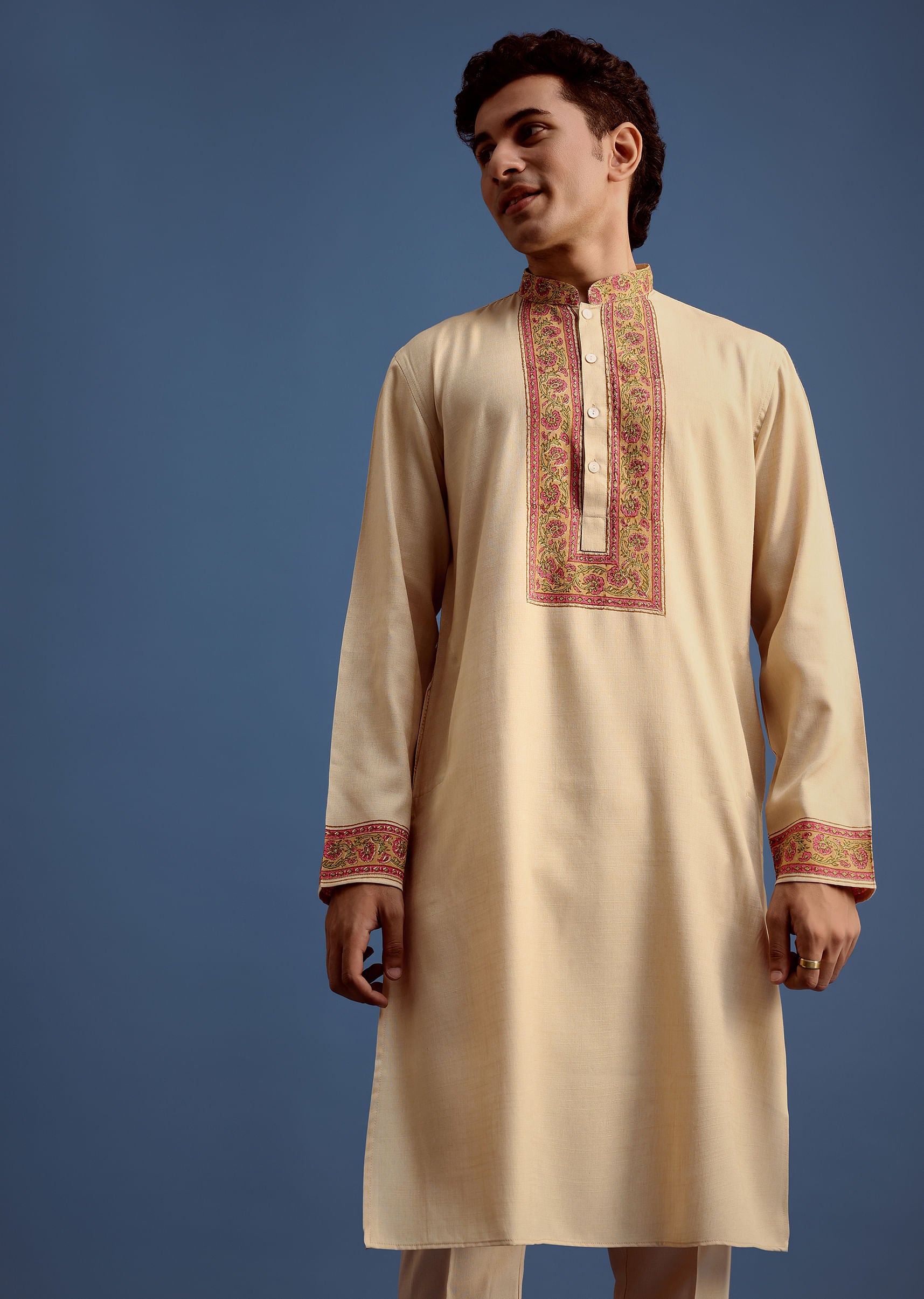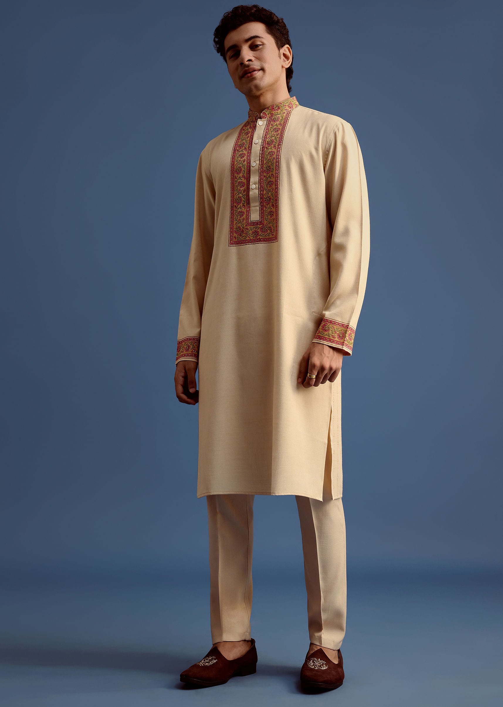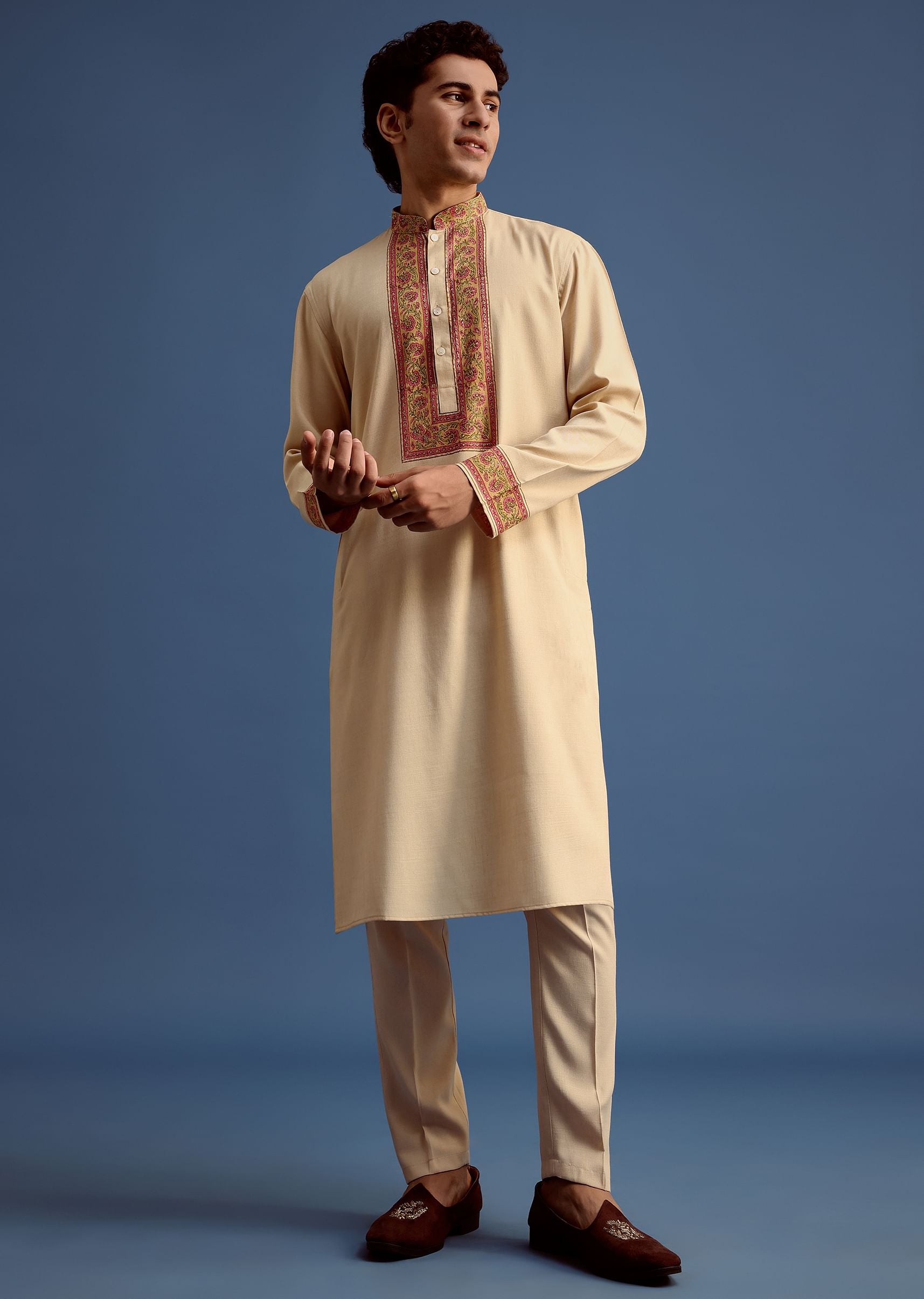 A classic and elegant ensemble, this Beige kurta set is a versatile addition to any wardrobe. Crafted with precision and attention to detail, the set features intricate zari block printing that adds a touch of opulence. Perfect for festive occasions. This kurta is paired with pants. Awarded as the Most Trusted Brand, we're delivering styles you love, just as promised.
