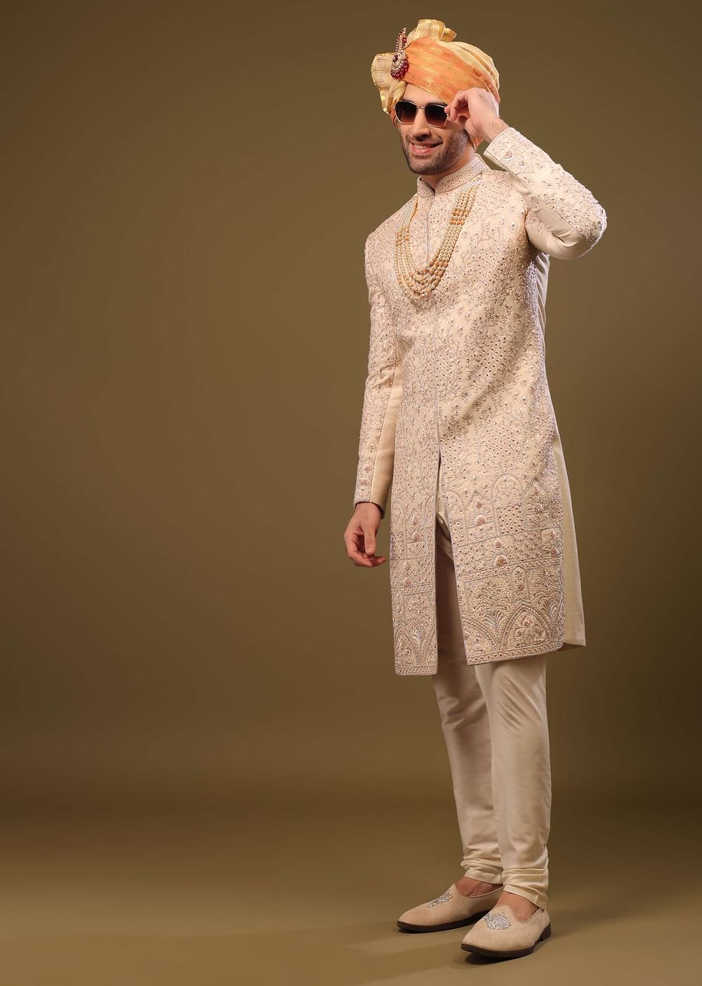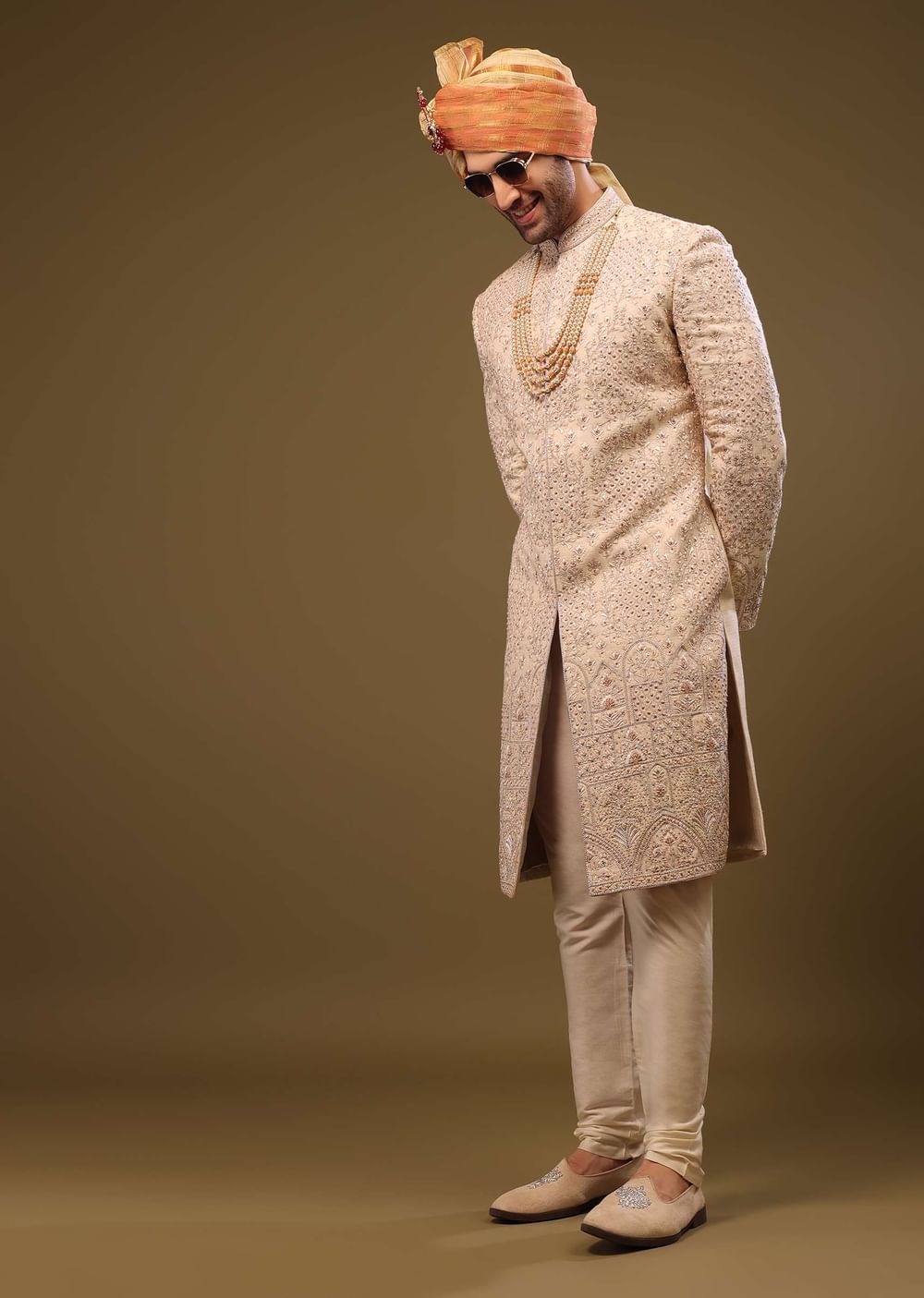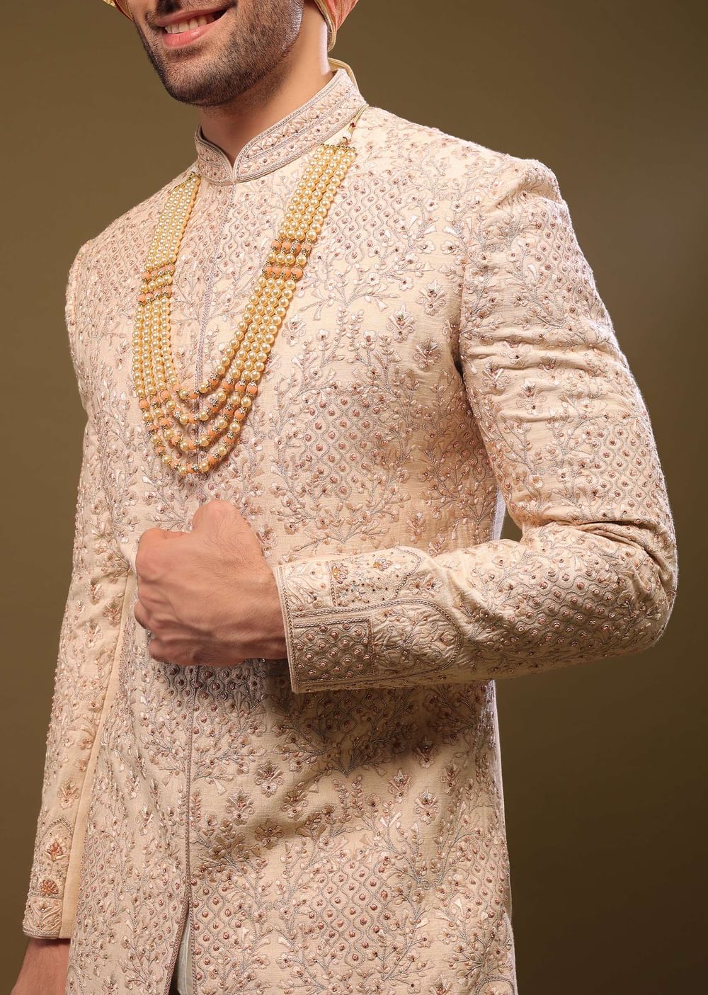 A classic bisque peach sherwani set fabricated in silk, and crafted in hand-embroidered resham, embellished stones, french knots, and thread weave in a beautiful design.It has full sleeves and an... More Product Details